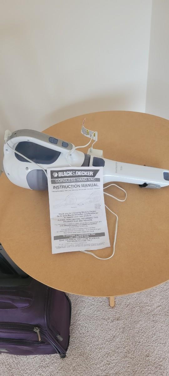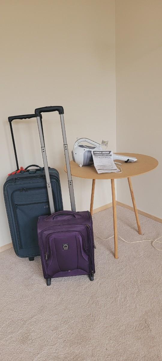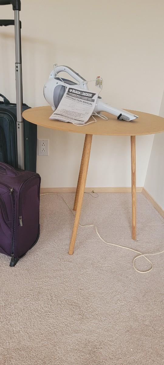 Black & Decker cordless hand vac. Two pieces of luggage. Three legged table.