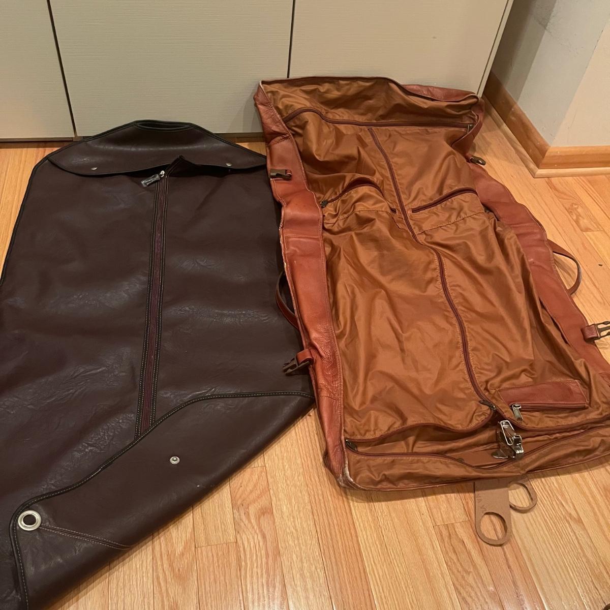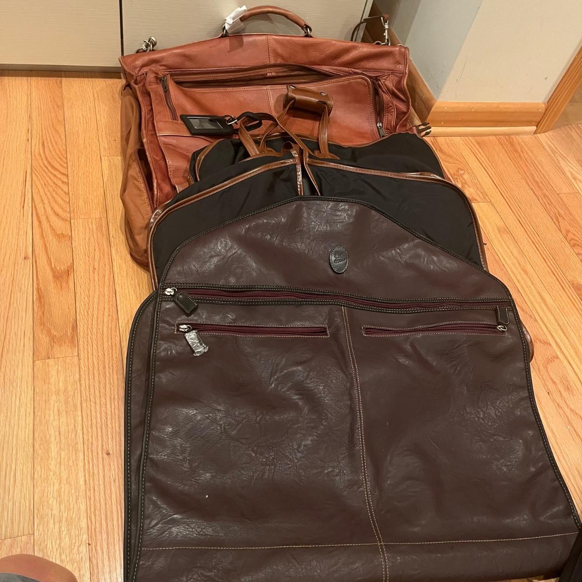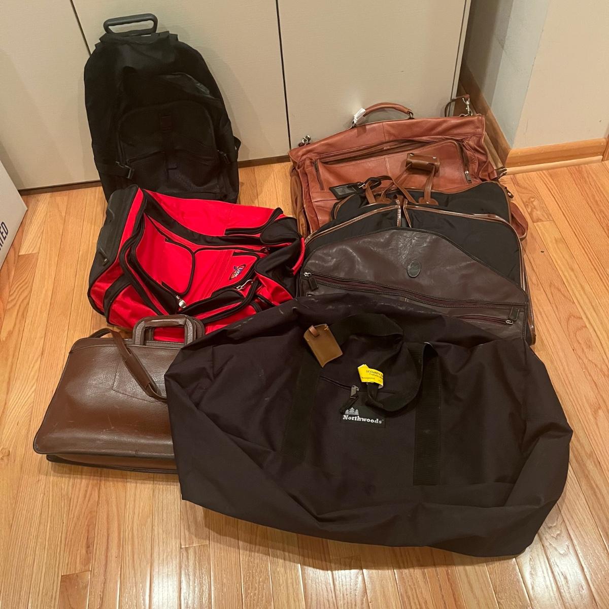 Lot includes three hanging bags, two wheeled cases , Northwood duffle bag that measures 30”. 14” x 14”. Most items are man made materials with two hanging bags that appear to be leather.