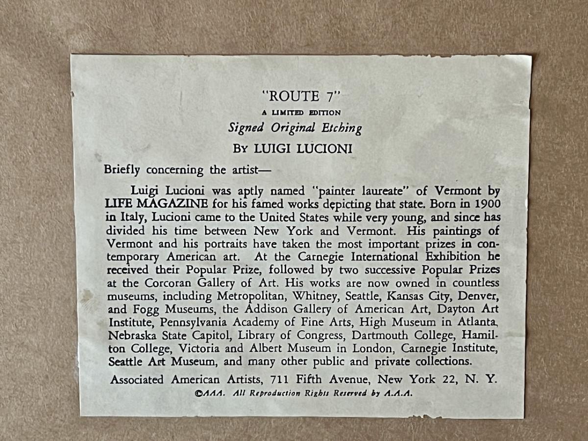 Luigi Lucioni Original Prairie Printmaker "Route 7" Etching
