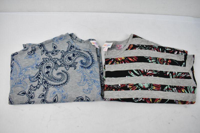 2 Women's Shirts, LuLaRoe Irma Long Tunic Style Size Small, Fits Like a Medium/Large: Gray w/ Blue paisley & Gray Floral Stripe