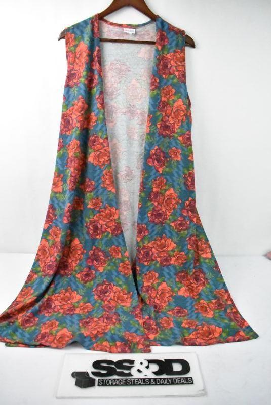 LuLaRoe "Joy" Long Duster Cardigan Vest Sz M. Blue Background, Pink/Red Flowers
