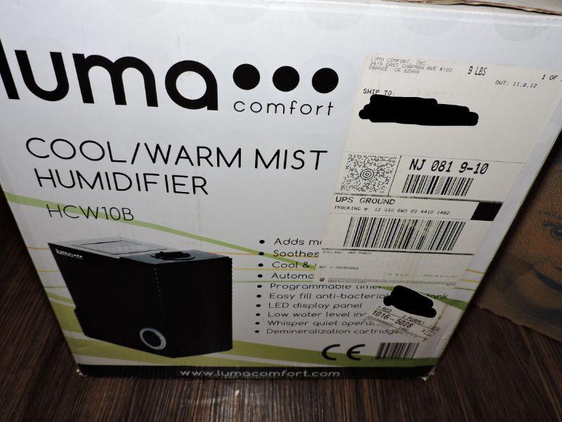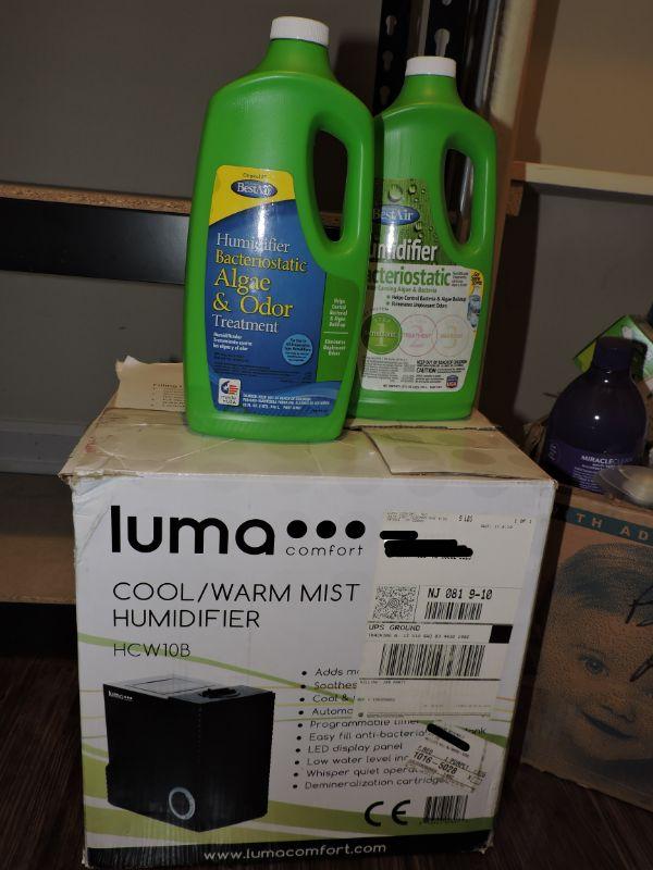 Luma Cool/Warm Mist Humidifier HCW10B and 2 partial bottles of algae & odor treatment. **Please read Terms and Conditions before placing a bid. Pick up is Thursday, August 15, 2019 from 4pm to 7pm or Sunday, August 18 from 11am-2pm in Mullica Hill. All sales are final. All sales are as is, where is. Please review all photos. Any props included in photos are not included in listing. All measurements are approximate.