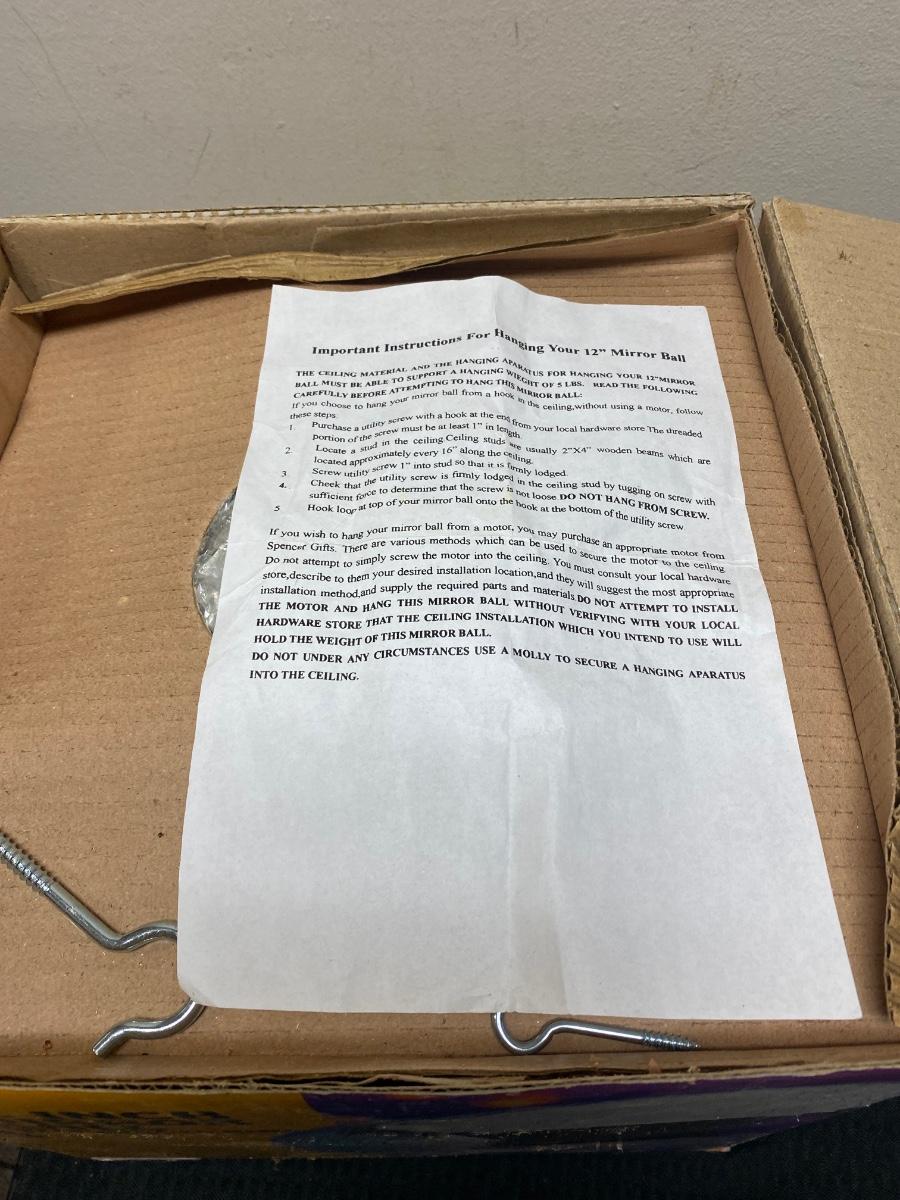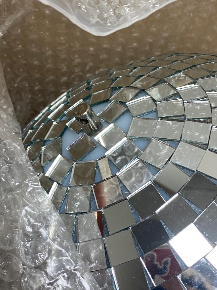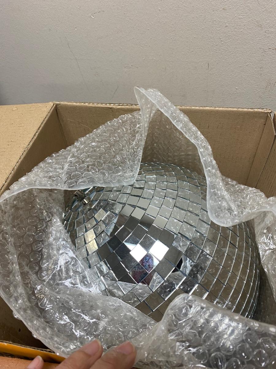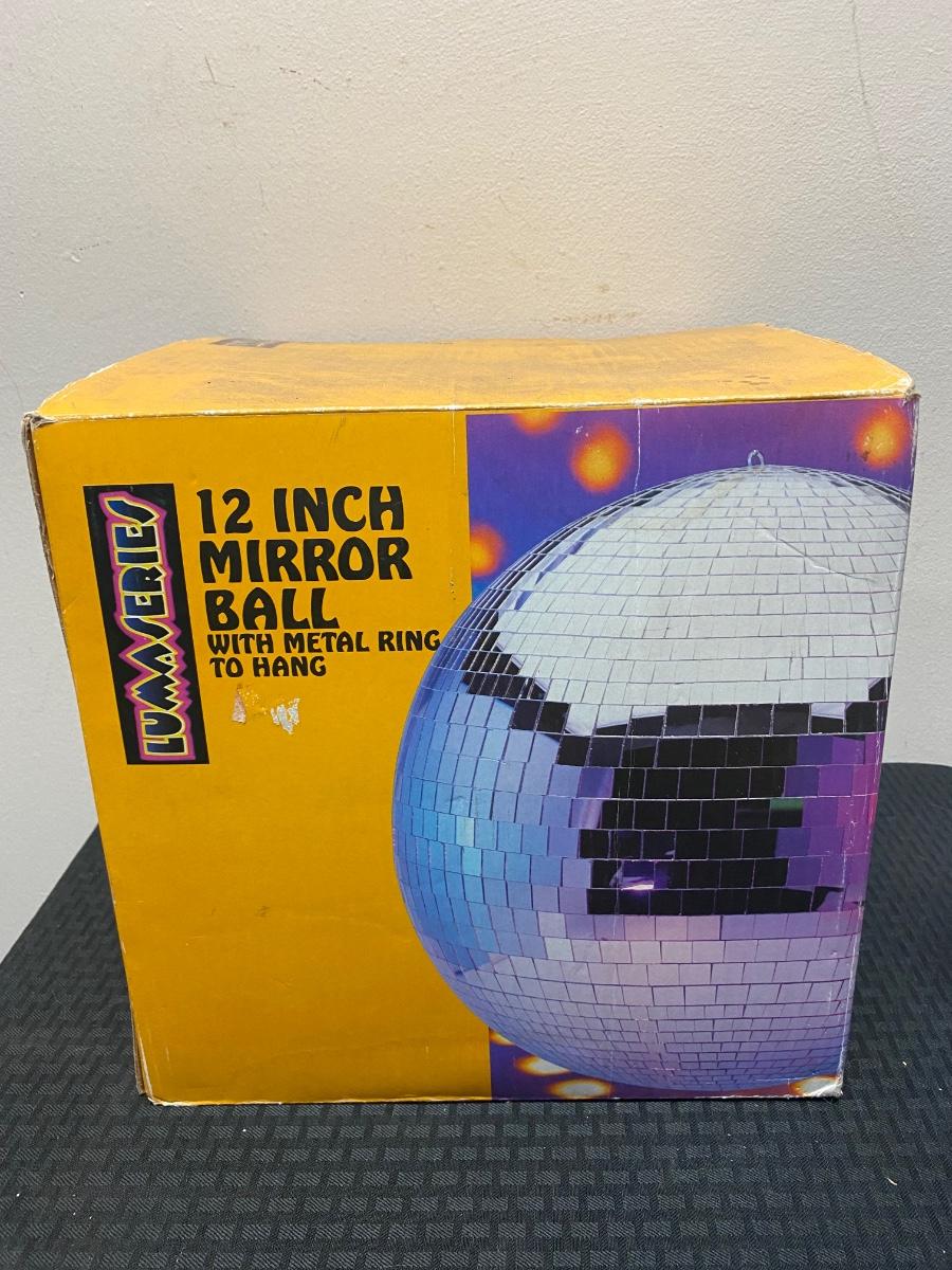 Lumaseries 12 Inch Disco Mirror Ball with Metal Ring to Hang, there is no significant damage to the mirror ball and is in good useable condition. Comes with original packaging, check pictures for more details and for sizing.
