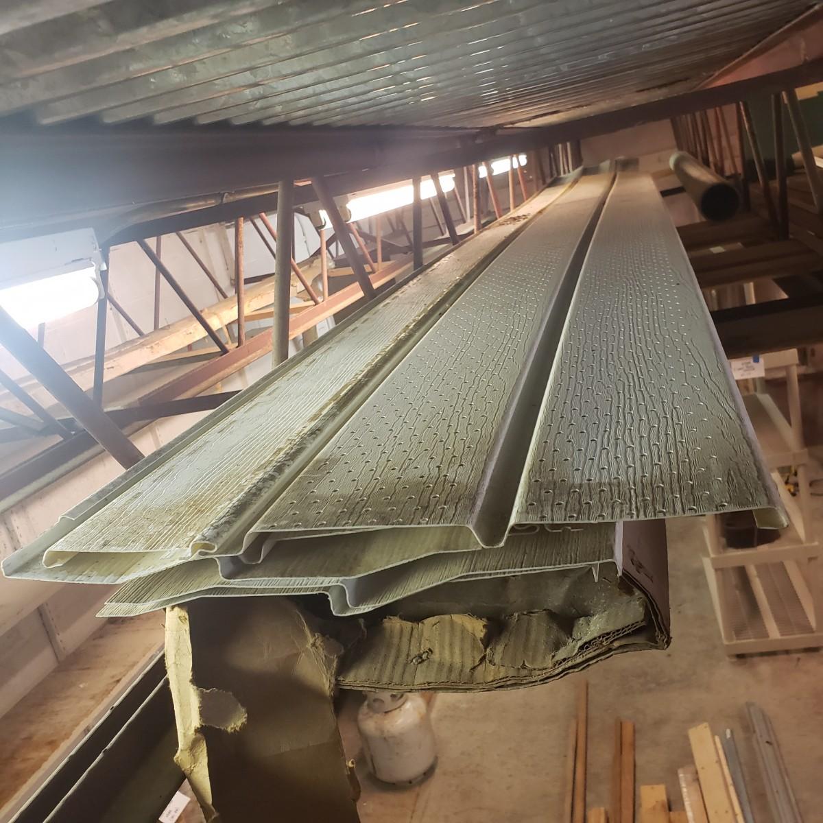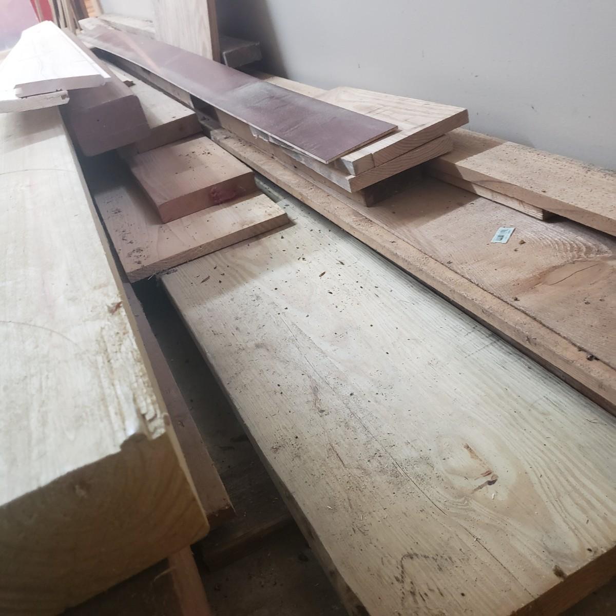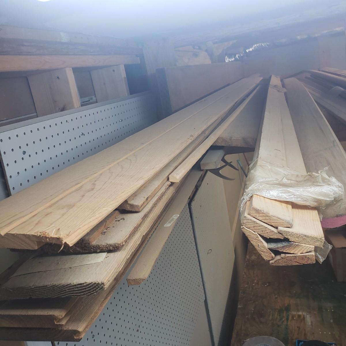 This lot has a variety of lumber and sizes. The wood is located in two different area of the house, some in rafters and a some on the ground. The winner will need to take it out of the rafters, bring help. Also included are metal pieces of Shadow Track, galvanized steel fastening system, see pictures. There is a small lot of vinyl siding also in the rafters.