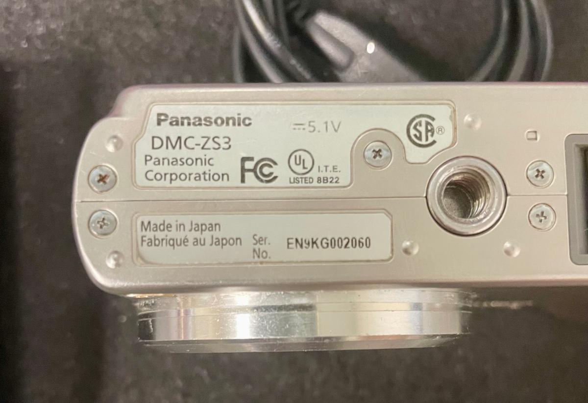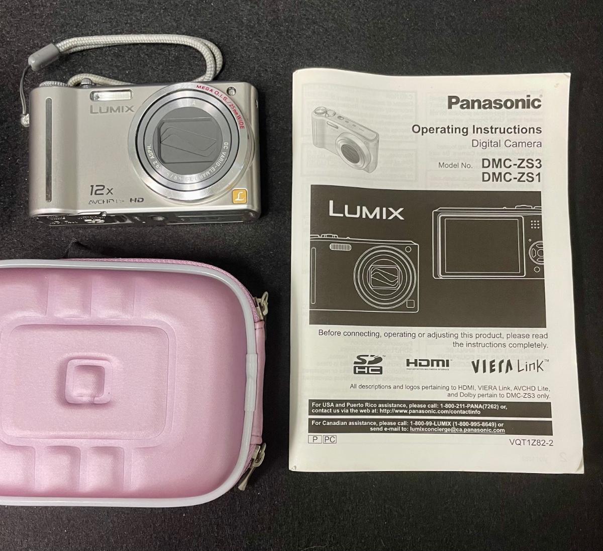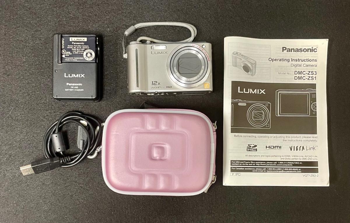 Model DMC-ZS3. Takes photos and videos. Appears to power up (see photos), but otherwise untested. Includes camera, travel case, extra battery, battery charger, camera to computer USB cable, and instruction booklet.