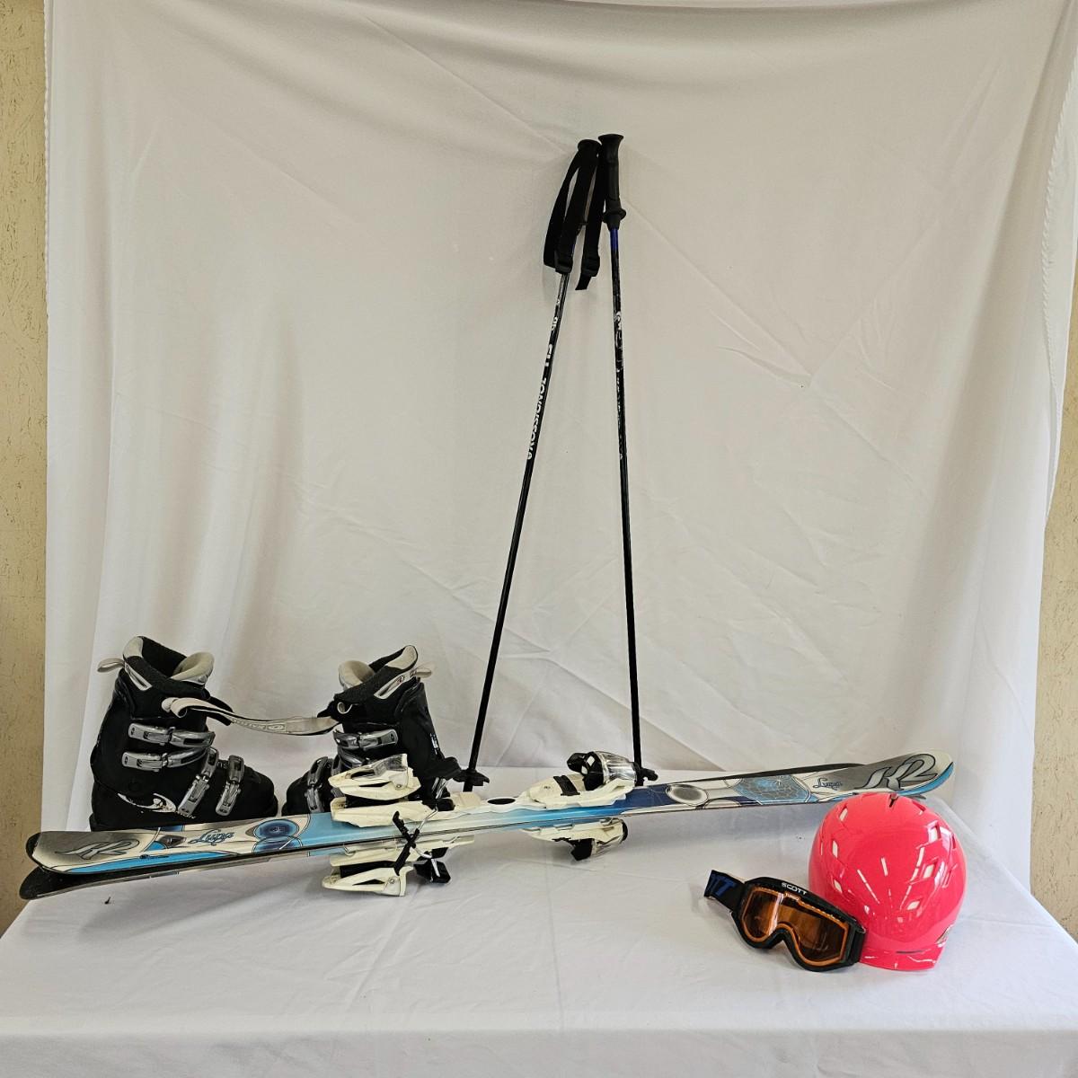 K2 Luna skis, Salomon boots and Marker bindings. Skis are 149cm, boots are EU 25.0/US 8.5. Also includes Rossignol 115 46" poles, a X Static XT2 pink helmet with carry bag, and a pair of Scott goggles. See photos for details. Local pickup only.