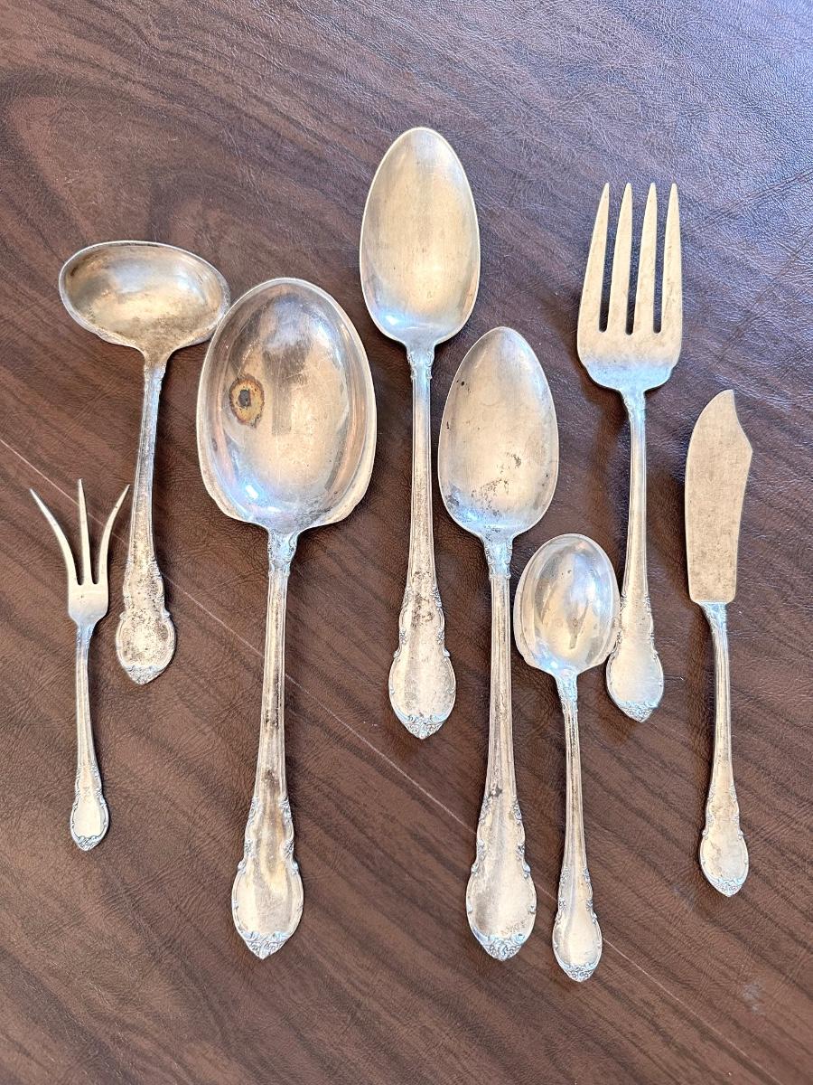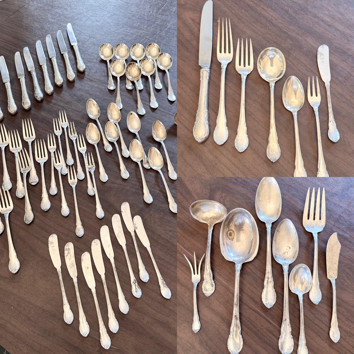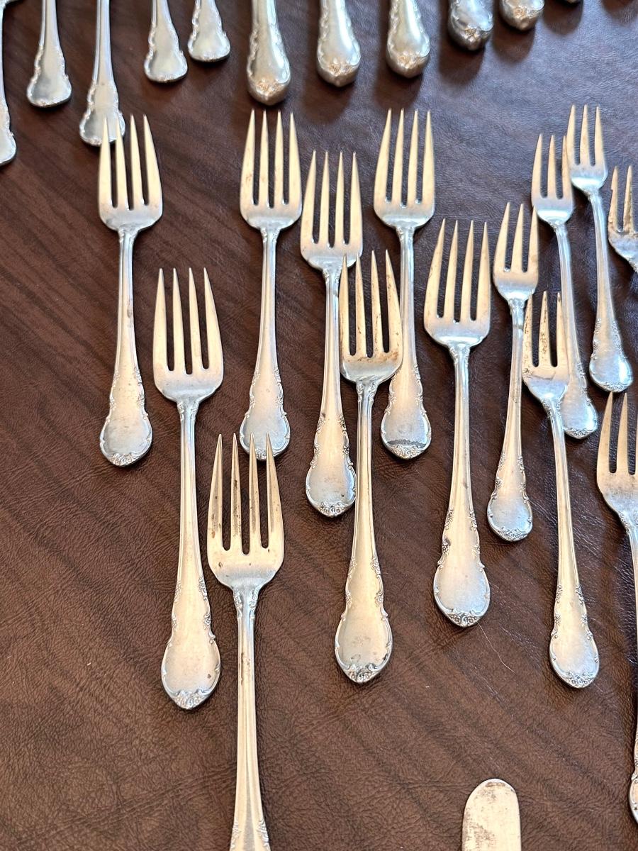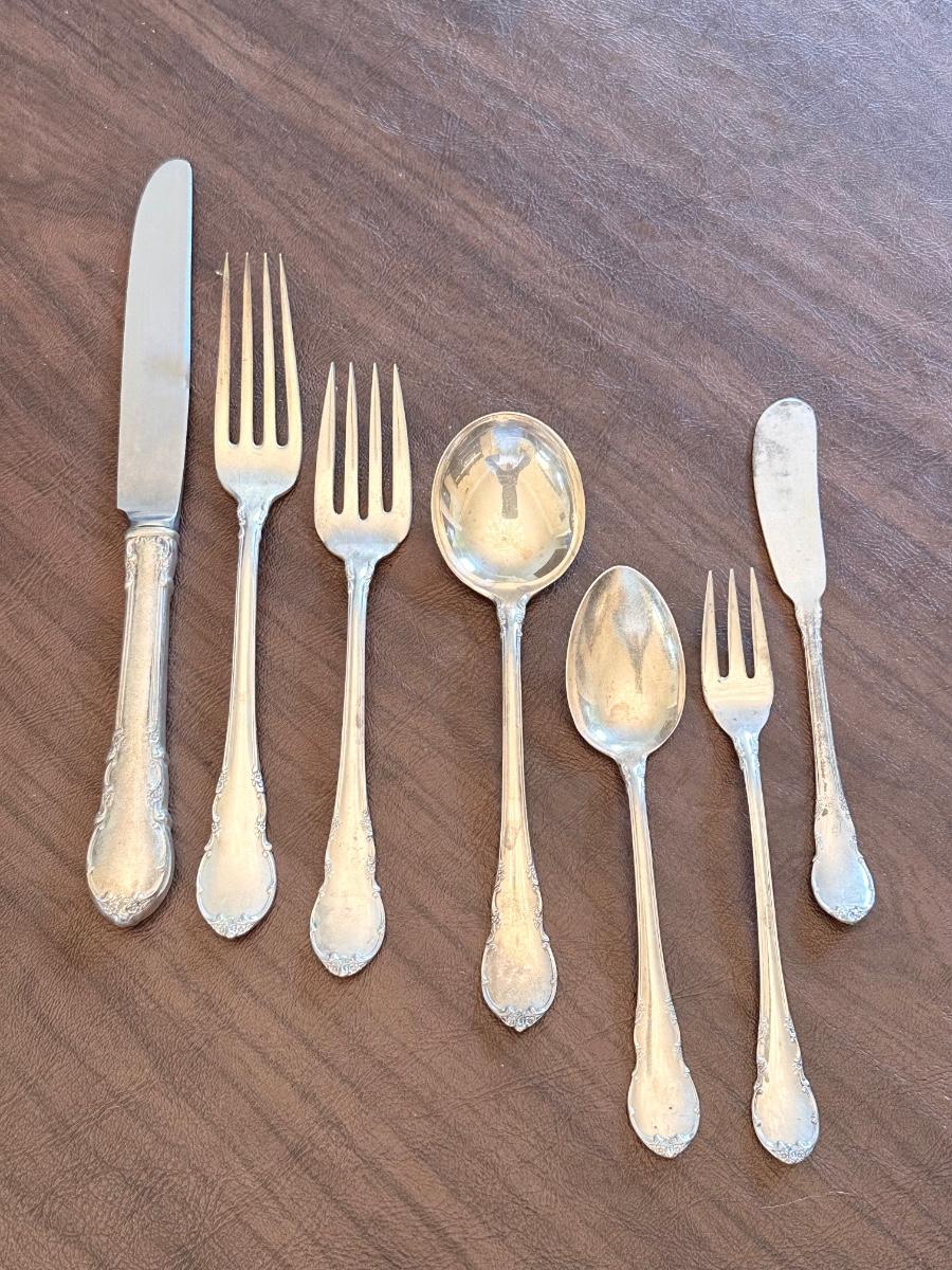 1941 ~ 63 pieces Total ~ * There are only 7 Dinner Forks ~ There are 8 pieces for each utensil. ~ Included are 8 serving pieces. ~ gram weight 1968 without dinner knives.. Will need to be polished