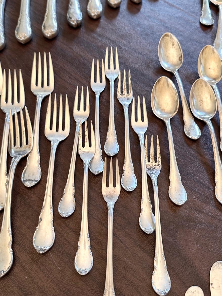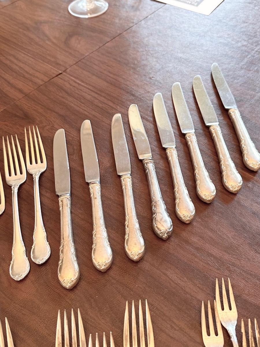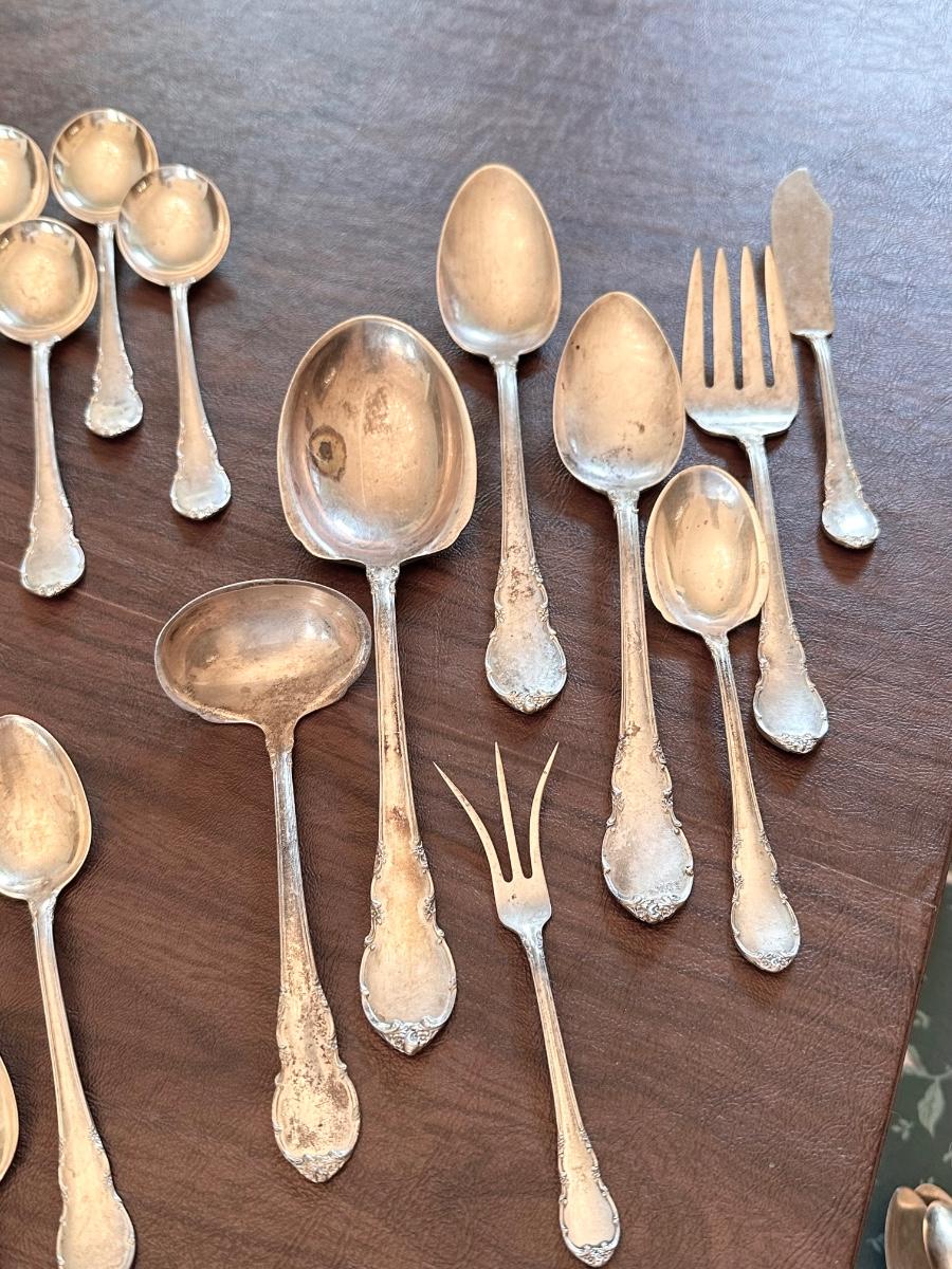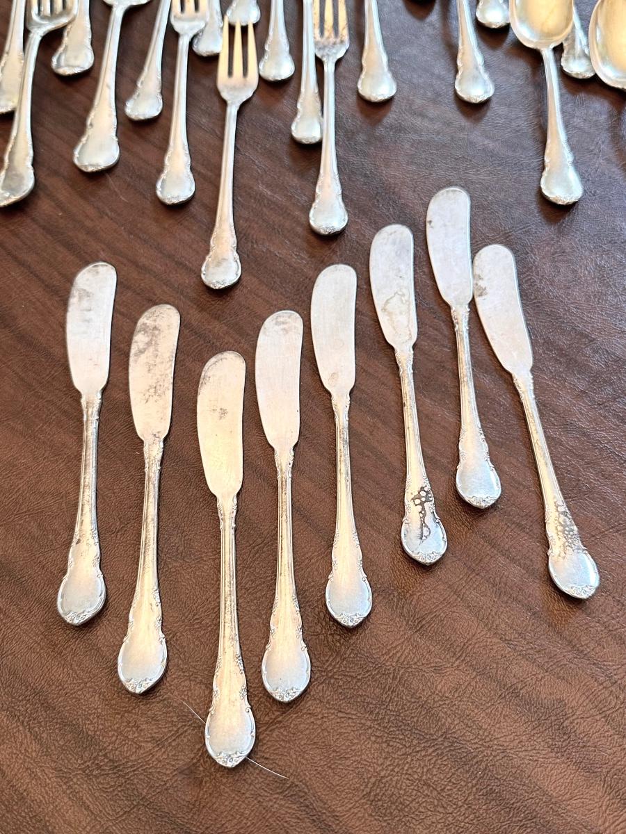 1941 ~ 63 pieces Total ~ * There are only 7 Dinner Forks ~ There are 8 pieces for each utensil. ~ Included are 8 serving pieces. ~ gram weight 1968 without dinner knives.. Will need to be polished