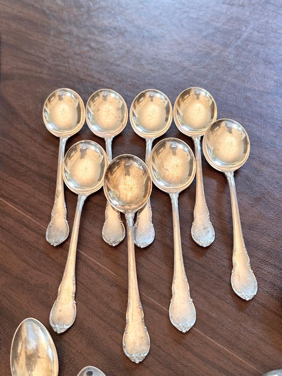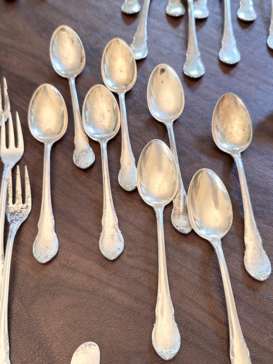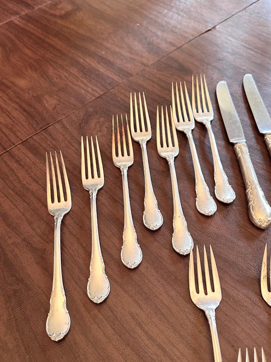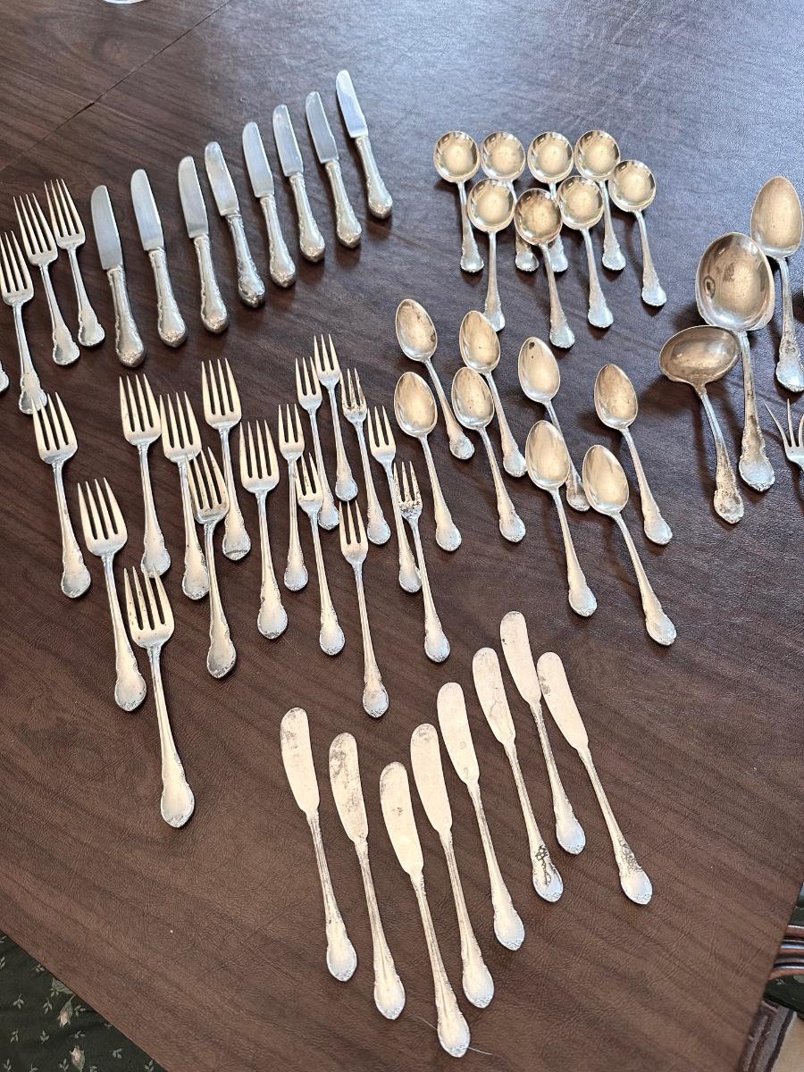 1941 ~ 63 pieces Total ~ * There are only 7 Dinner Forks ~ There are 8 pieces for each utensil. ~ Included are 8 serving pieces. ~ gram weight 1968 without dinner knives.. Will need to be polished