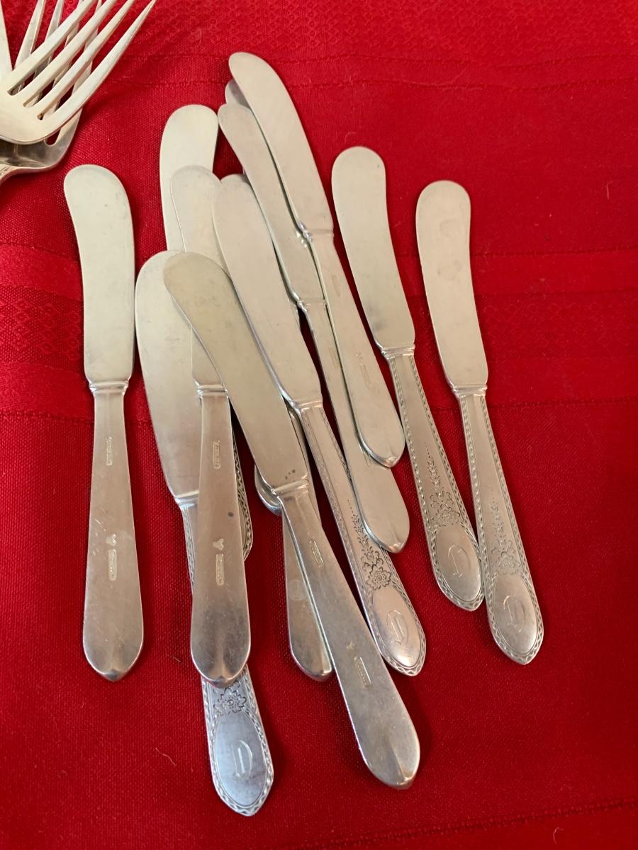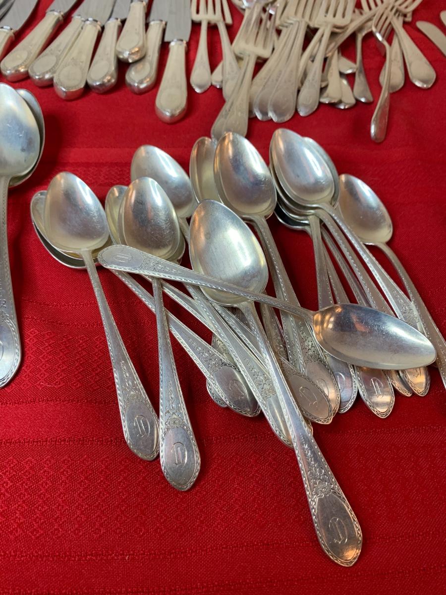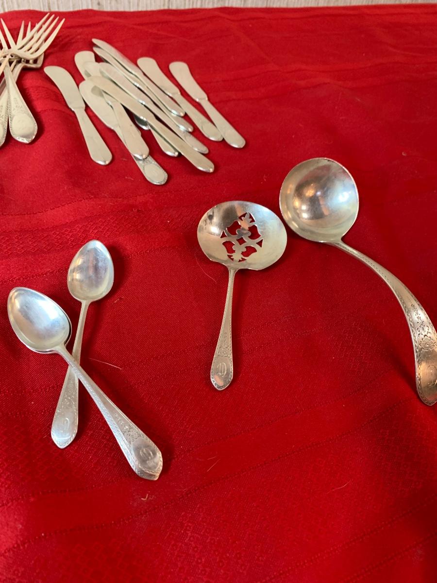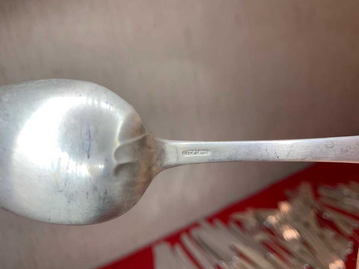 Lunt Sterling Silver “Treasure” set. 82 pieces. Monogrammed with a “D”. In fair condition, some patina.