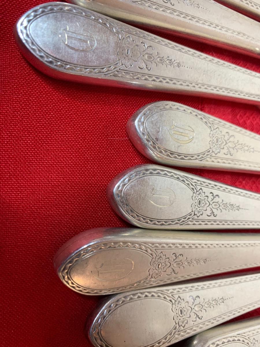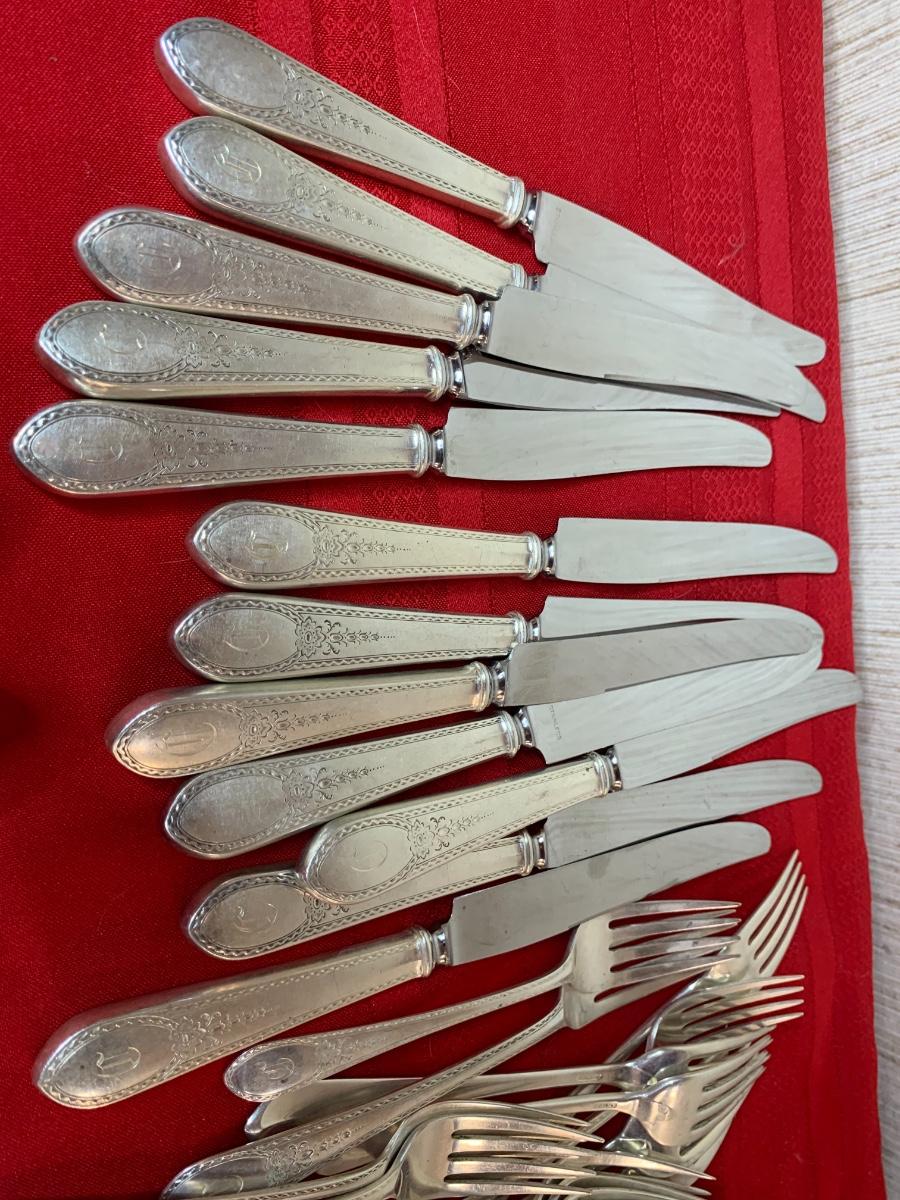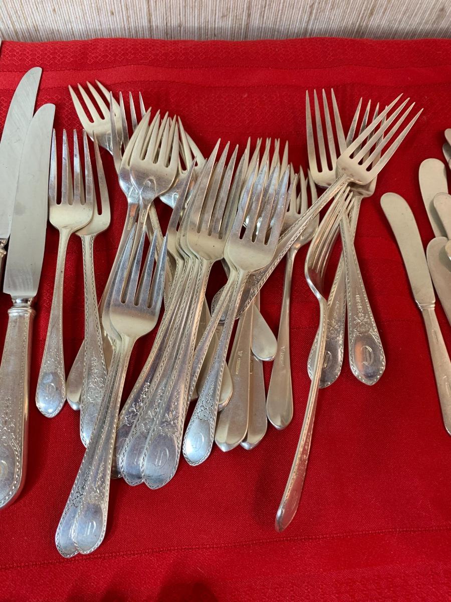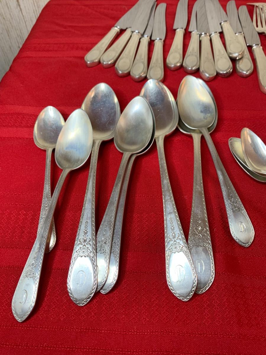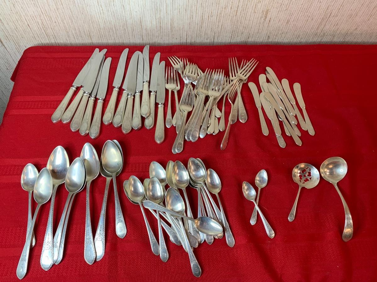 Lunt Sterling Silver “Treasure” set. 82 pieces. Monogrammed with a “D”. In fair condition, some patina.