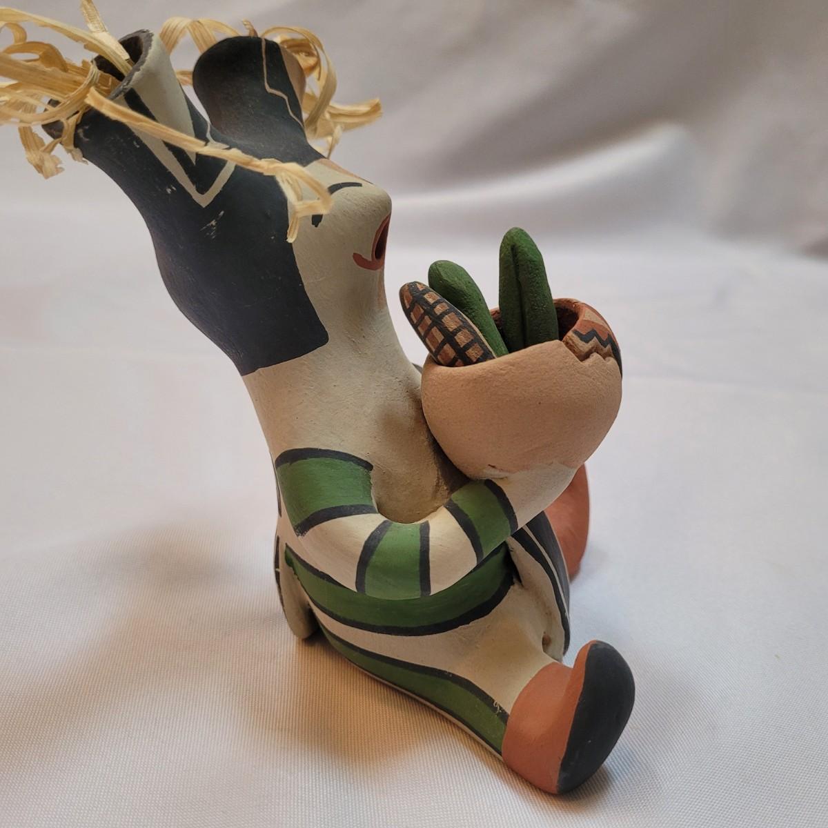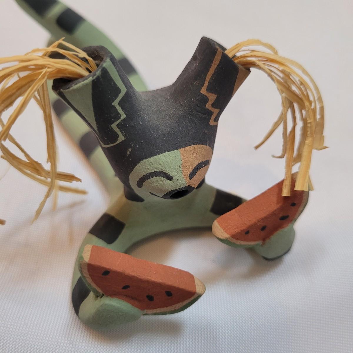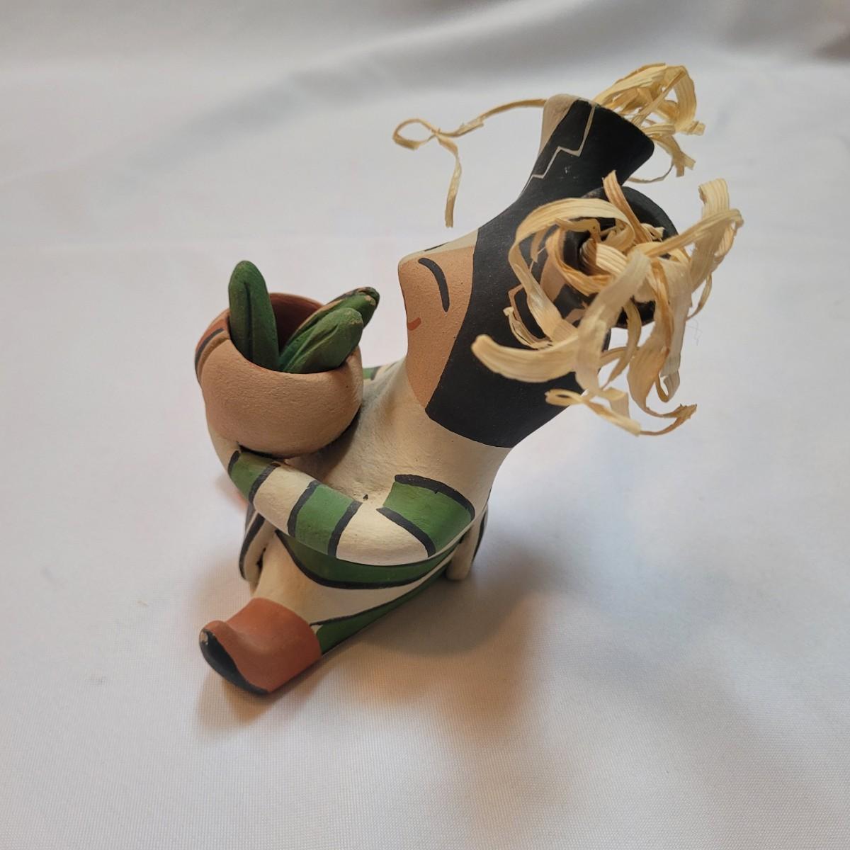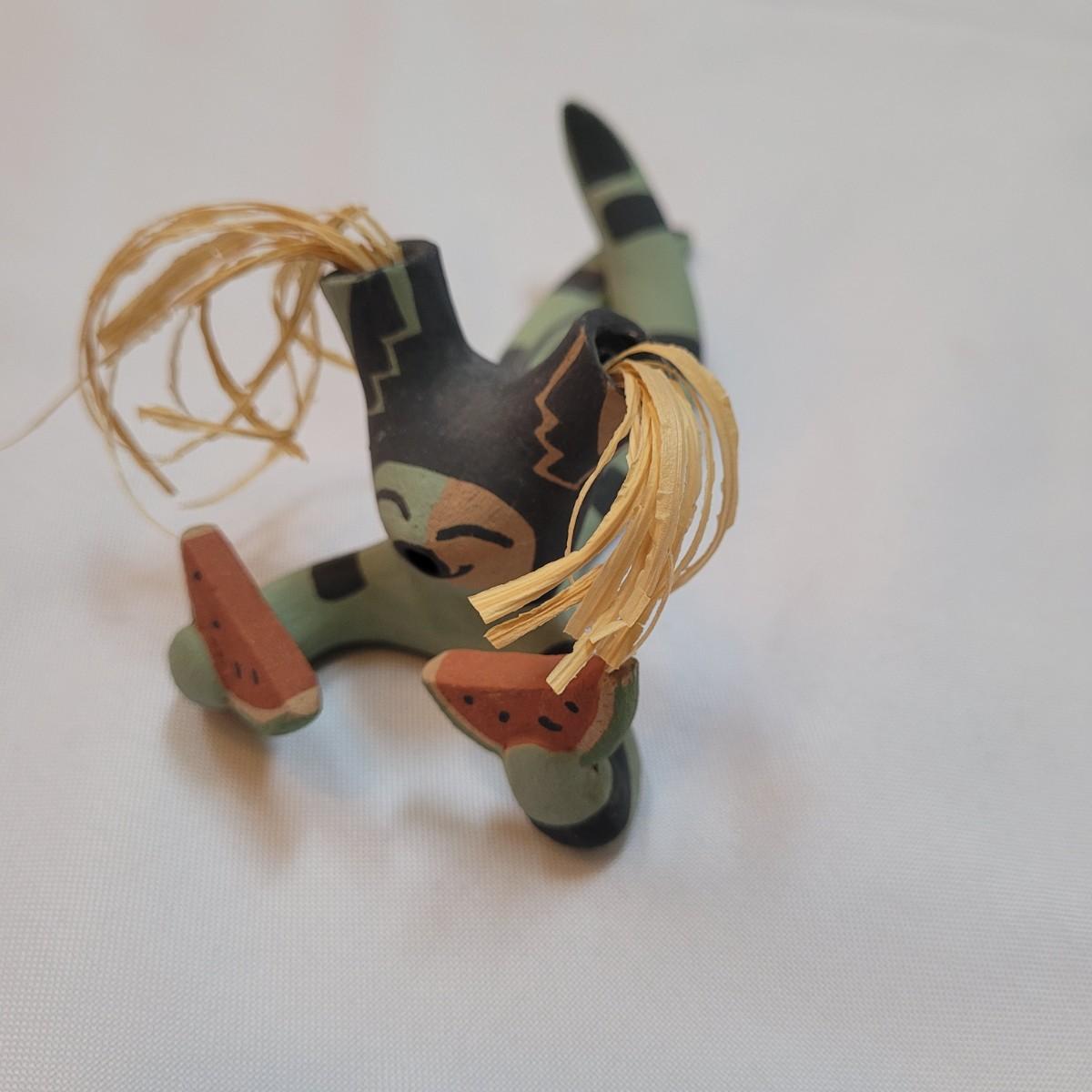 One figure is holding a bowl with ears of corn in it. The other figure is laying down holding watermelon slices. Both are handmade and hand painted. Each has ears made from stringy plant material. Both are signed on the bottom. The larger figurine measures 4" x 3" x 6"H.