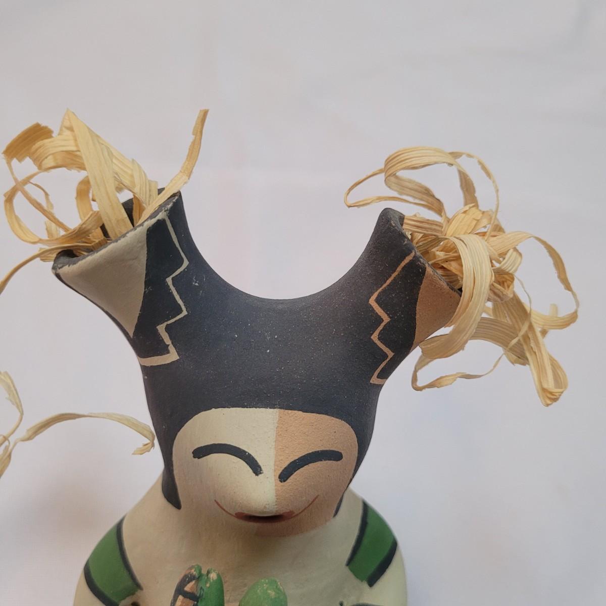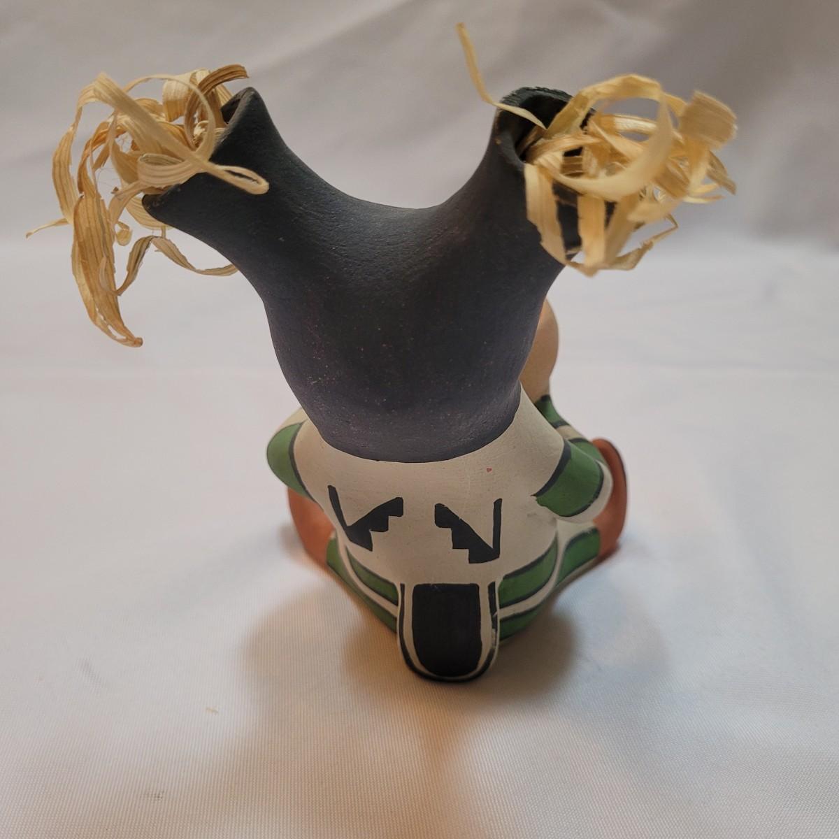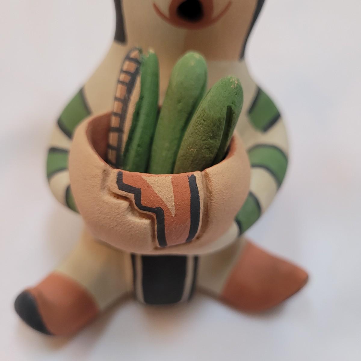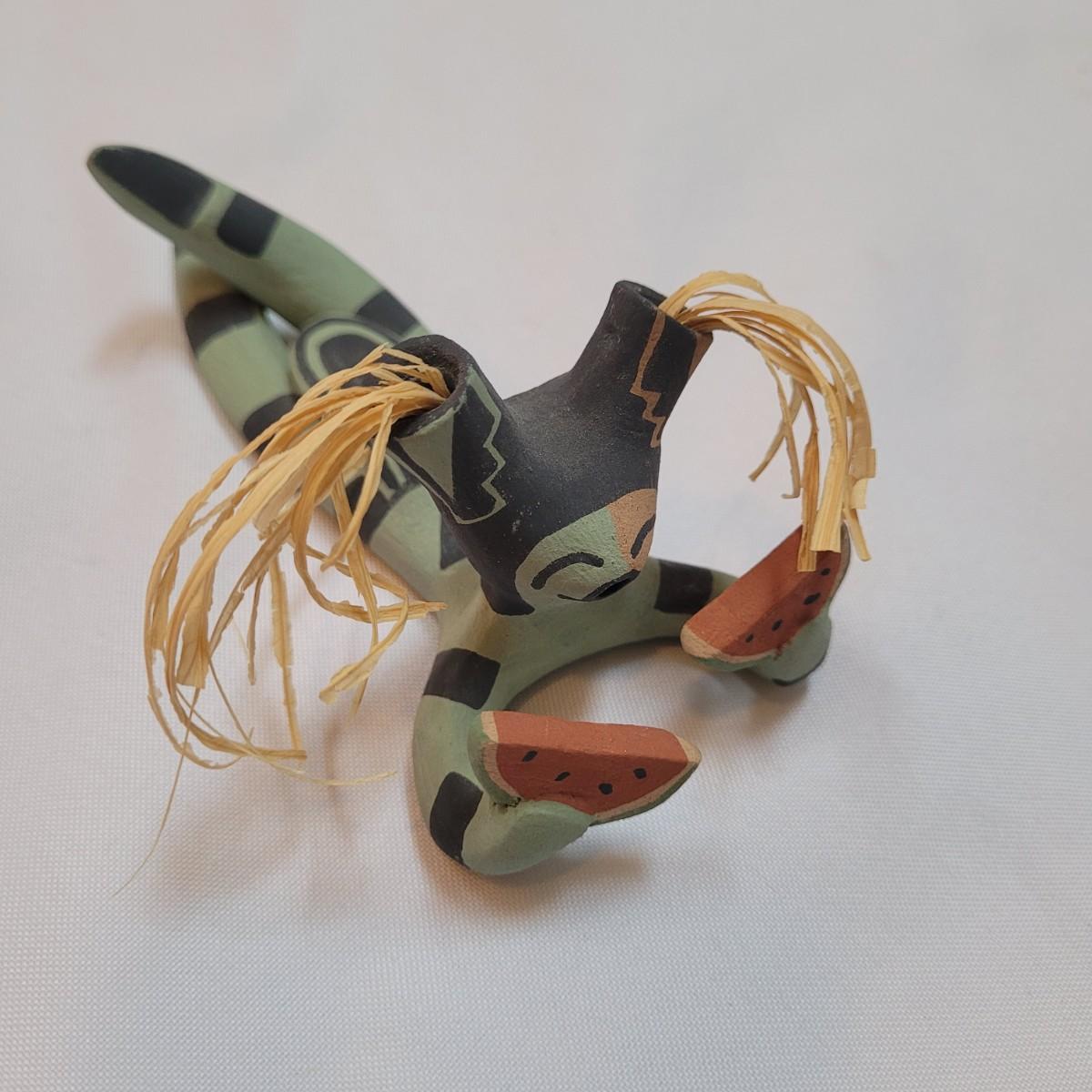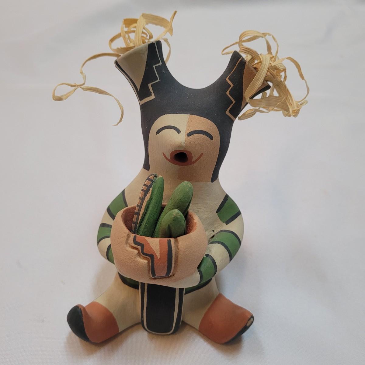 One figure is holding a bowl with ears of corn in it. The other figure is laying down holding watermelon slices. Both are handmade and hand painted. Each has ears made from stringy plant material. Both are signed on the bottom. The larger figurine measures 4" x 3" x 6"H.