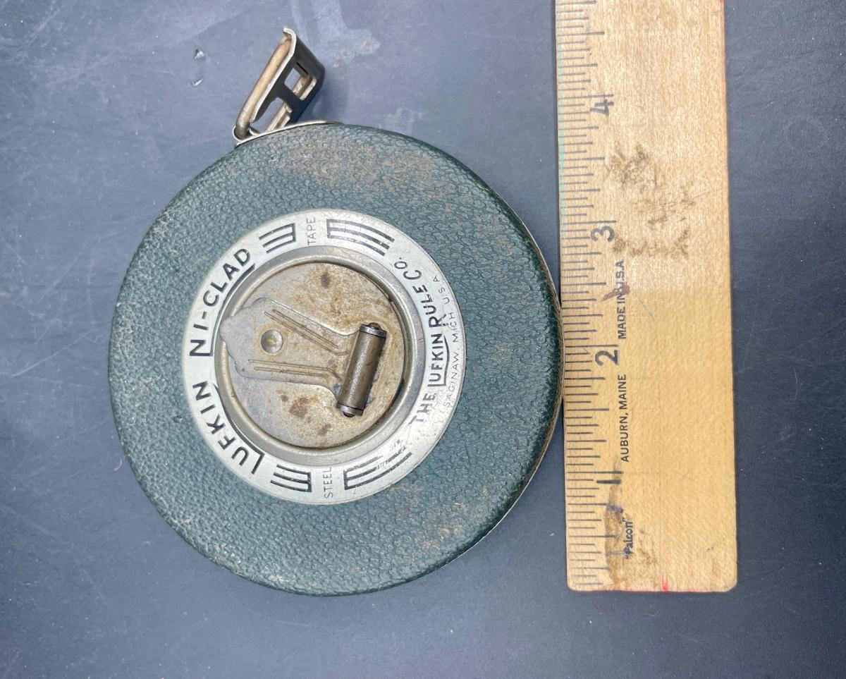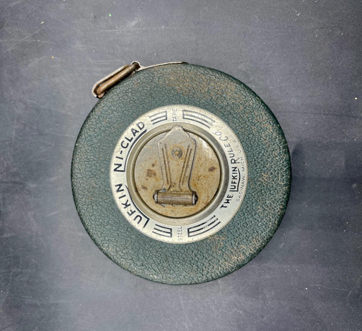 Made by the Lufkin Rule Company. Wind-up spool style. Good condition.