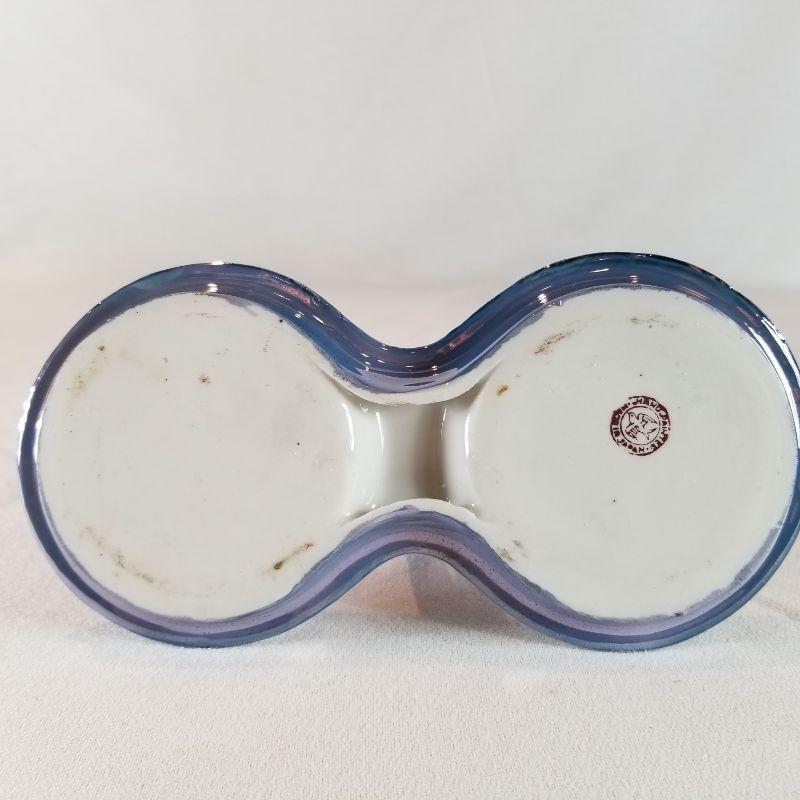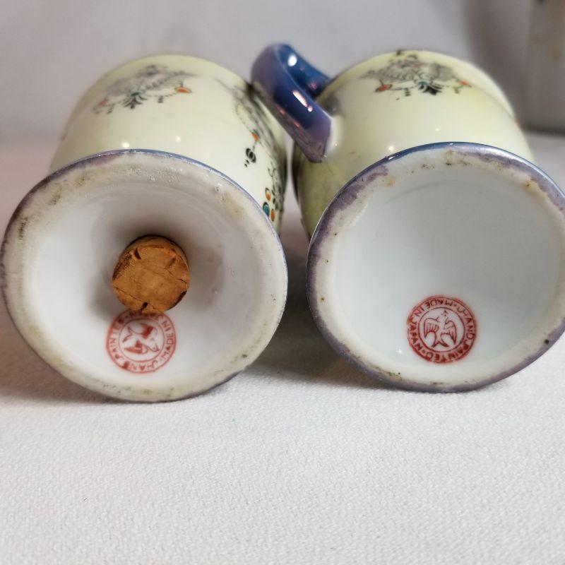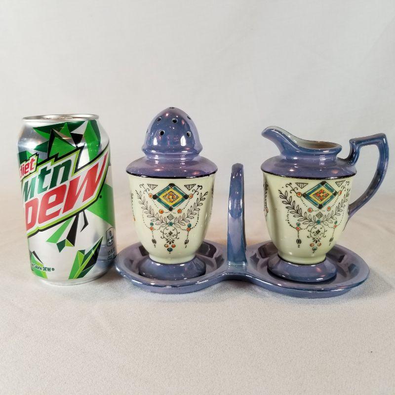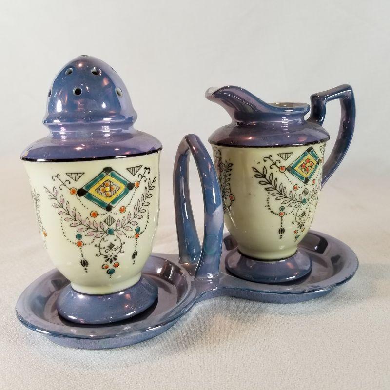 Victorian decor inspired Hand Painted, old Japan luster glazed sugar shaker, creamer and carrier. Marked on bottom: Hand Painted, Made in Japan. As new condition, no cracks or chips.