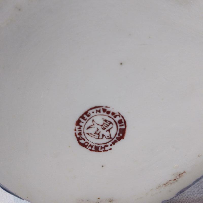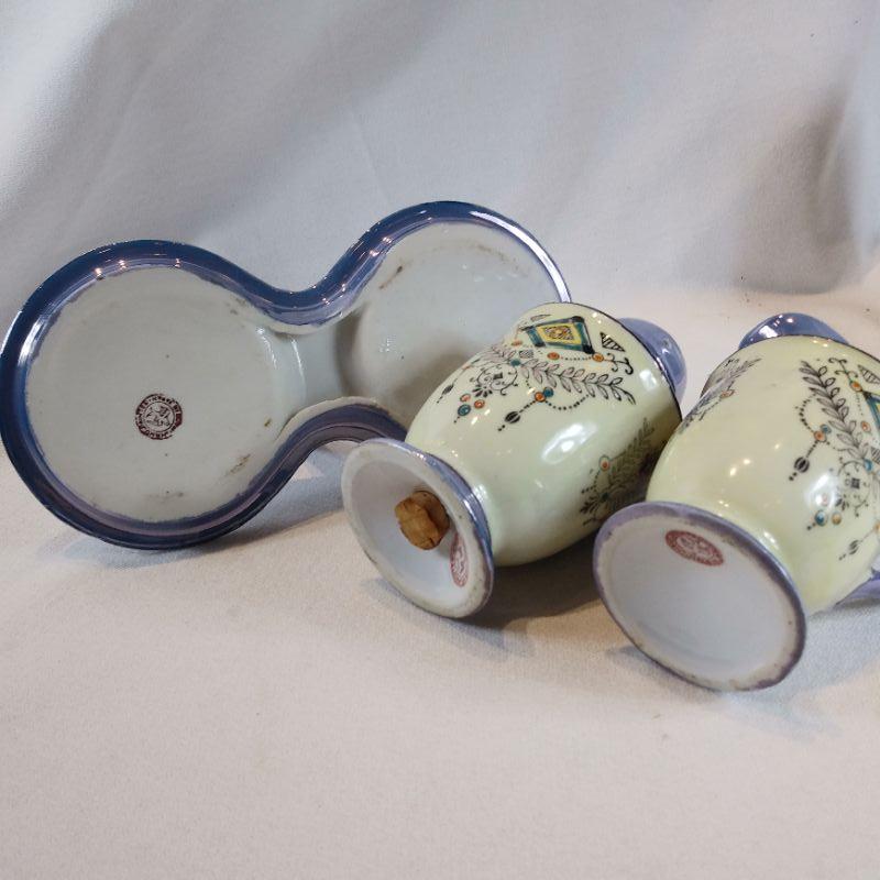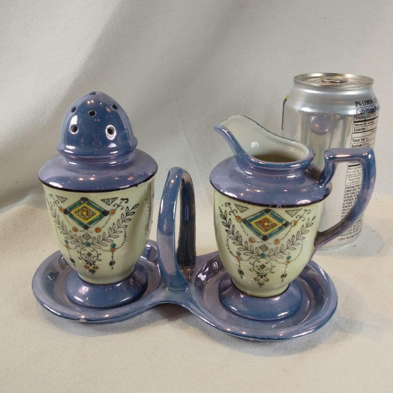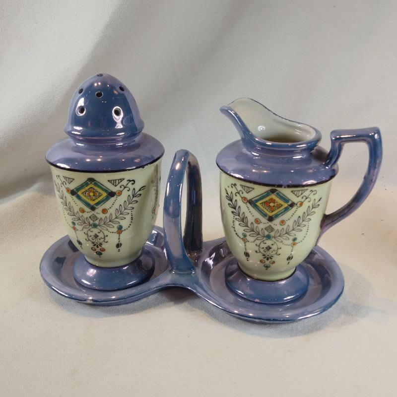 Porcelain Lusterware Sugar and Creamer with Carrier. Marked on bottom: Made in Japan - Hand Painted. Overall size is 7 1/2-inches wide X 5-inches tall. Very good condition. Very pretty for use, display or both.
