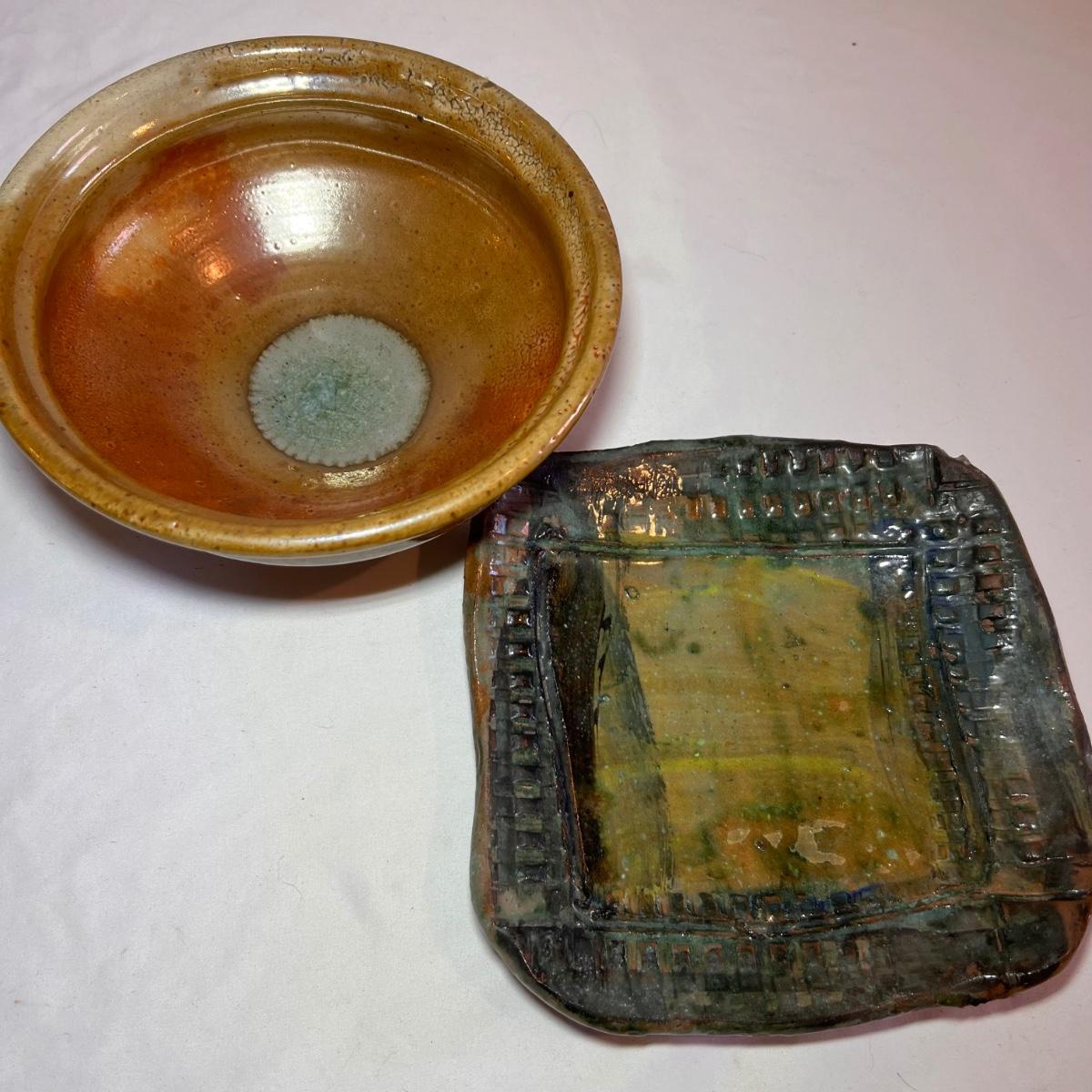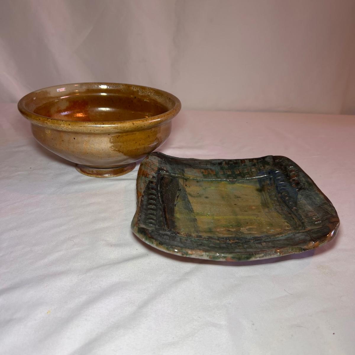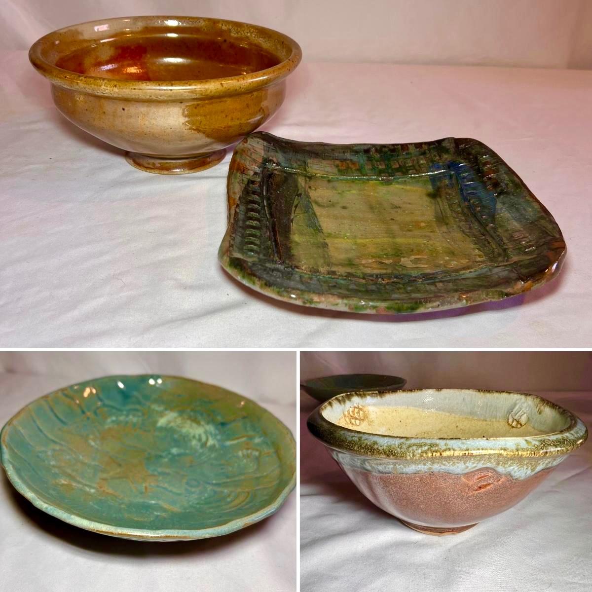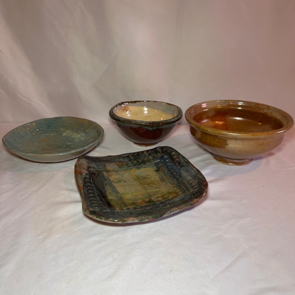 The three bowls are all signed. The shallow slab built plate has no markings. The largest bowl measures 8”D x 4”H and has a glossy iridescent glaze.