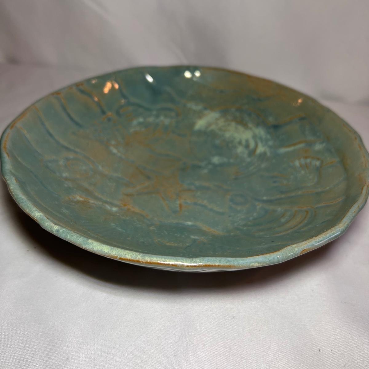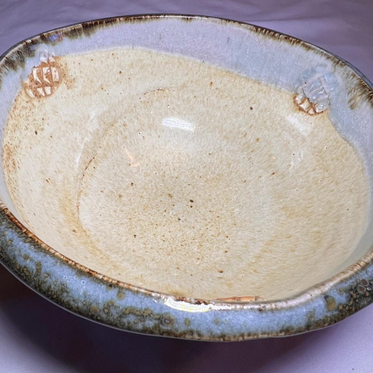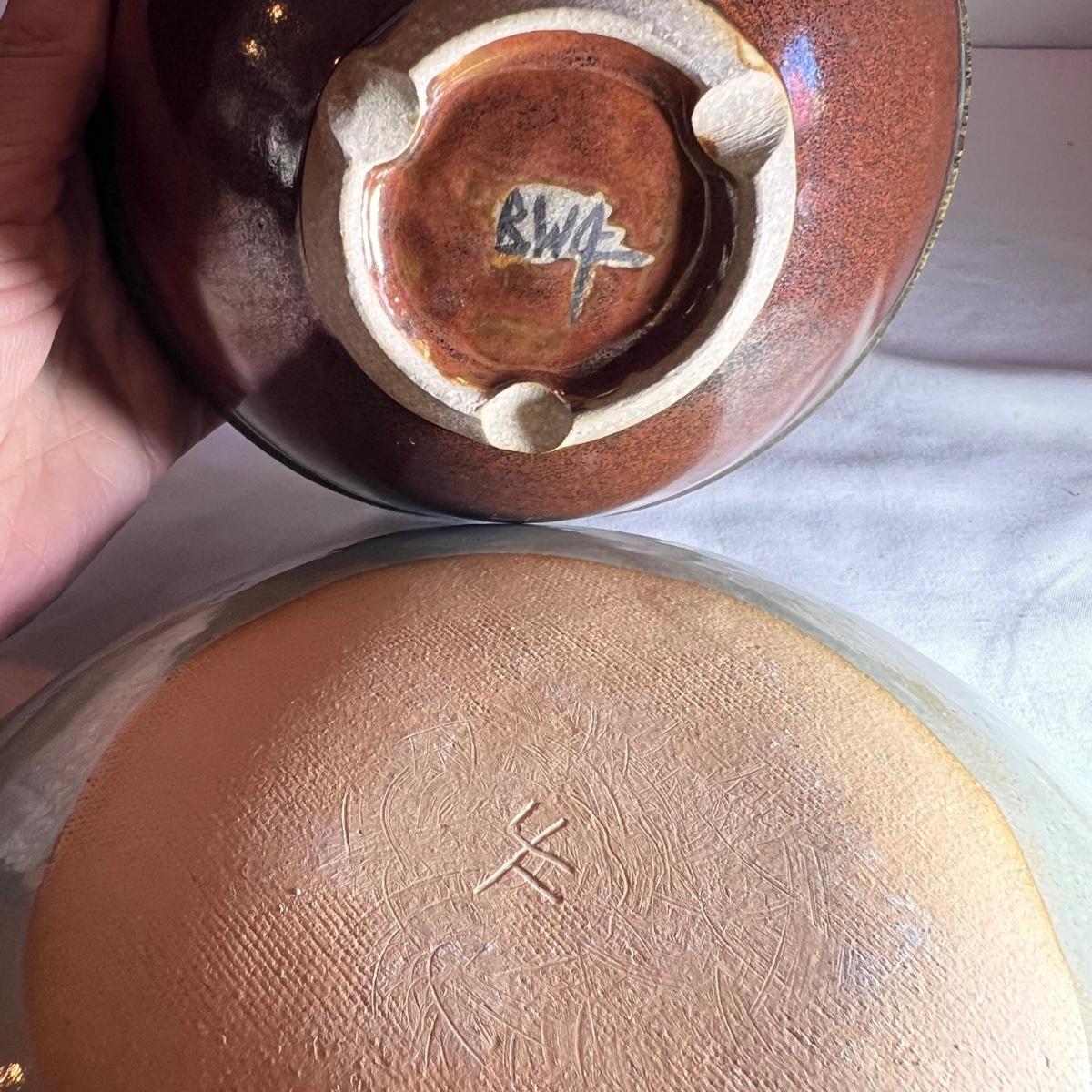 The three bowls are all signed. The shallow slab built plate has no markings. The largest bowl measures 8”D x 4”H and has a glossy iridescent glaze.