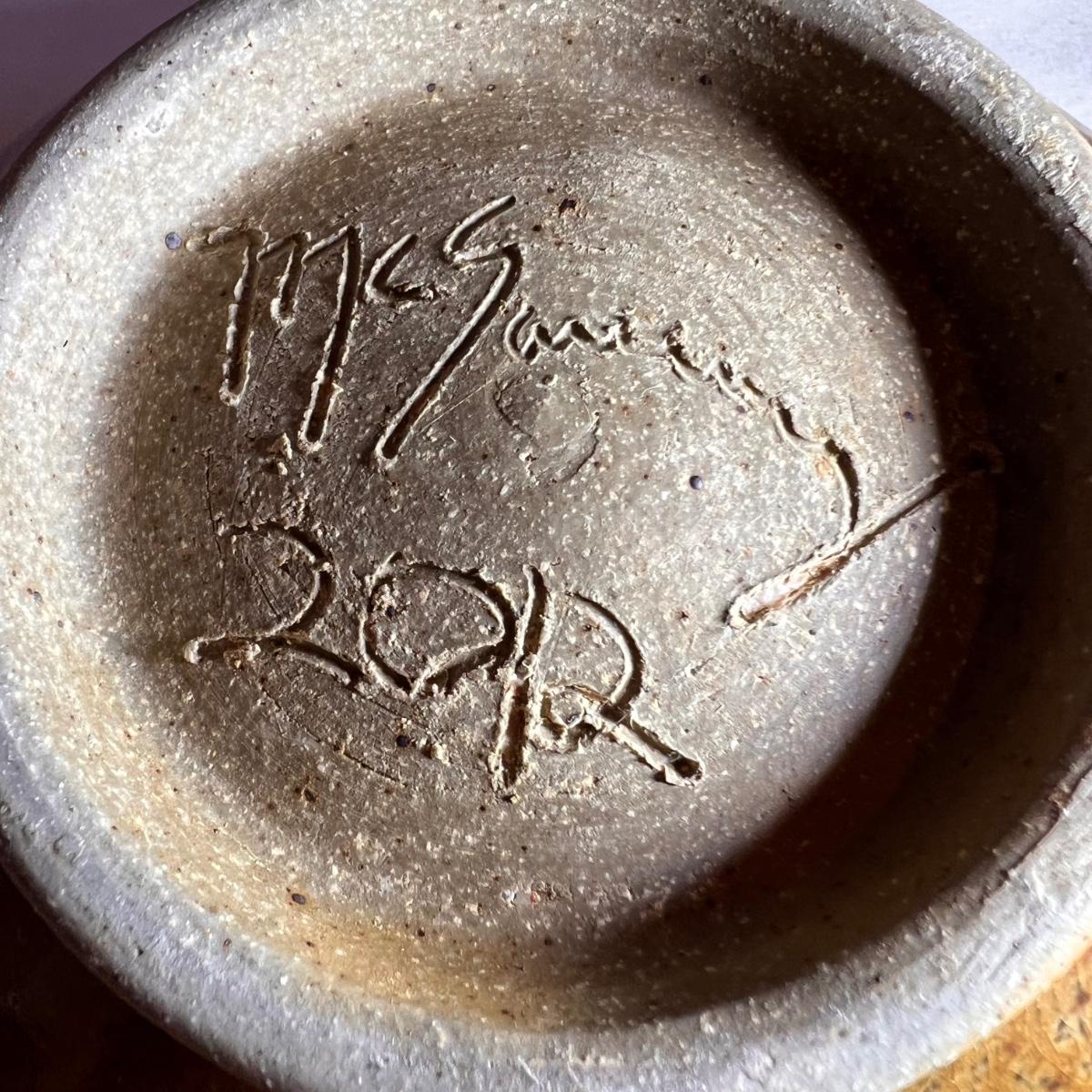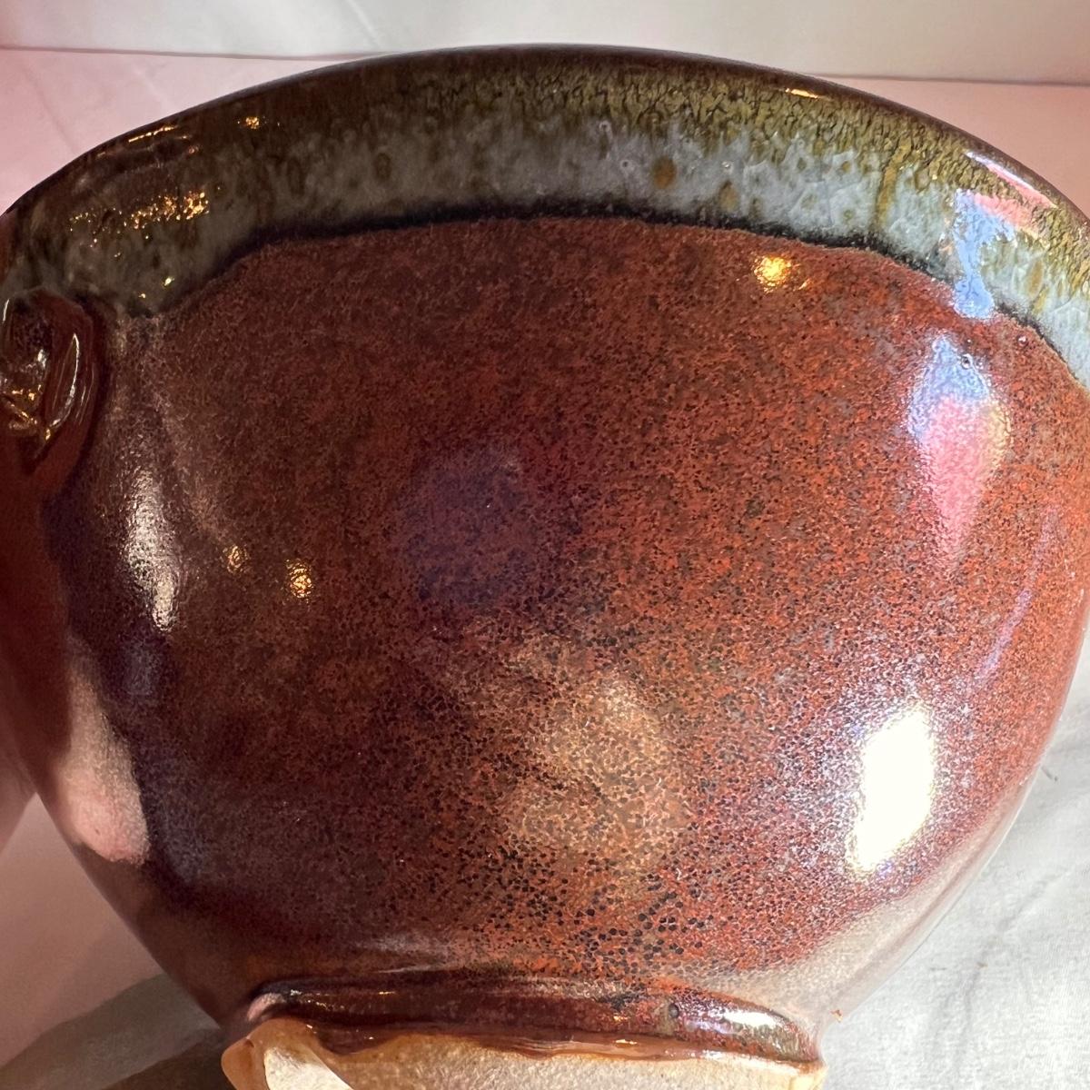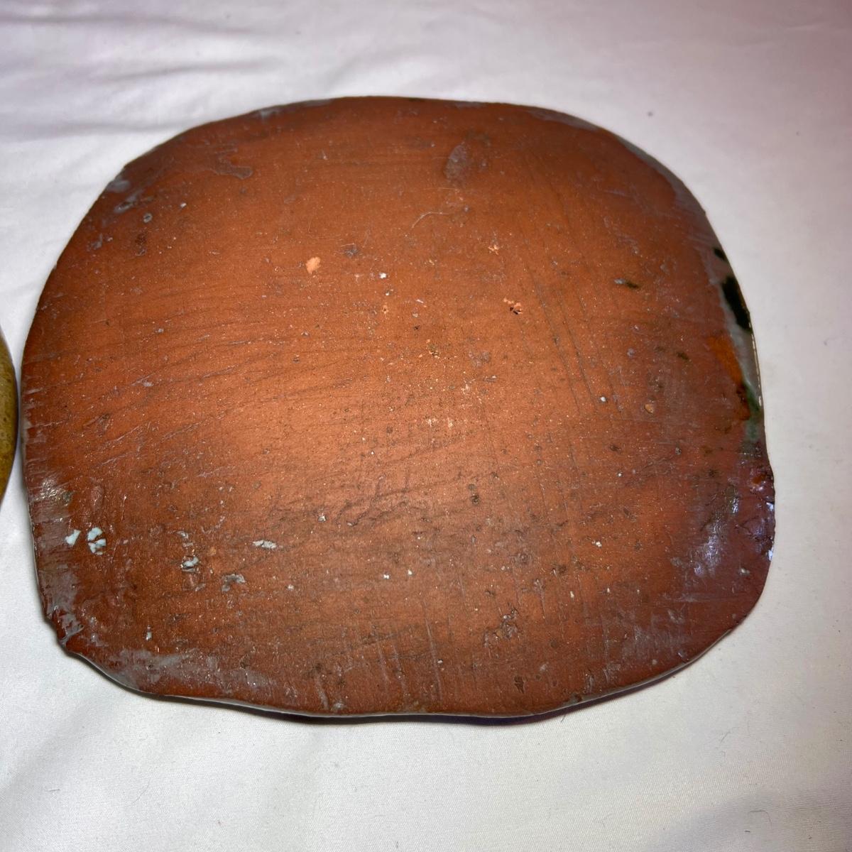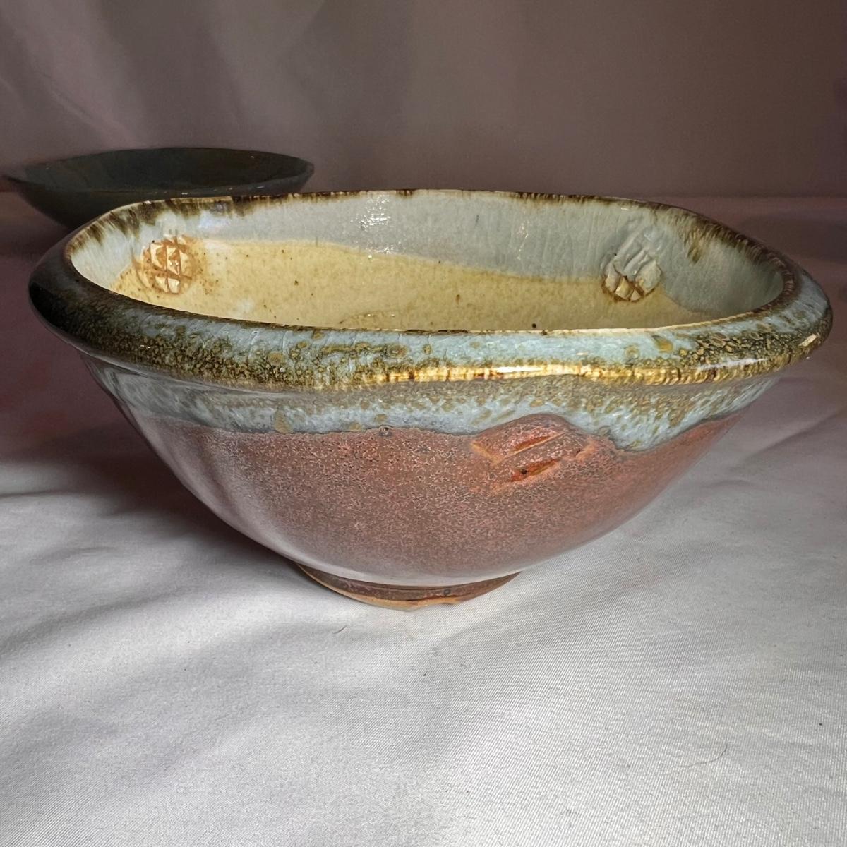 The three bowls are all signed. The shallow slab built plate has no markings. The largest bowl measures 8”D x 4”H and has a glossy iridescent glaze.