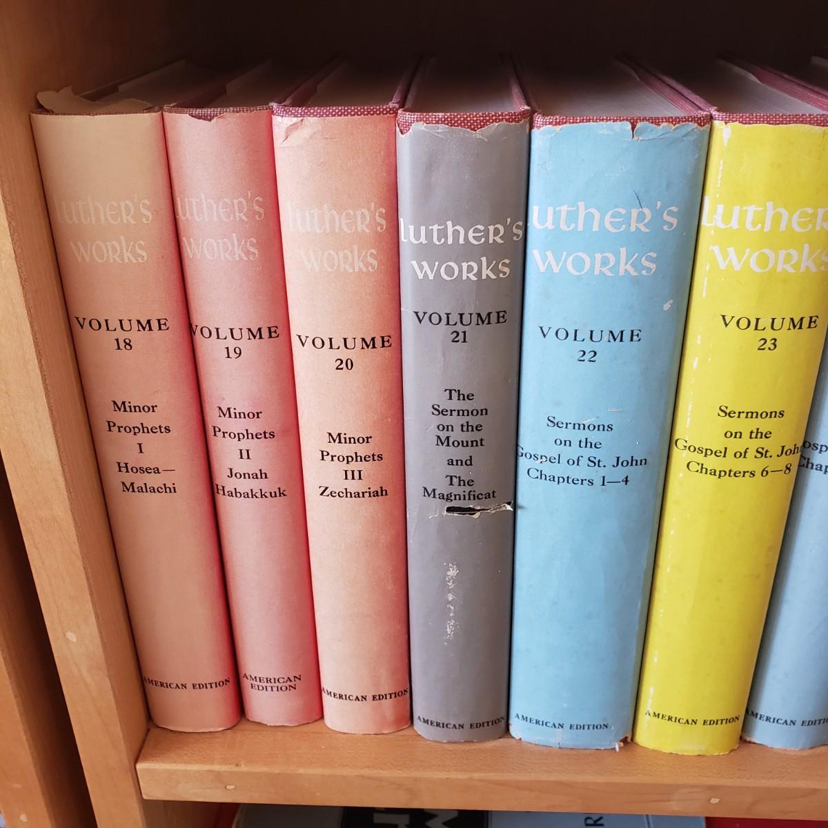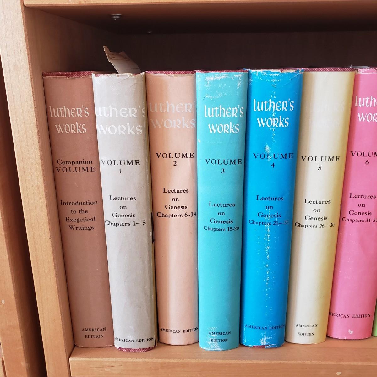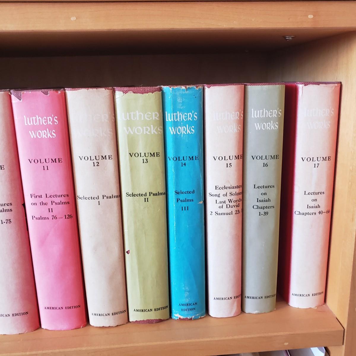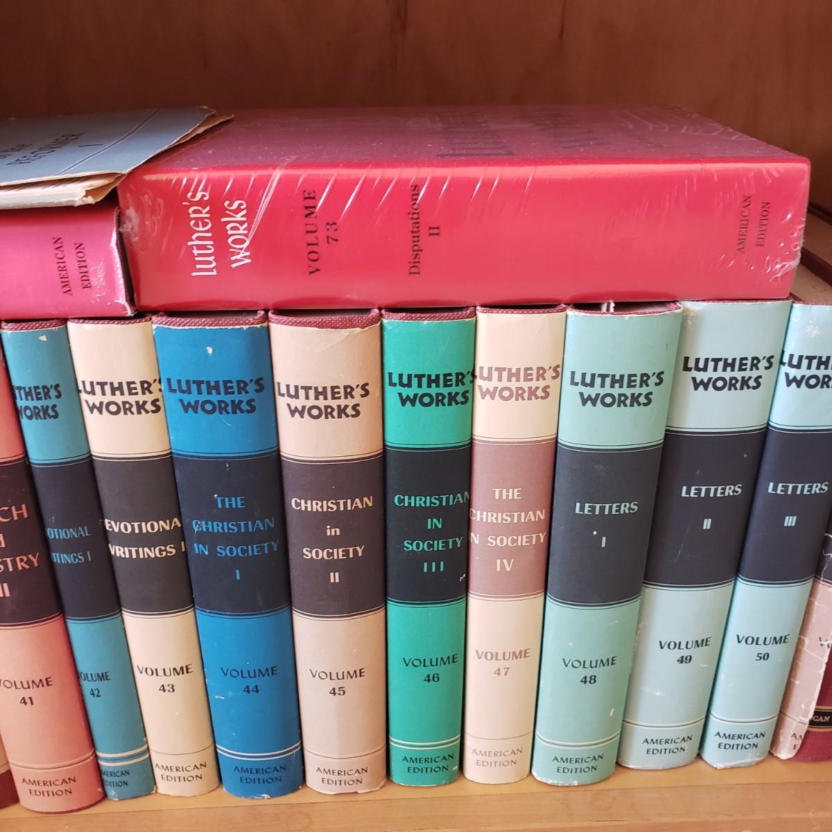 This is Luther's Works Volume 1-54. There is also volume 69 and 73. The books appear to be in good condition, yet some covers are worn.