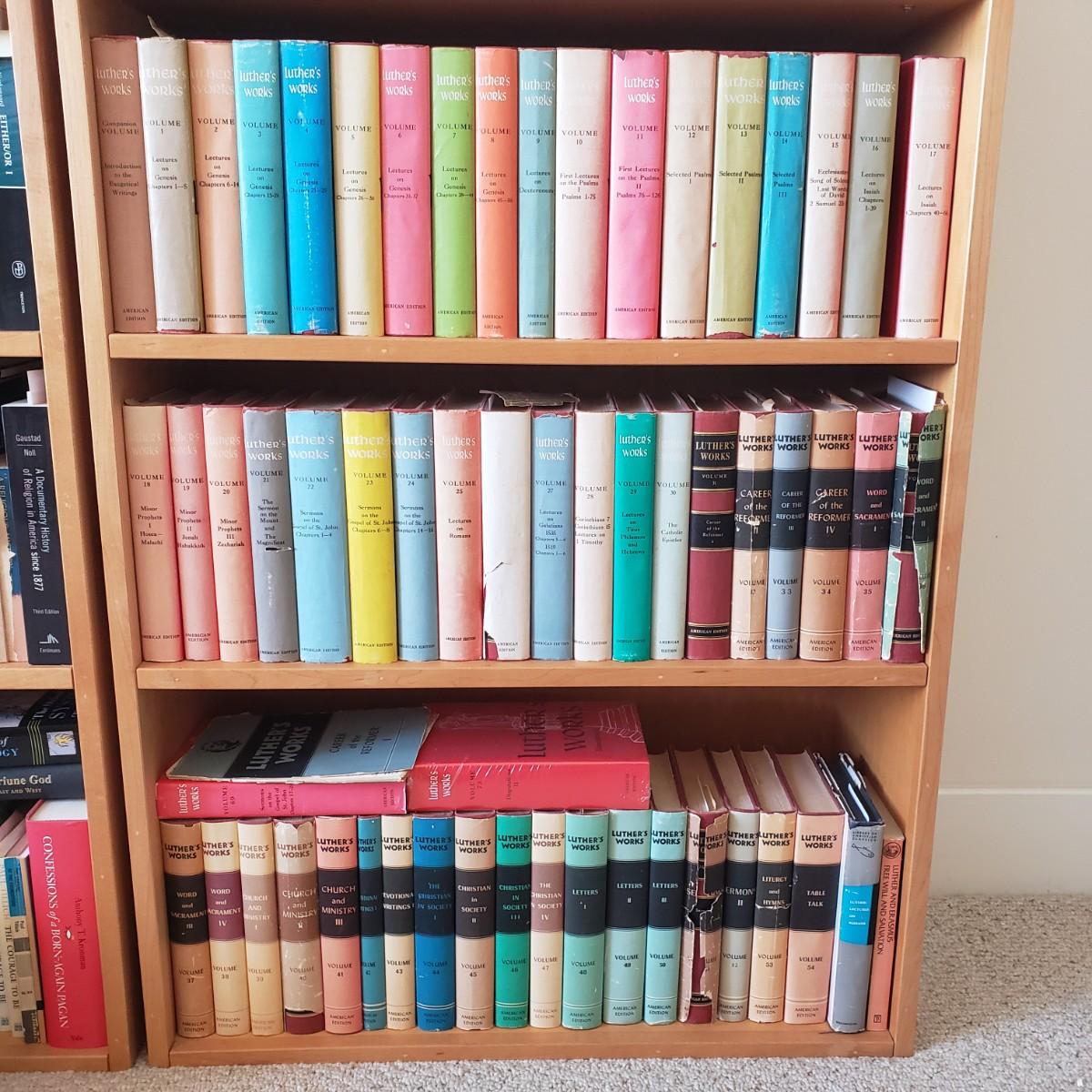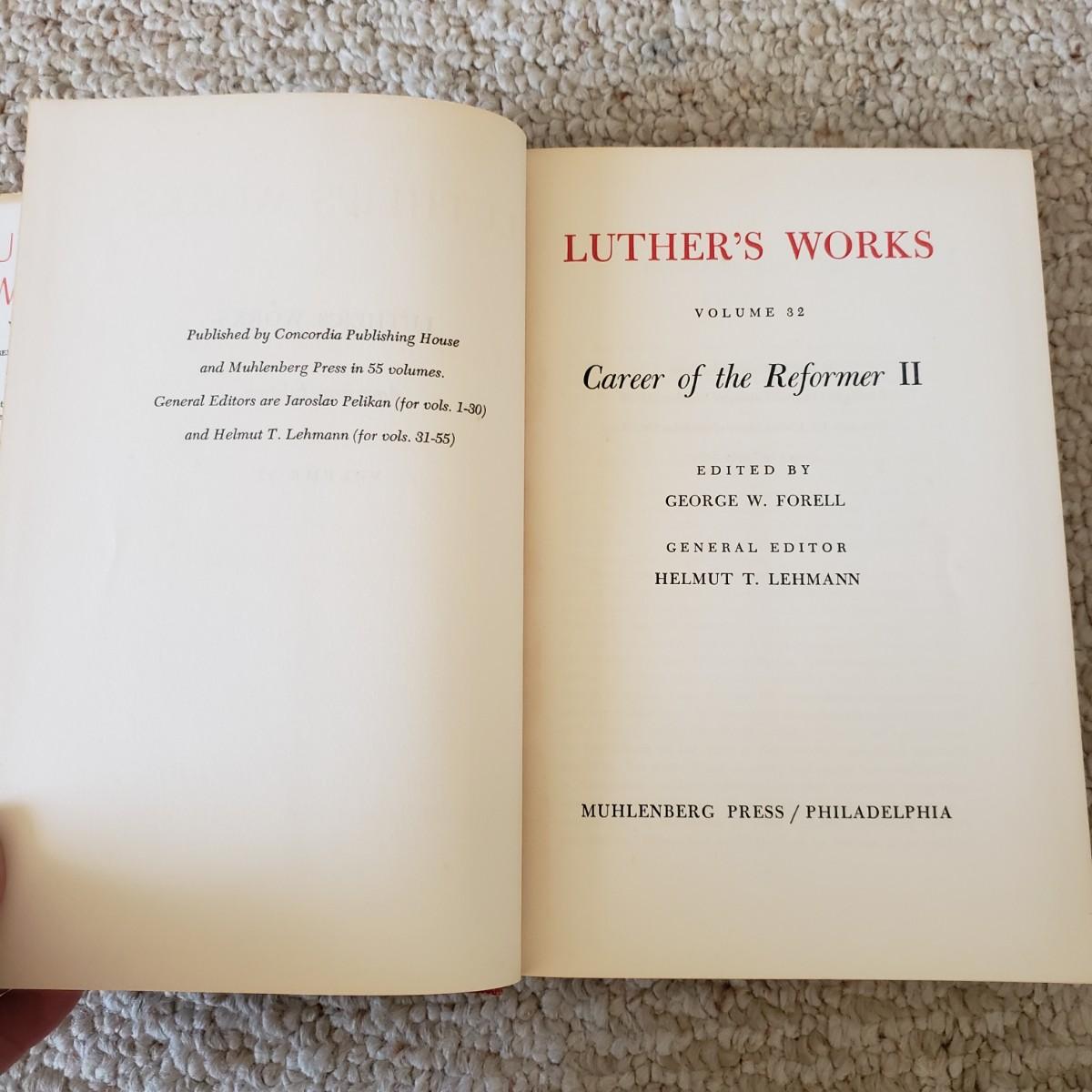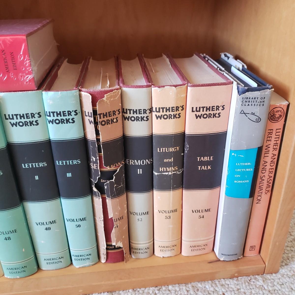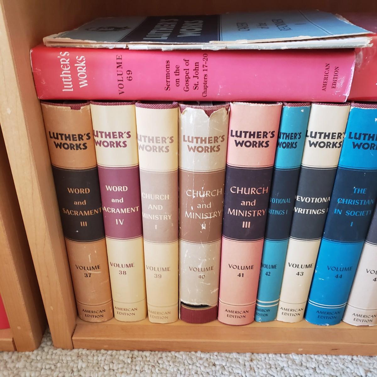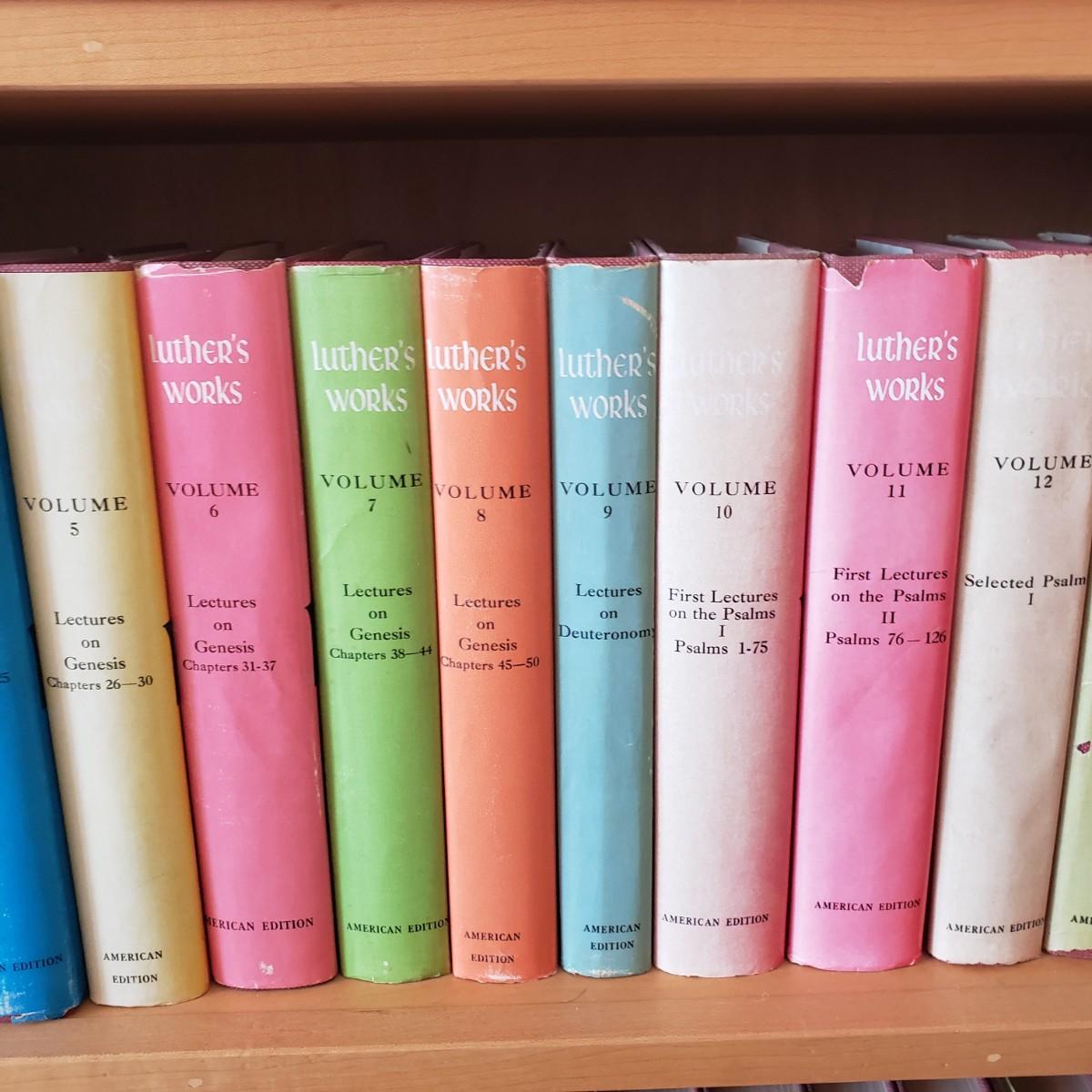 This is Luther's Works Volume 1-54. There is also volume 69 and 73. The books appear to be in good condition, yet some covers are worn.