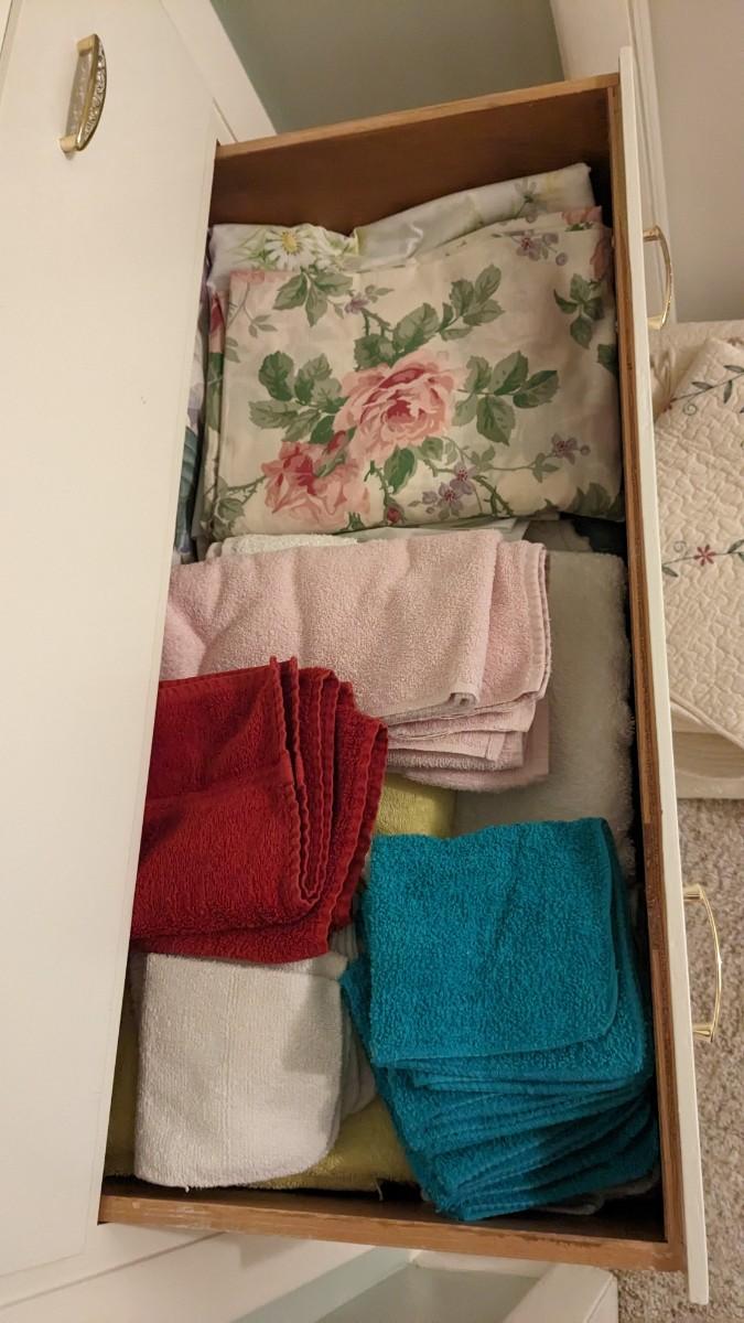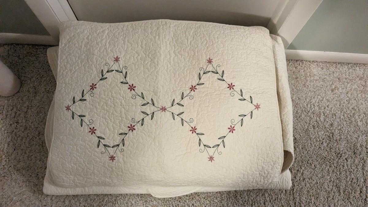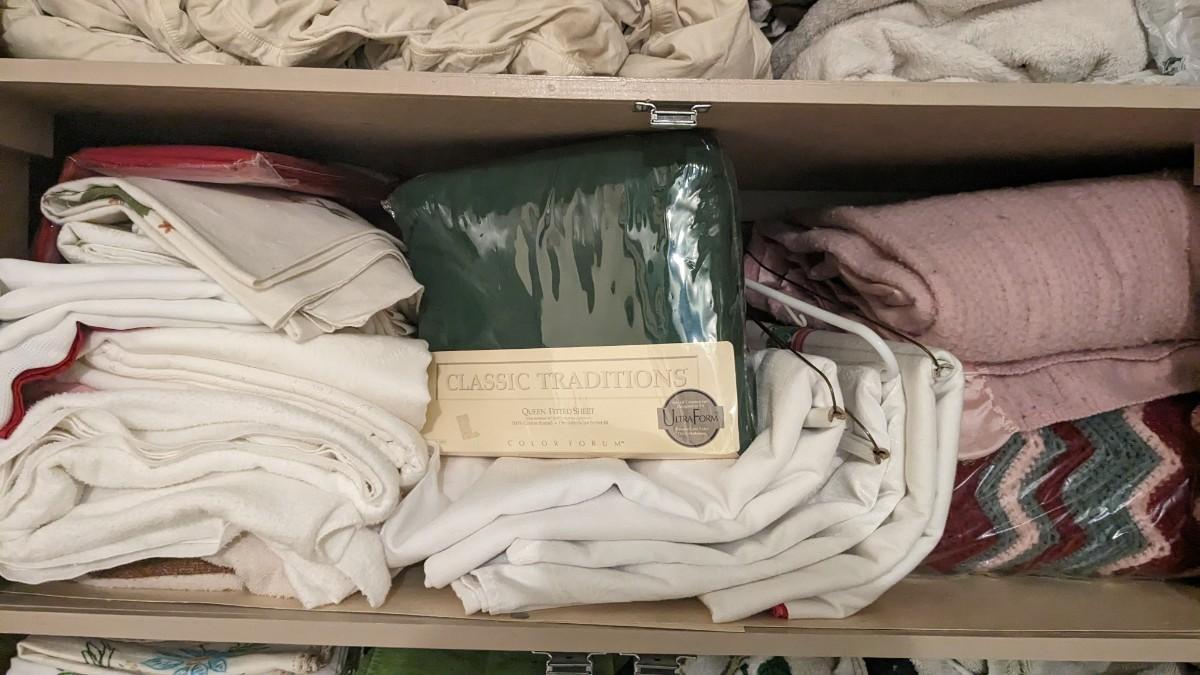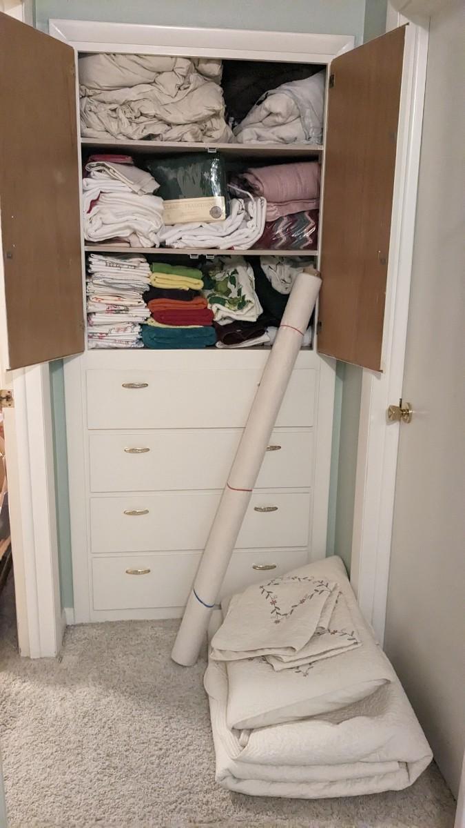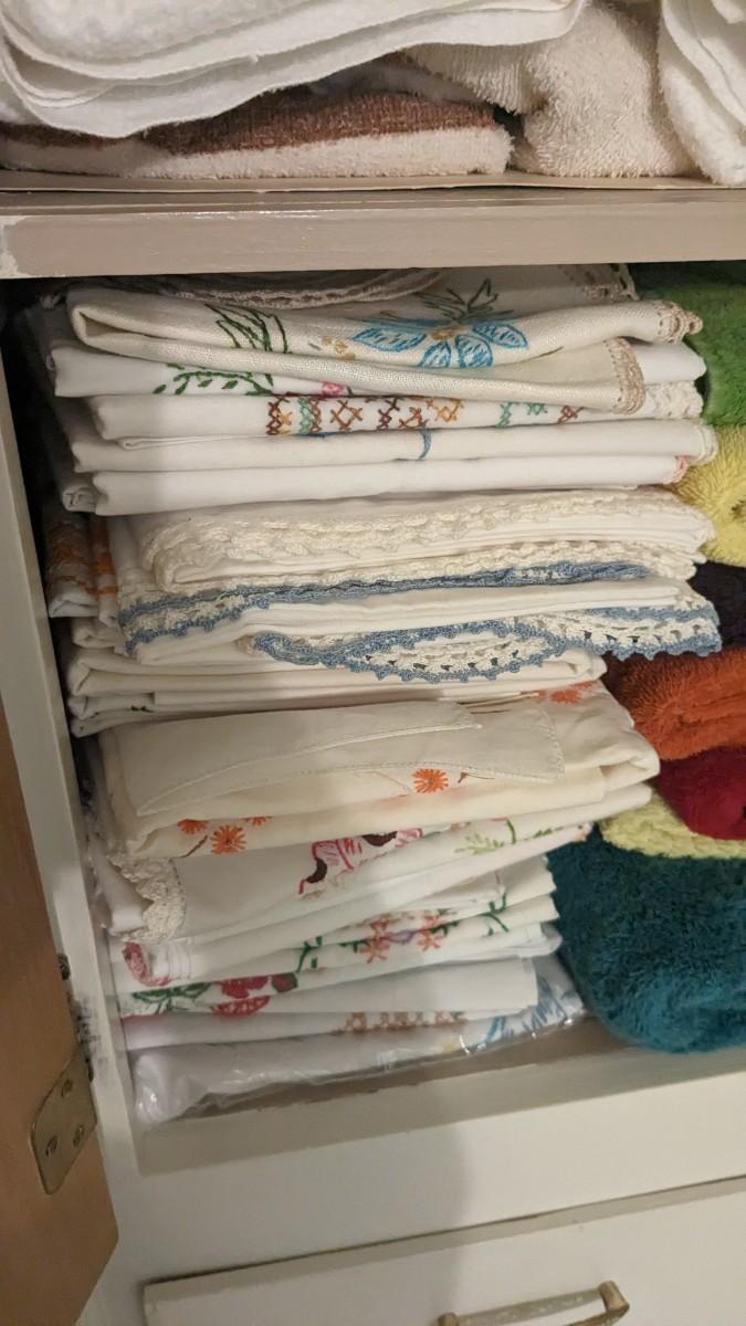 A MASSIVE amount of FANTASTIC linens. Ranging from vintage towels, embroidered linens, and afghans all the way to contemporary throws, thick blankets, and sets. All sizes appear to be queen/full. Includes a perfect condition down comforter, a beautiful quilted set, and so much more! No shipping. Winning bidder responsible for removal of all items. endofhall