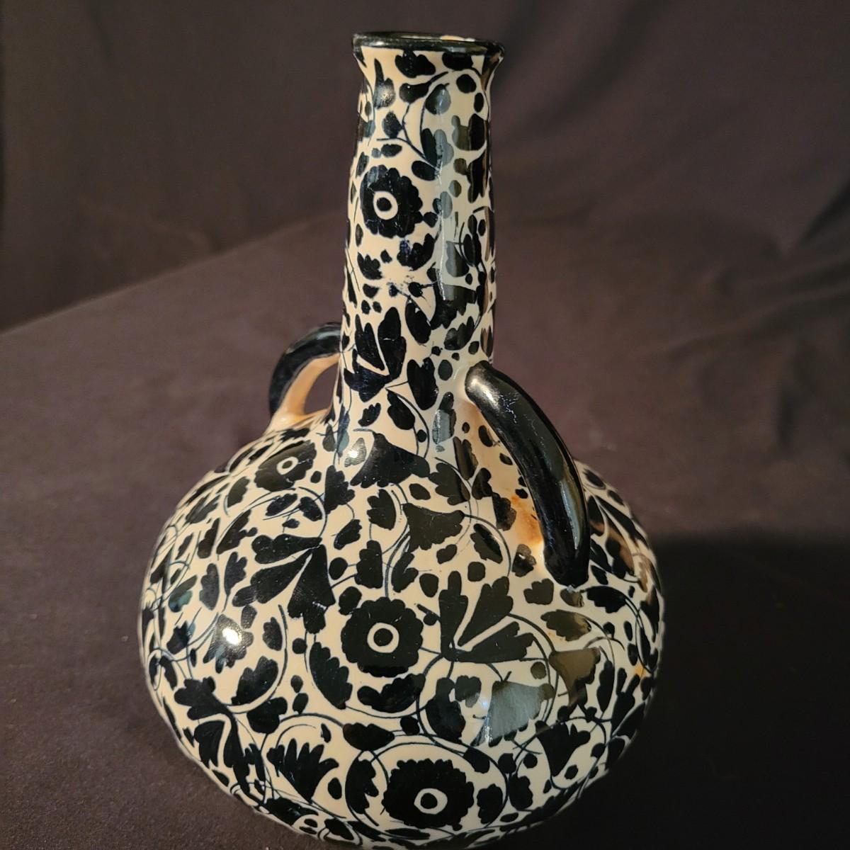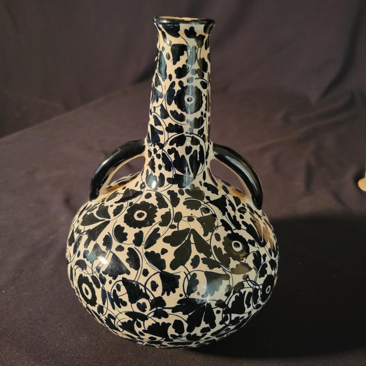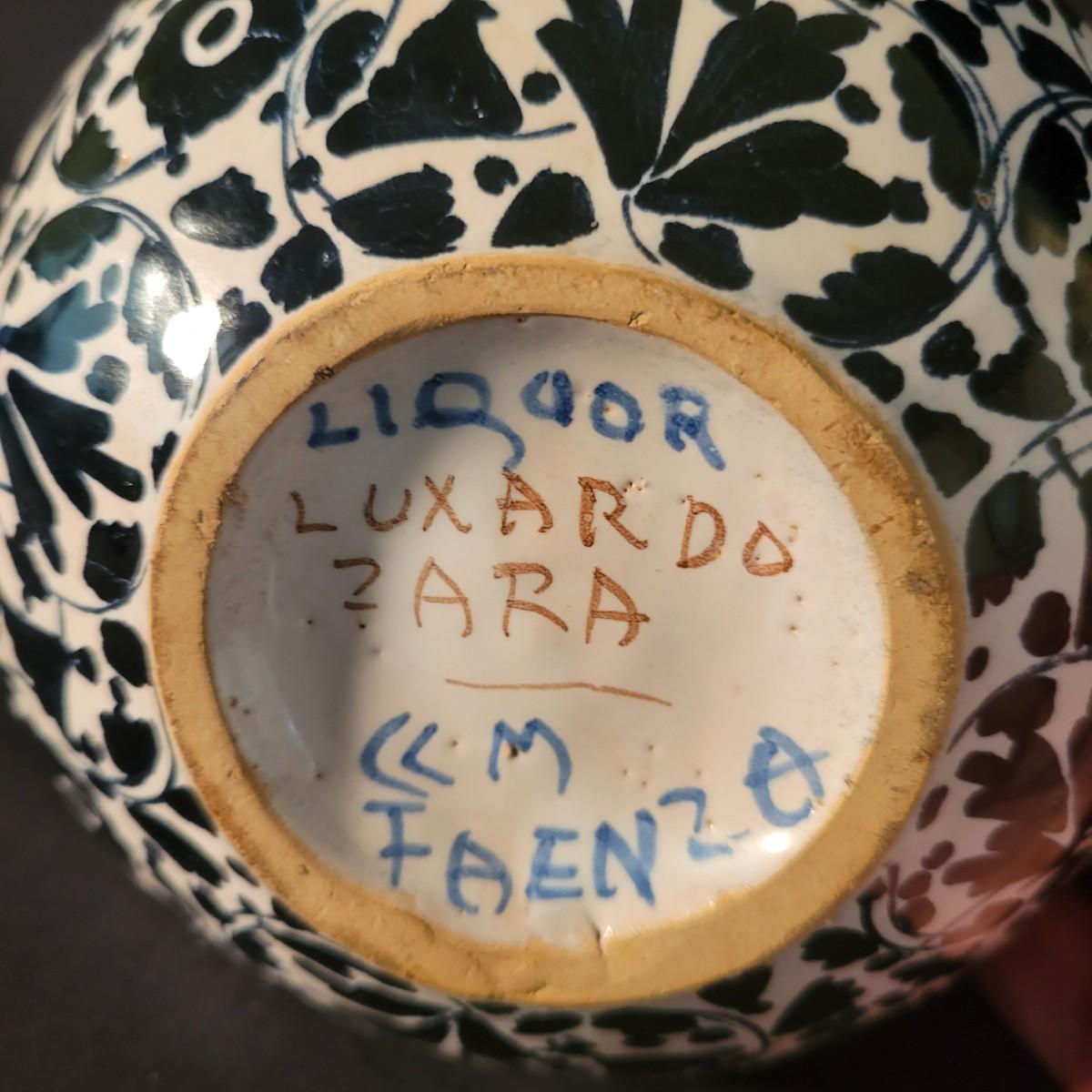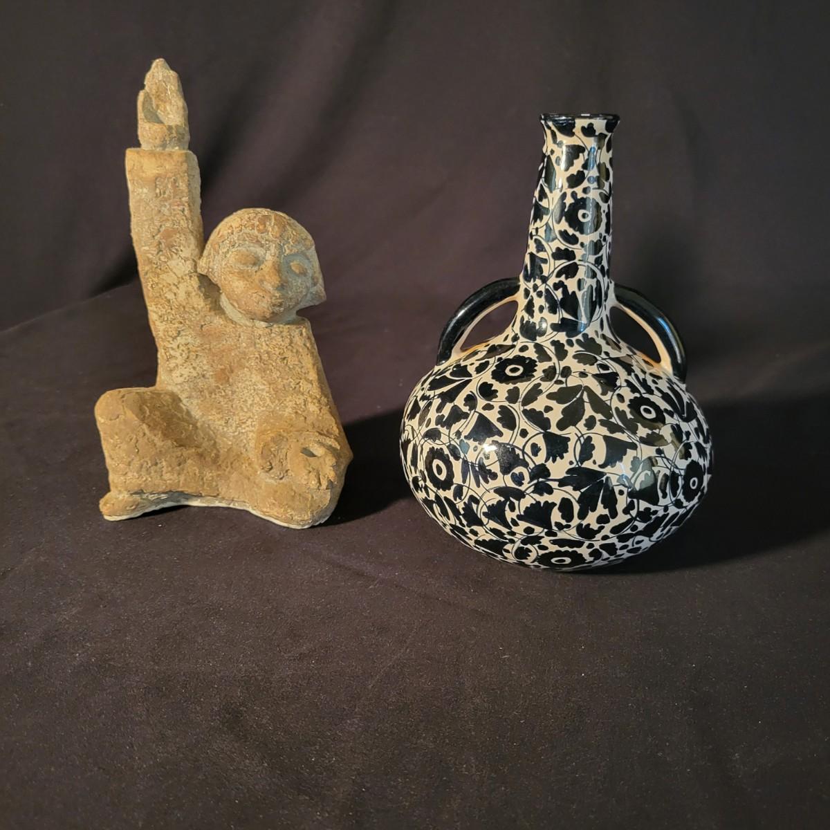 A ceramic liquor bottle and primitive figurine in good condition. Bottle does have some staining. The bottle features a black floral pattern and is labeled with Faenzo, which is a village in Italy. It measures approximately 5.5" x 8". The primitive figurine appears to be ceramic and has small indentions in its hands, perhaps to hold candles. Shipping available
