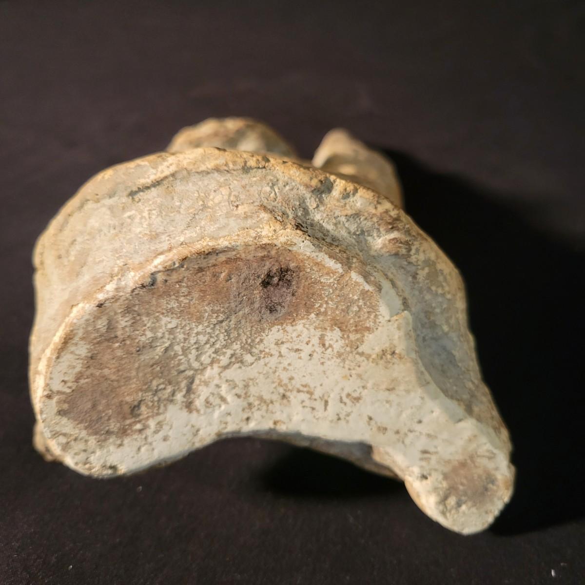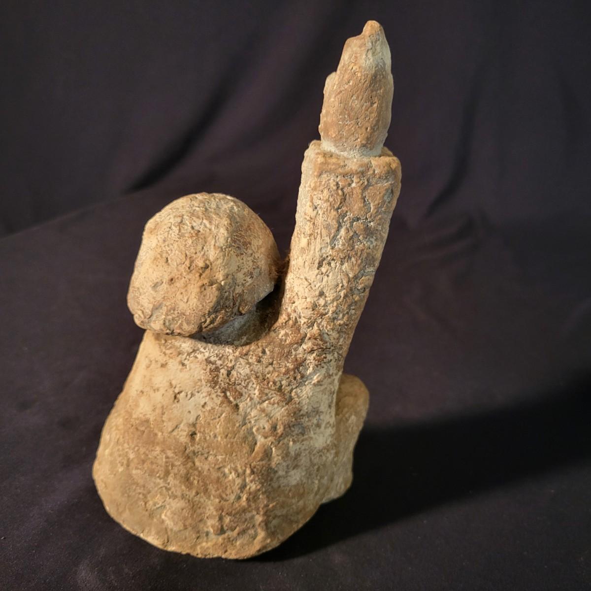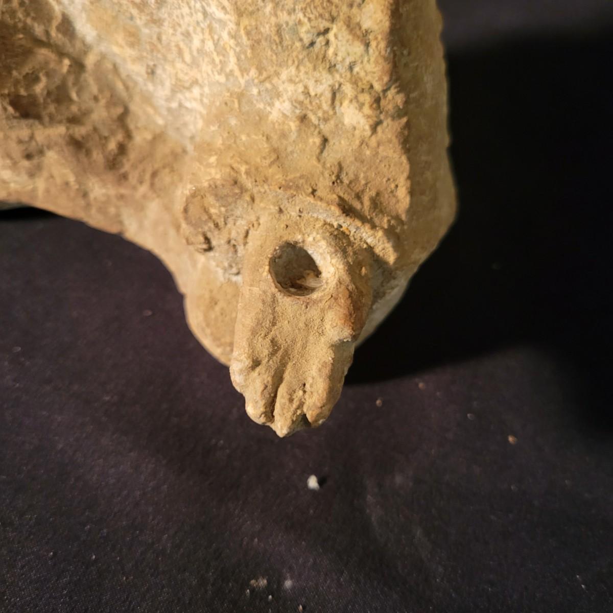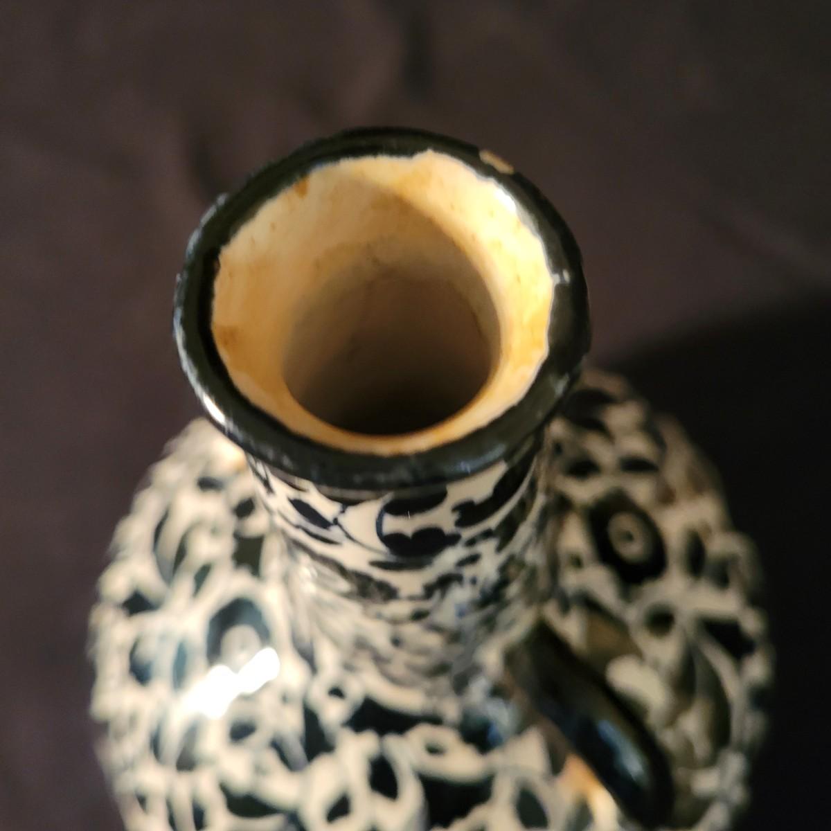 A ceramic liquor bottle and primitive figurine in good condition. Bottle does have some staining. The bottle features a black floral pattern and is labeled with Faenzo, which is a village in Italy. It measures approximately 5.5" x 8". The primitive figurine appears to be ceramic and has small indentions in its hands, perhaps to hold candles. Shipping available