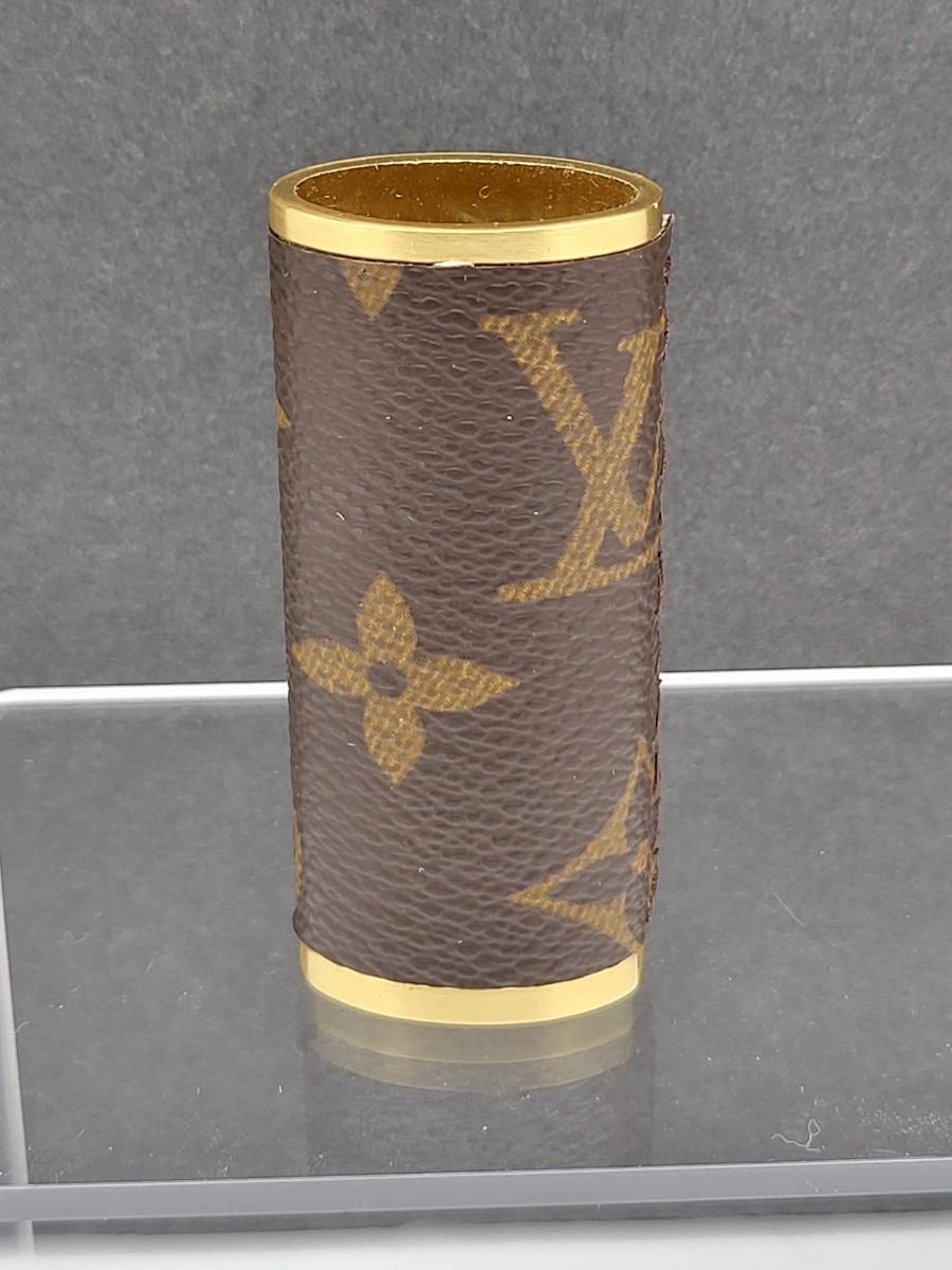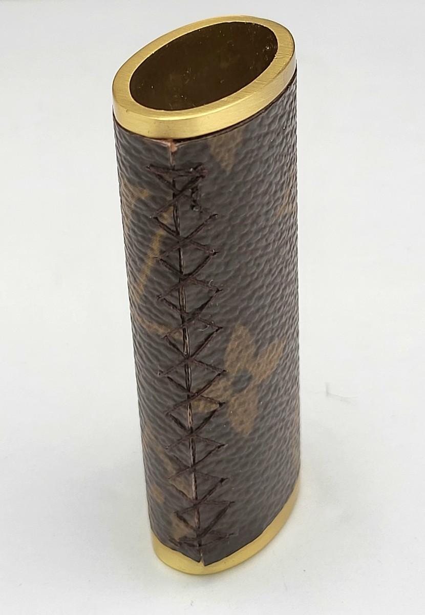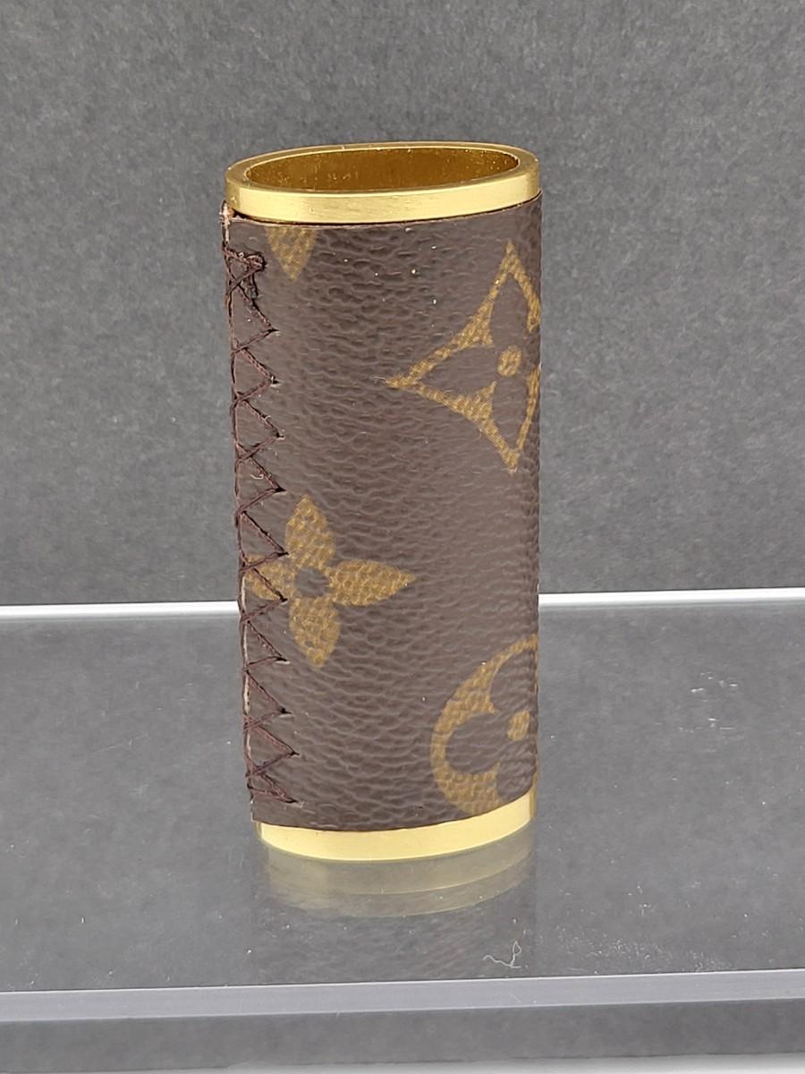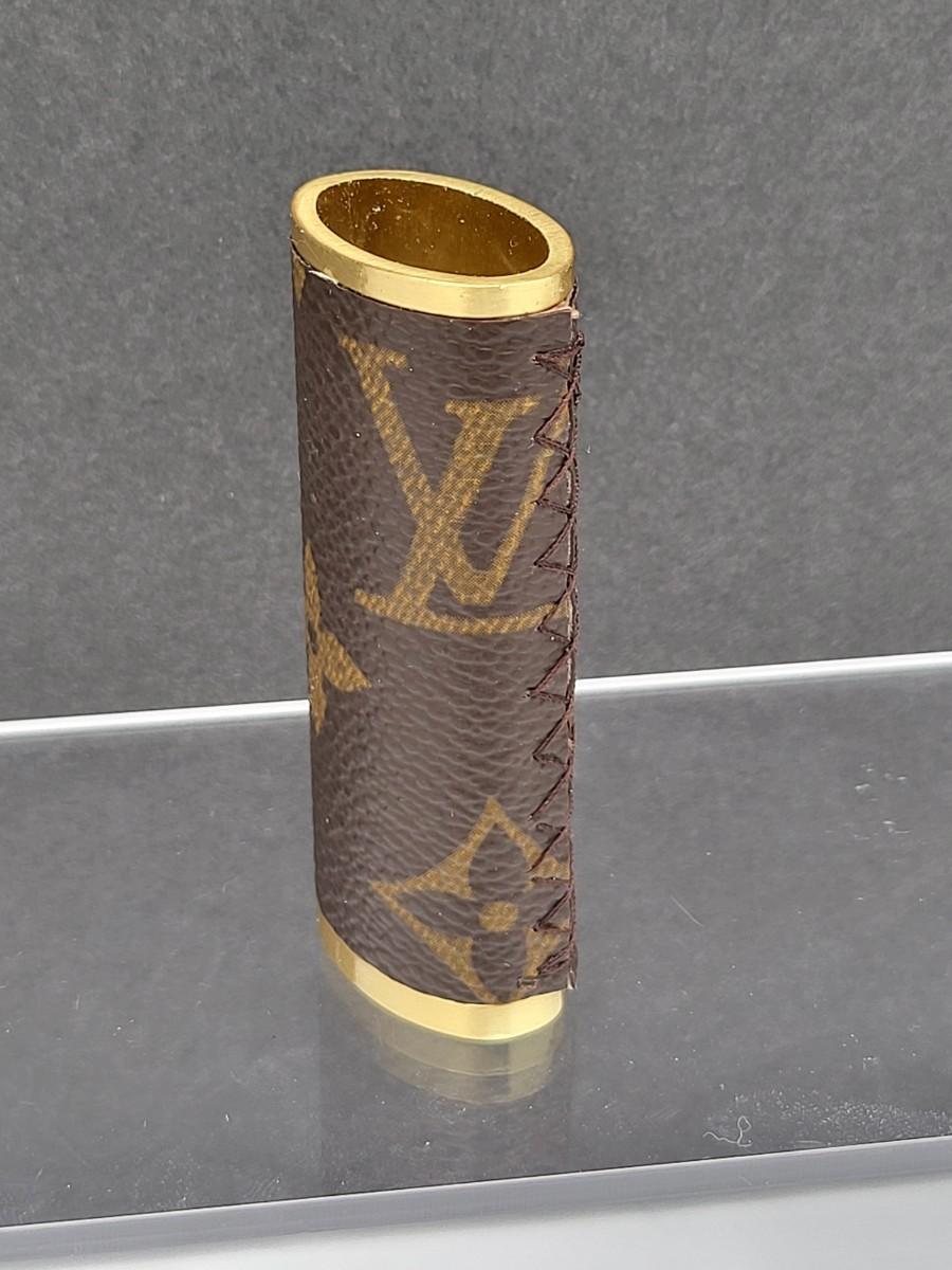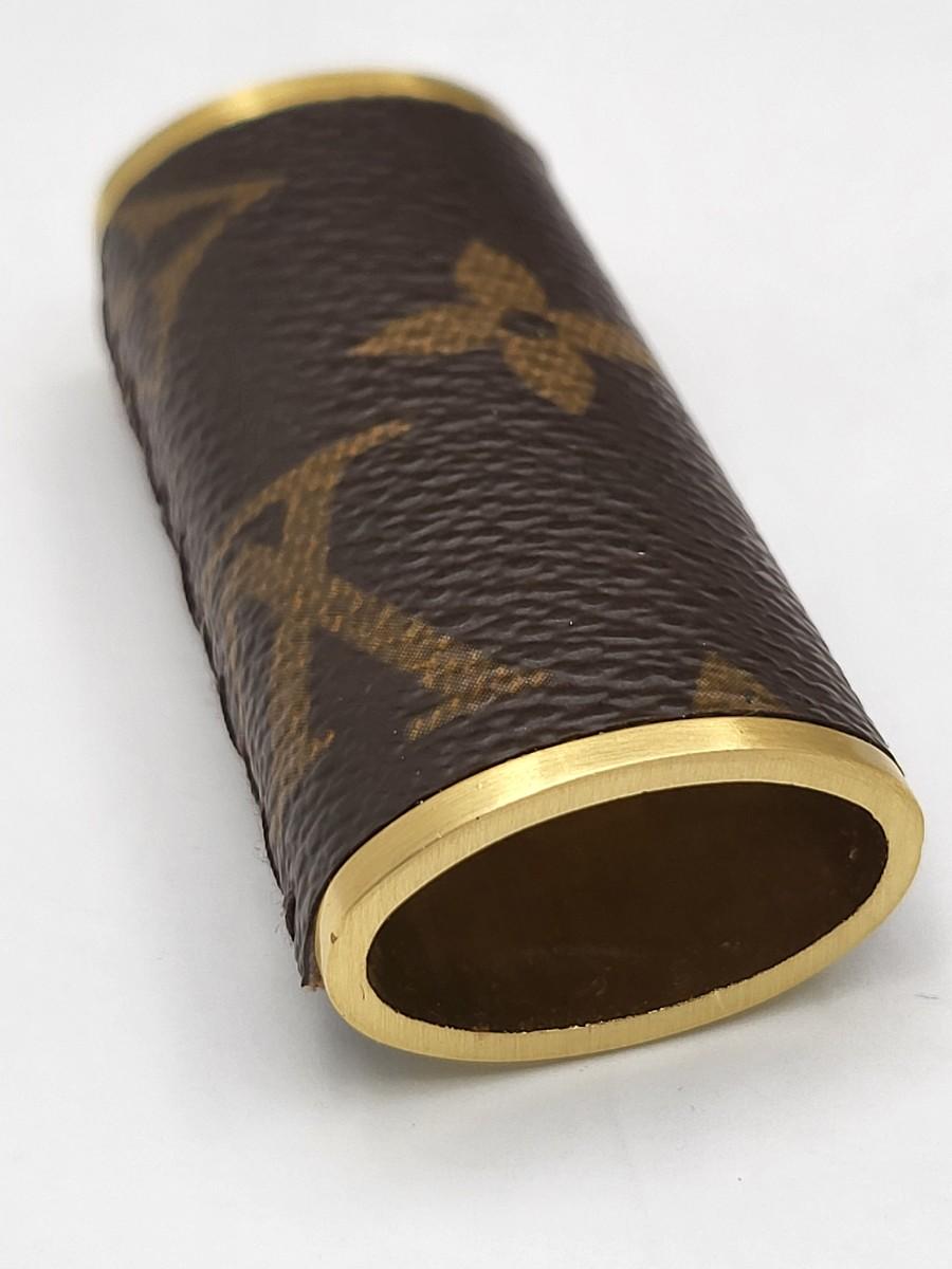 Standard size Bic lighter case with gold tone metal and wrapped in LV signature leather. 2.75" tall.