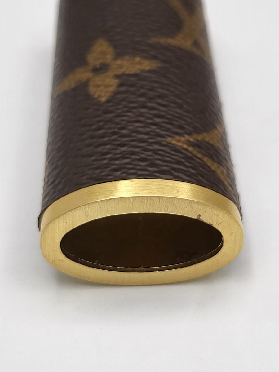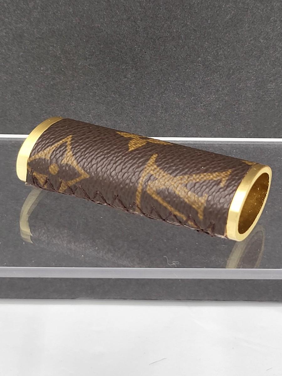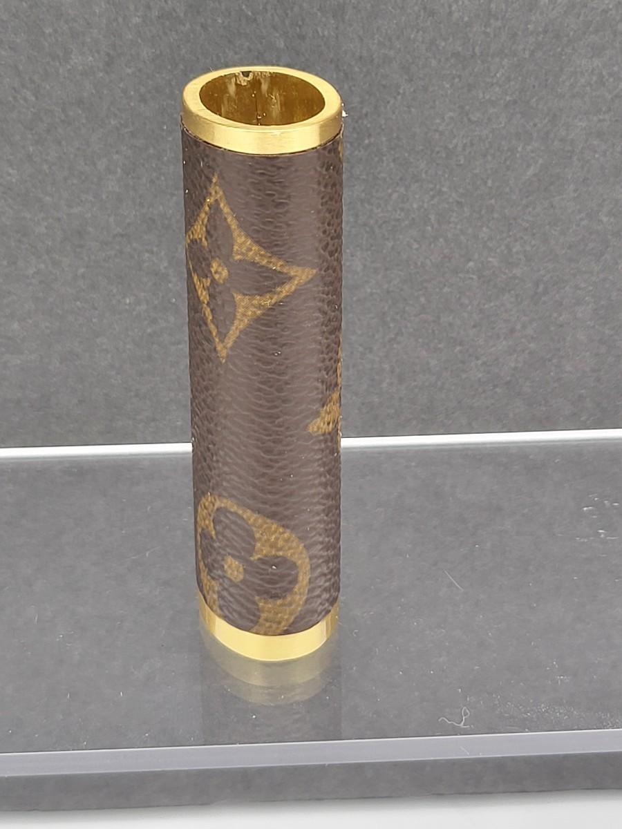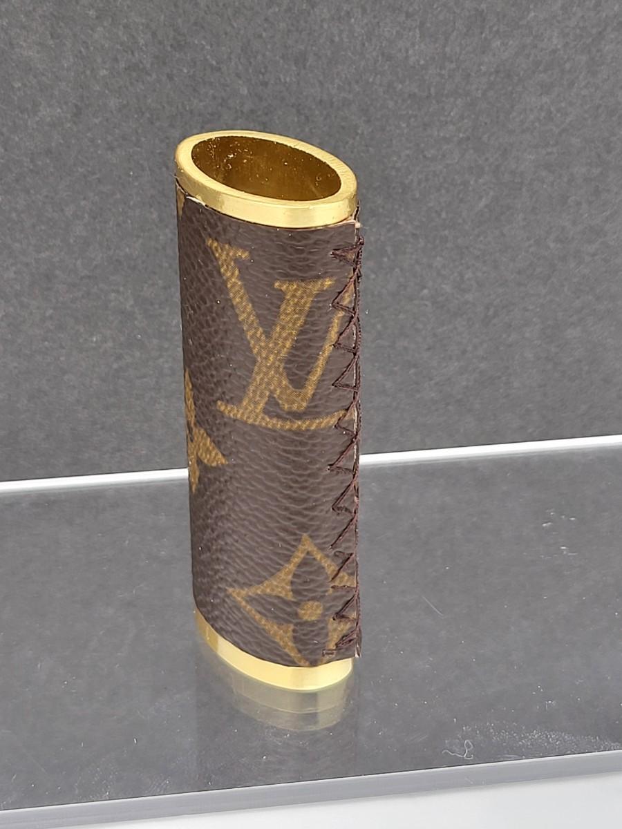 Standard size Bic lighter case with gold tone metal and wrapped in LV signature leather. 2.75" tall.