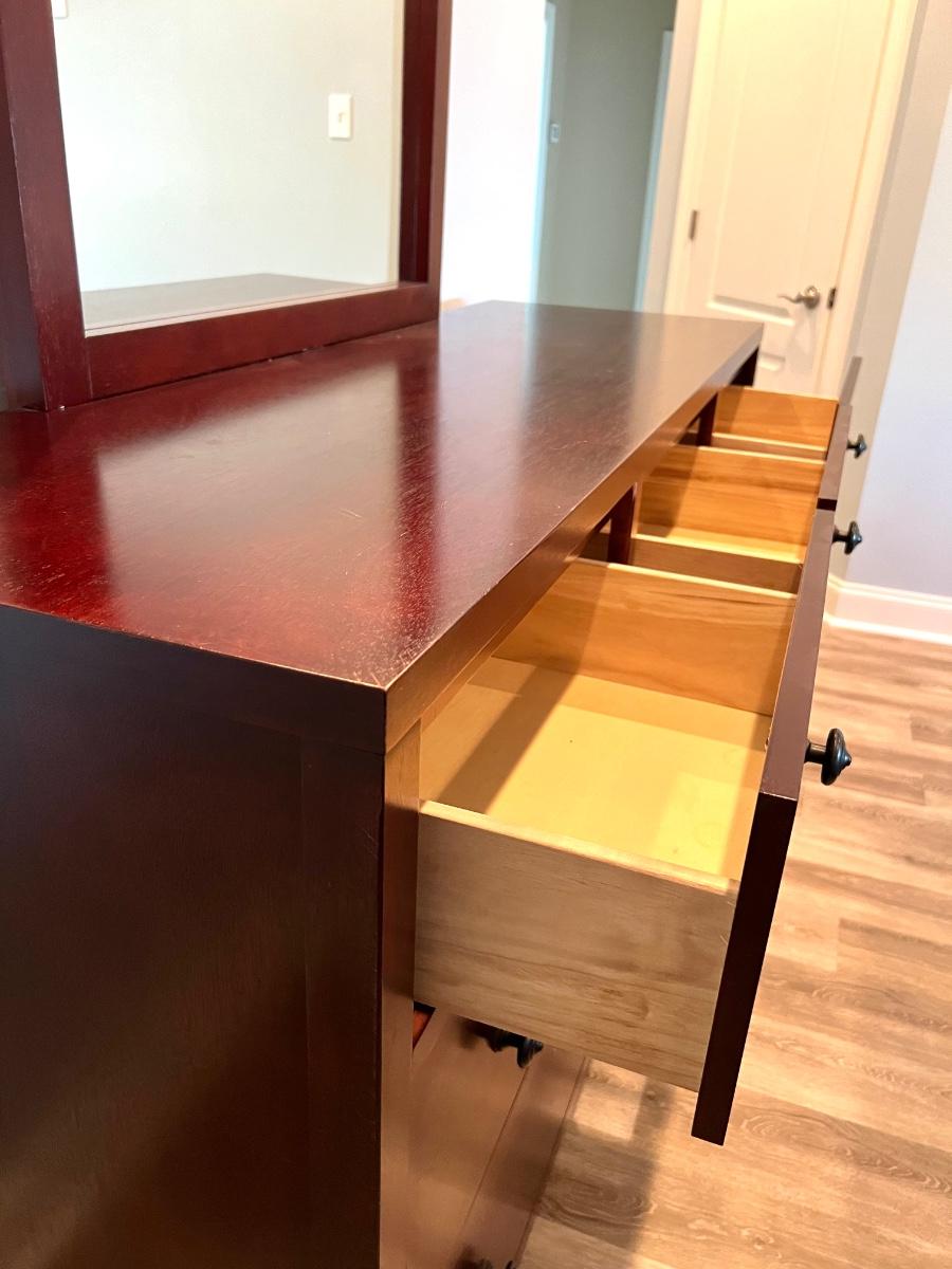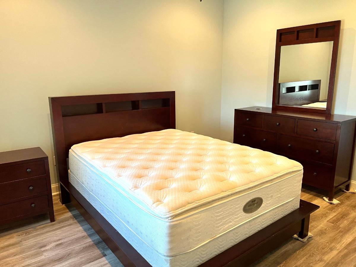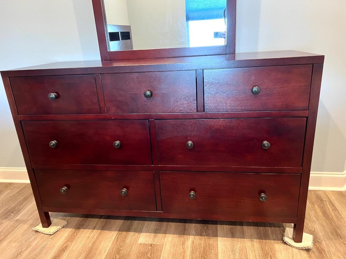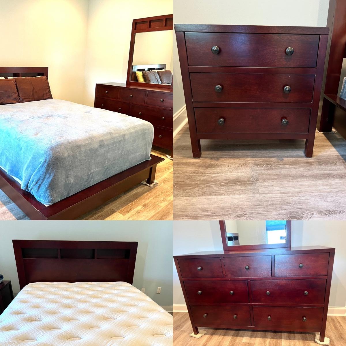 LY Furniture Cherry QUEEN Bedroom Set- Queen Bed, Night Stand and Triple Dresser. Nightstand Measures 28 inches wide, 28 inches tall and 18 inches deep. Triple Dresser measures 60 inches wide, 37 inches tall and 20 inches deeps . Mirror measures 34 inches wide and 46 inches tall. **Beautyrest mattress does have a stain on the bottom from a spill and a few other stains. Mattress has been sprayed with OdoBan and disinfected. Winning bidder may leave the mattress set if they choose.