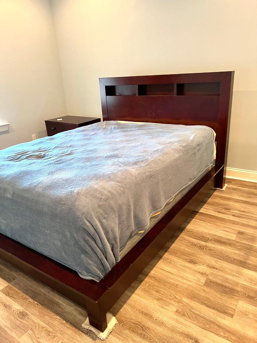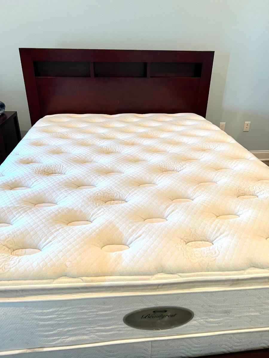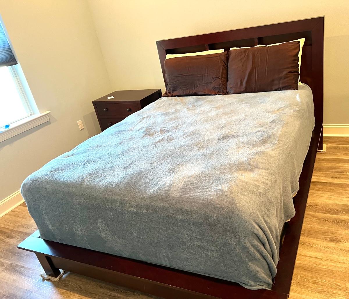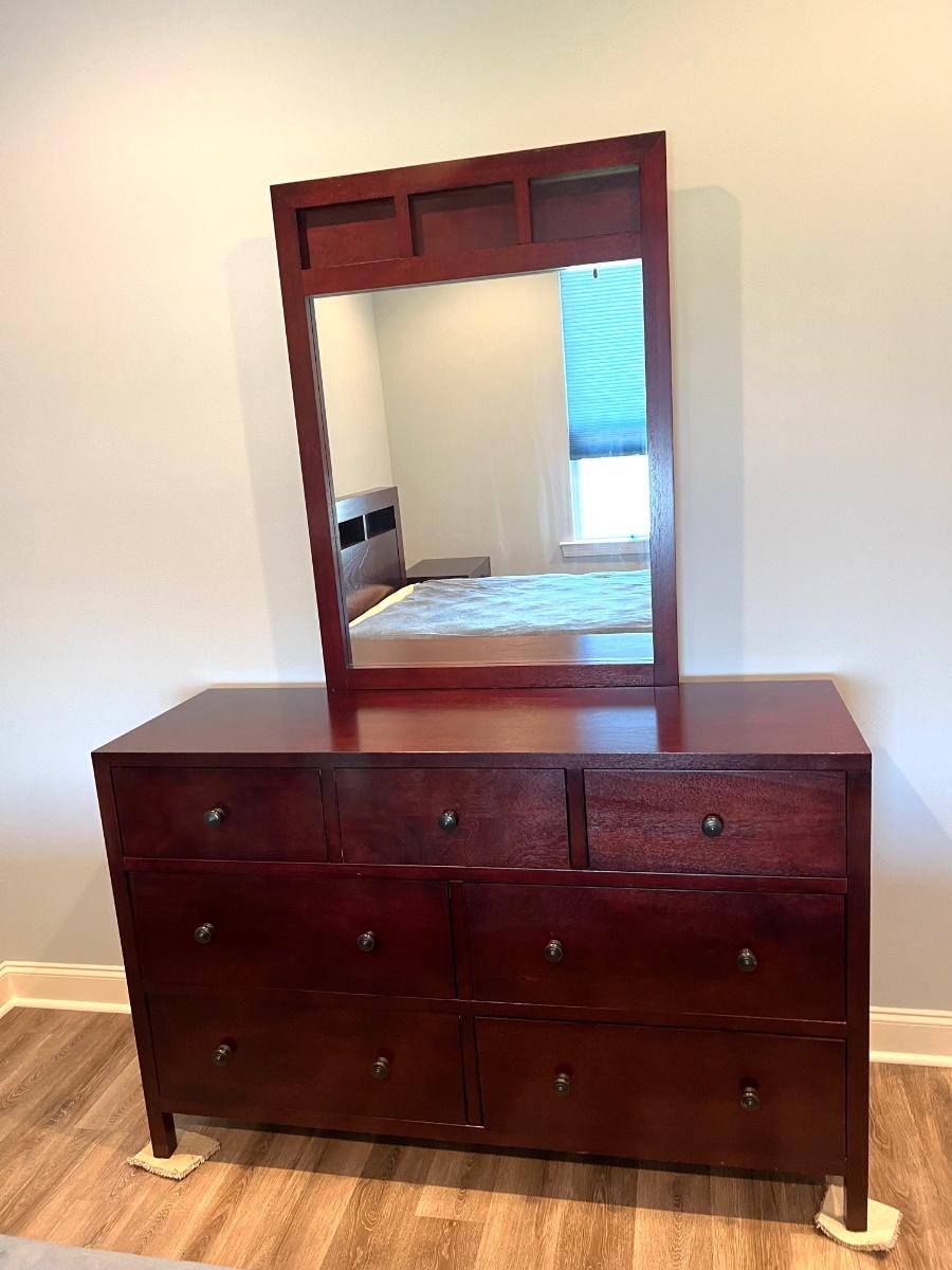 LY Furniture Cherry QUEEN Bedroom Set- Queen Bed, Night Stand and Triple Dresser. Nightstand Measures 28 inches wide, 28 inches tall and 18 inches deep. Triple Dresser measures 60 inches wide, 37 inches tall and 20 inches deeps . Mirror measures 34 inches wide and 46 inches tall. **Beautyrest mattress does have a stain on the bottom from a spill and a few other stains. Mattress has been sprayed with OdoBan and disinfected. Winning bidder may leave the mattress set if they choose.