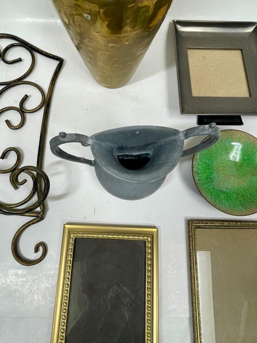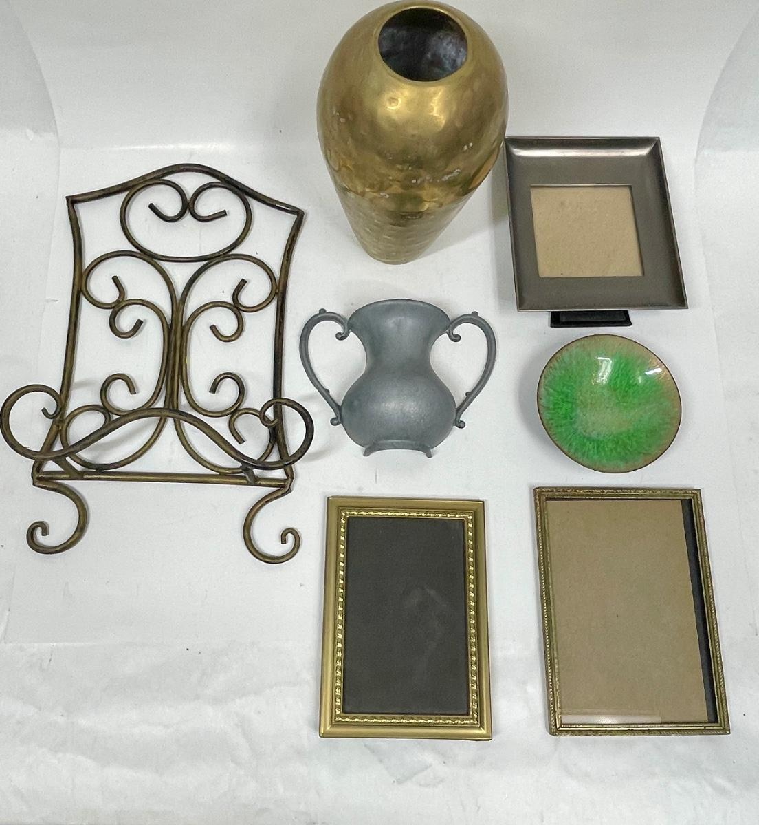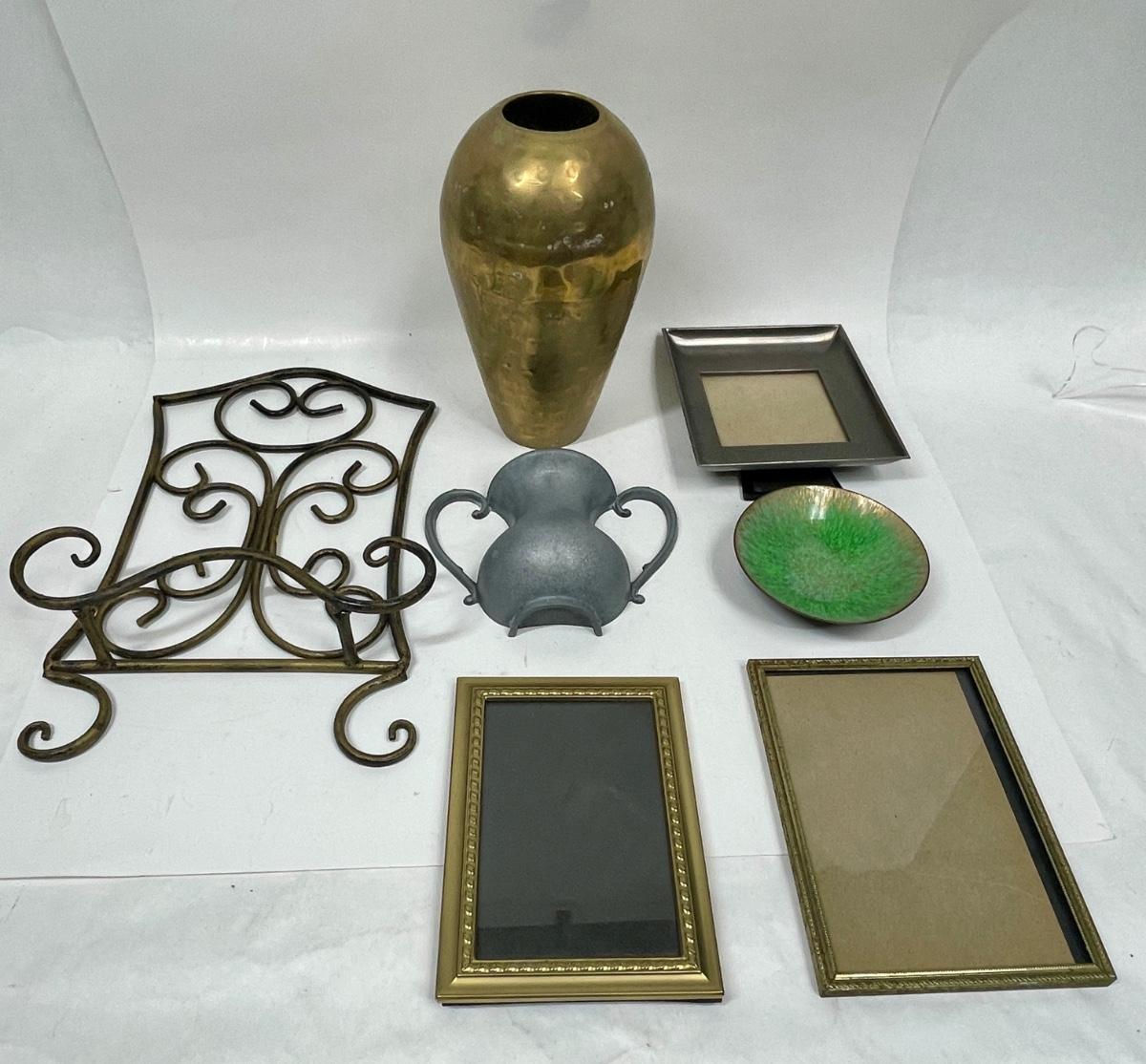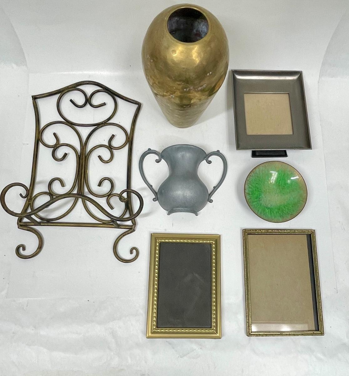 Wrought iron photo Frame stand, brass urn, 3 small photo frames, ceramic dish, and pewter relief handled jug wall decor. All in good condition.