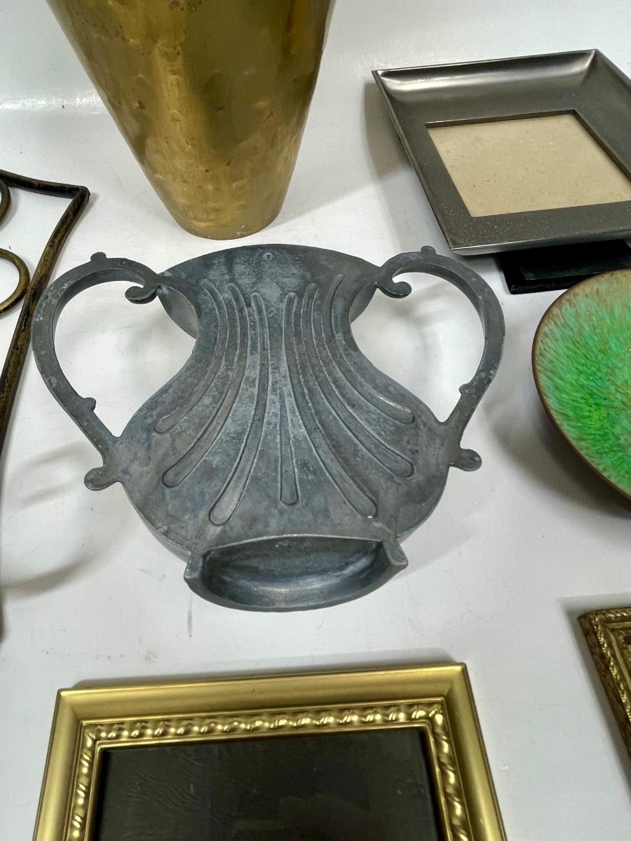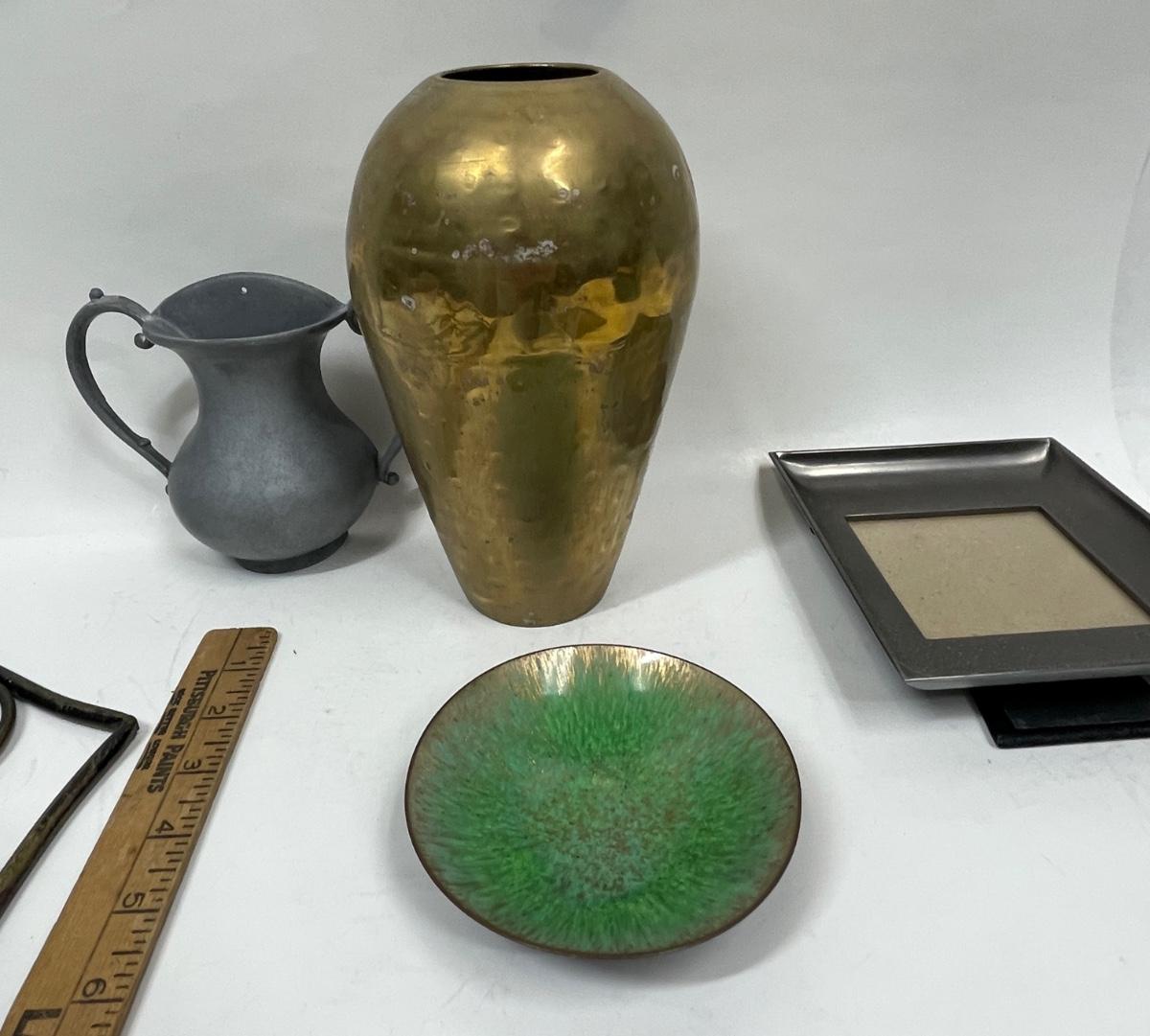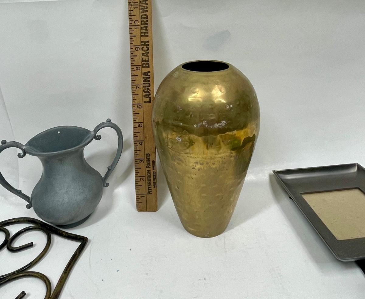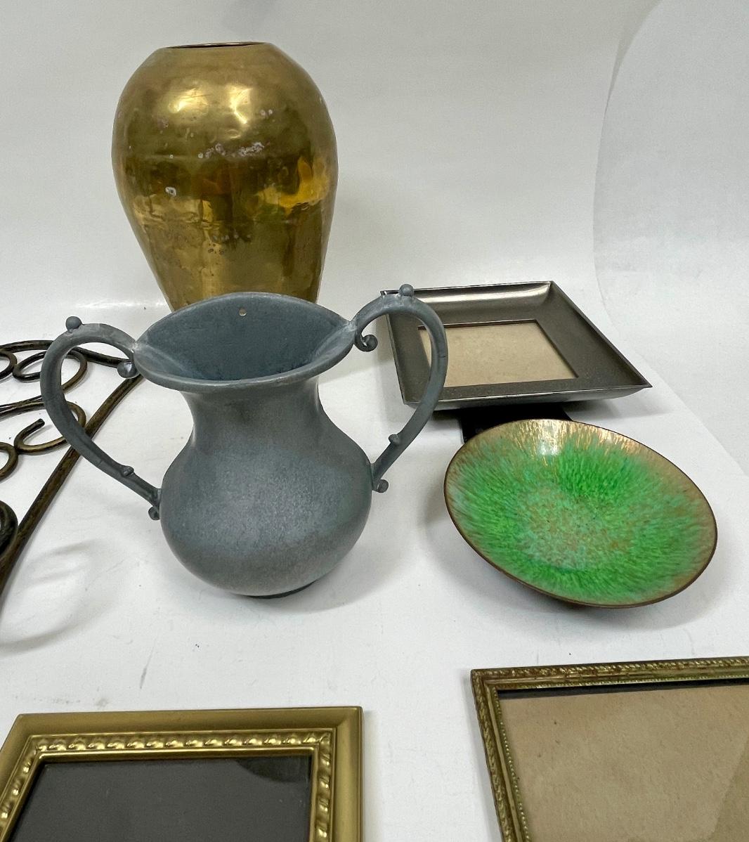 Wrought iron photo Frame stand, brass urn, 3 small photo frames, ceramic dish, and pewter relief handled jug wall decor. All in good condition.