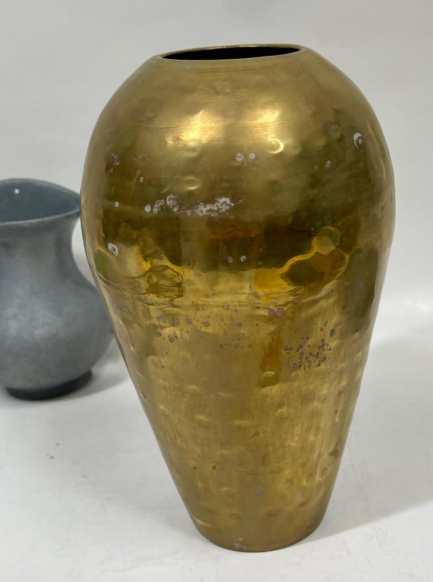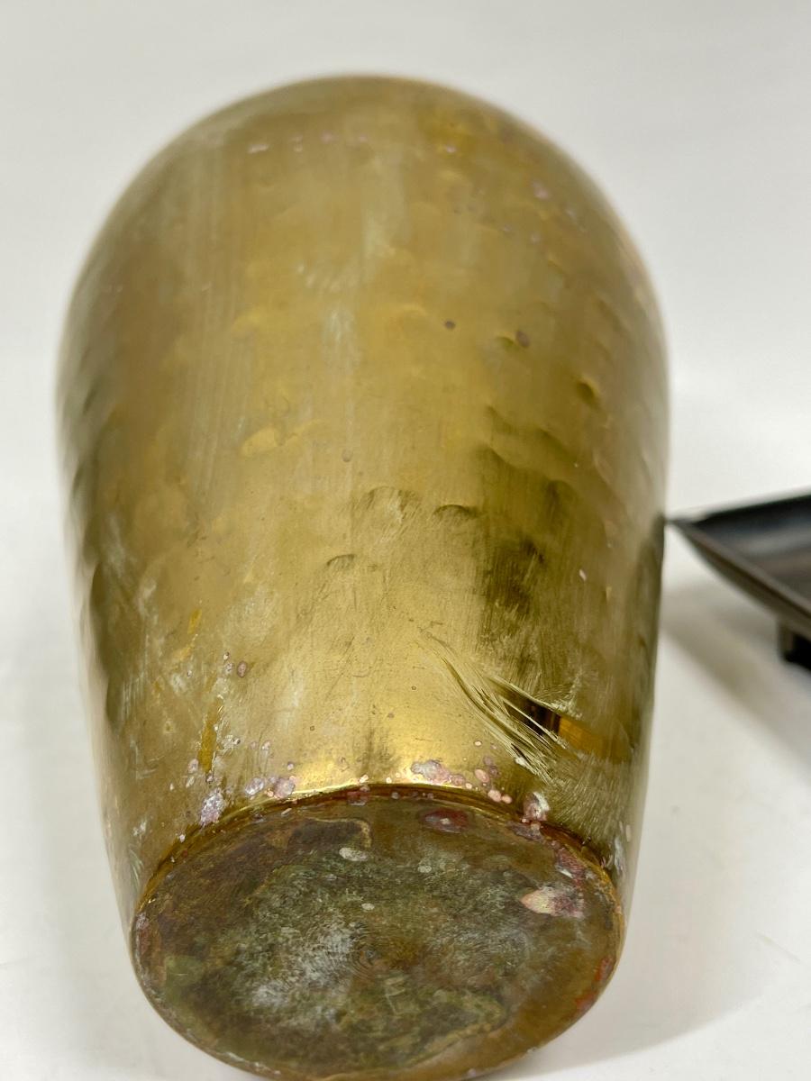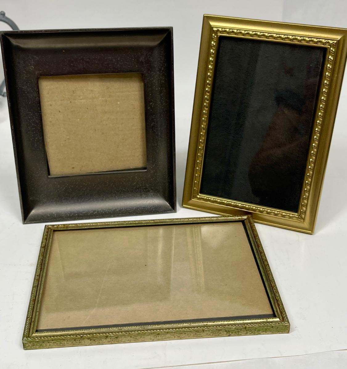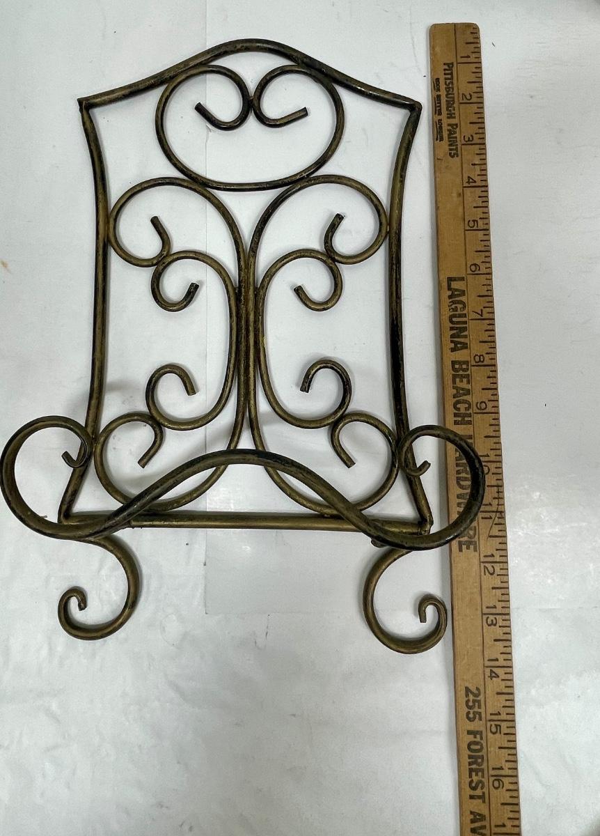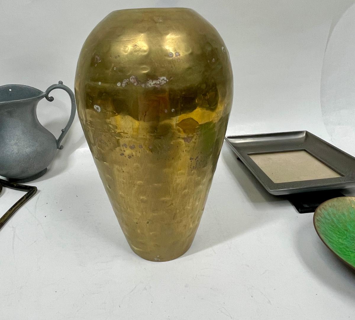 Wrought iron photo Frame stand, brass urn, 3 small photo frames, ceramic dish, and pewter relief handled jug wall decor. All in good condition.