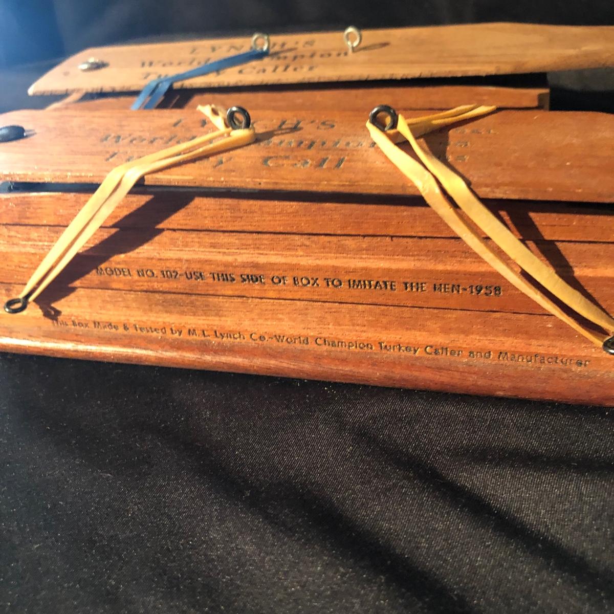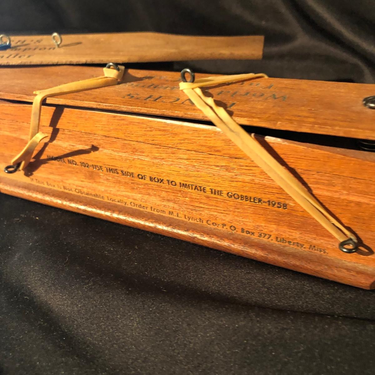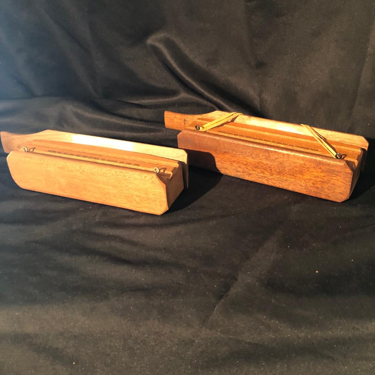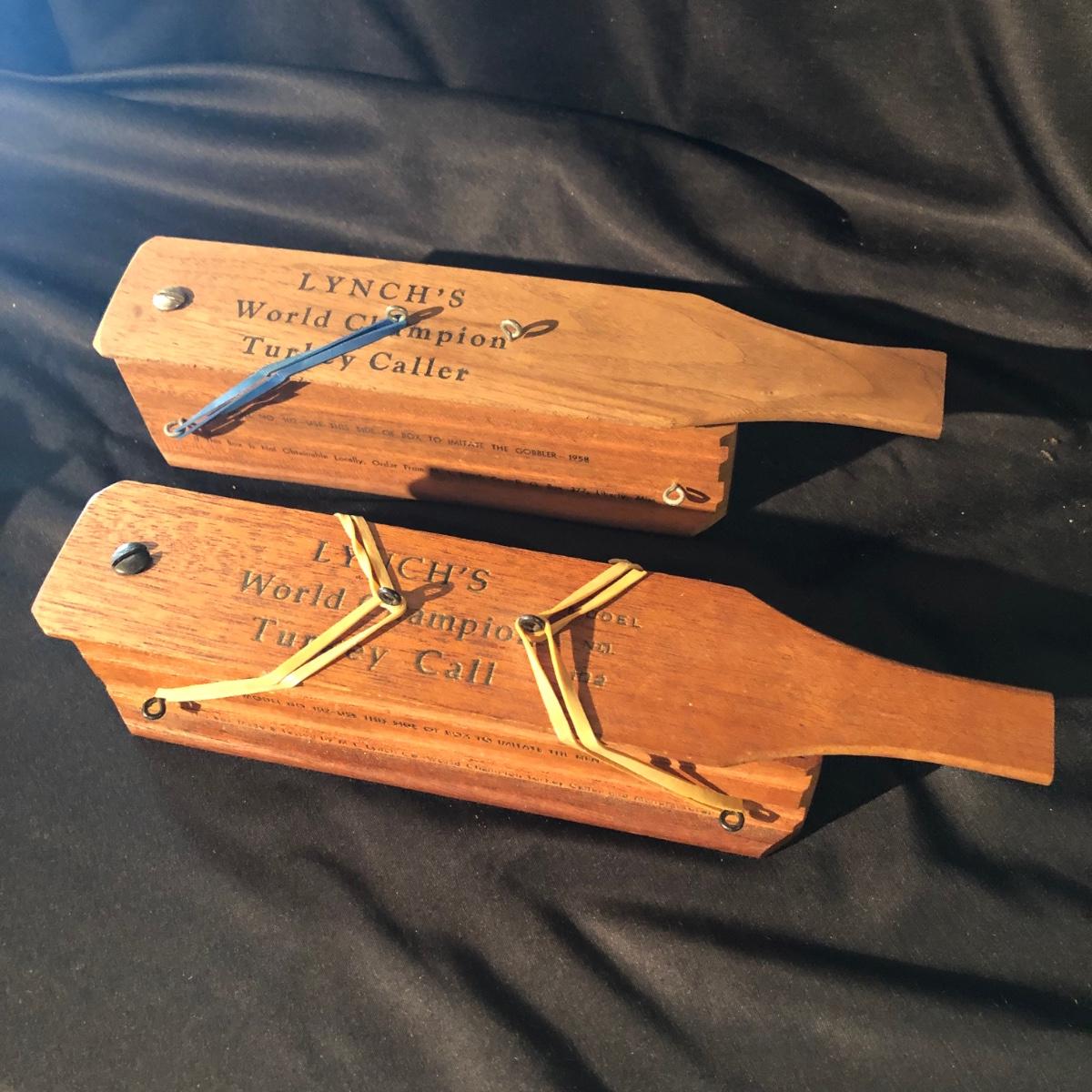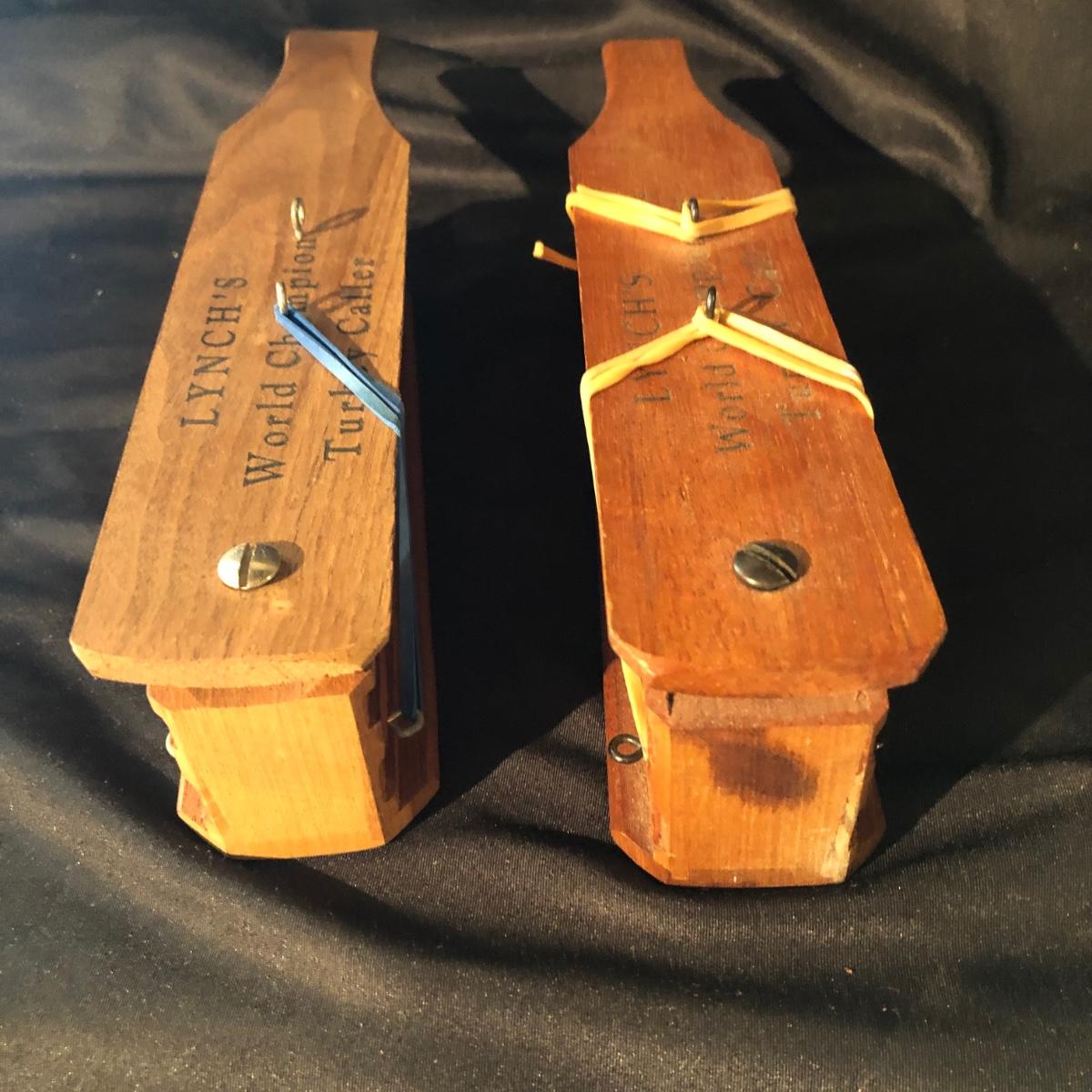 These two wooden Turkey callers make loud Turkey noises. One looks as if it is missing a rubber band. They measure 9.5” x 2” x 2”. Shipping Available.