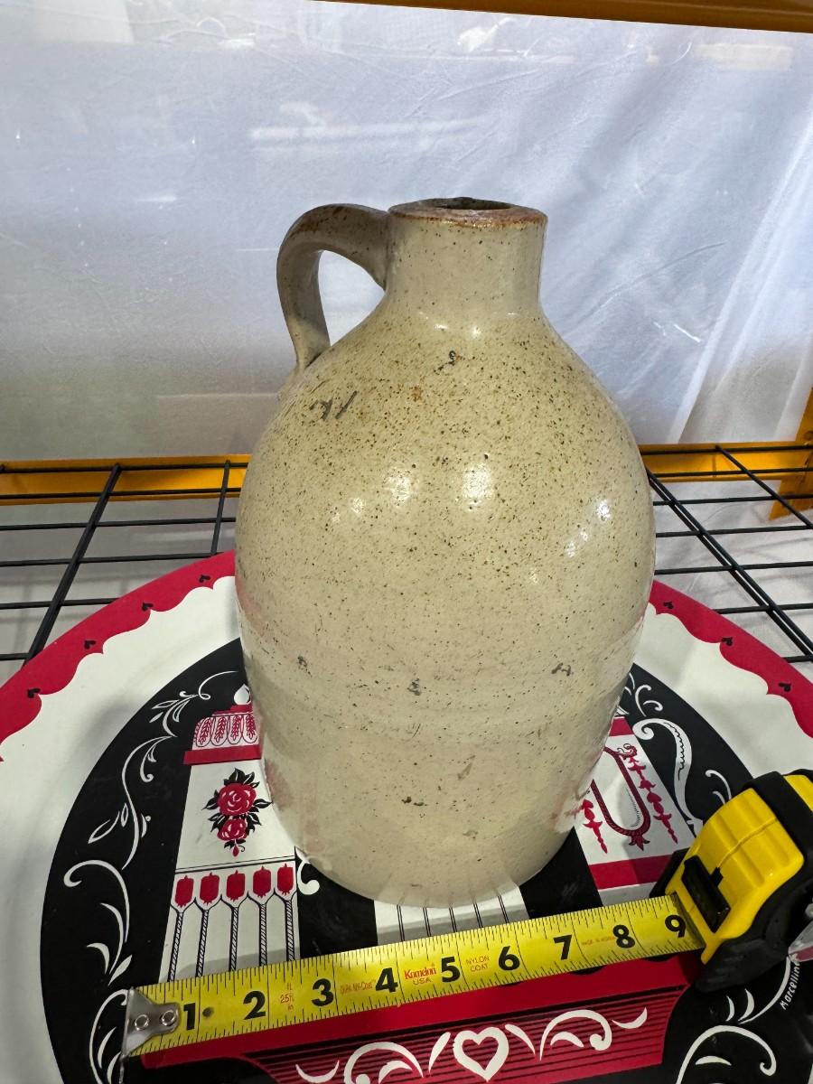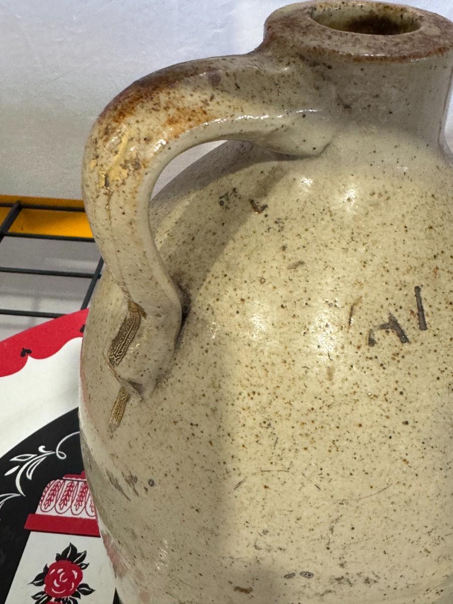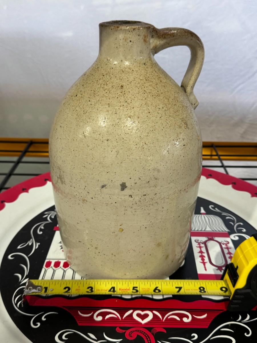 primitive stoneware jug, likely an antique piece used historically for storing various liquids like water, milk, or spirits.