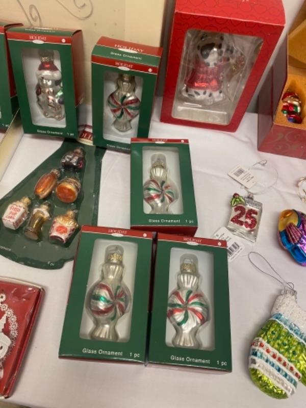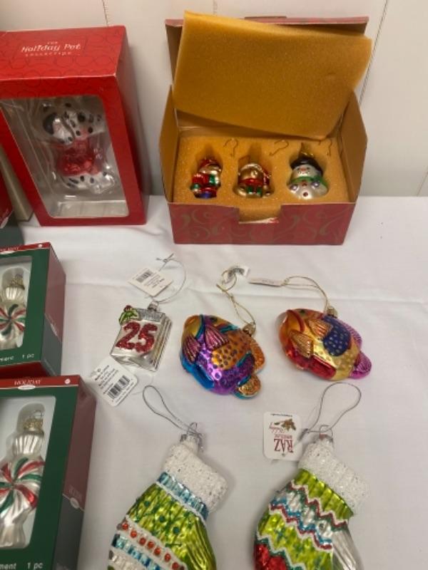 Holiday ornaments with tree candy, fish, dalmatian dog, Santa, mittens