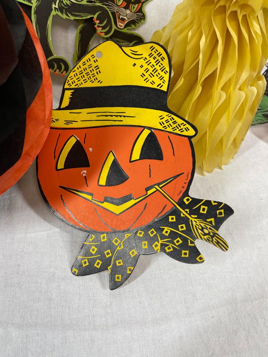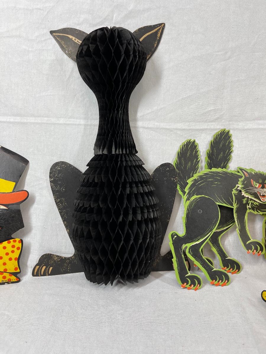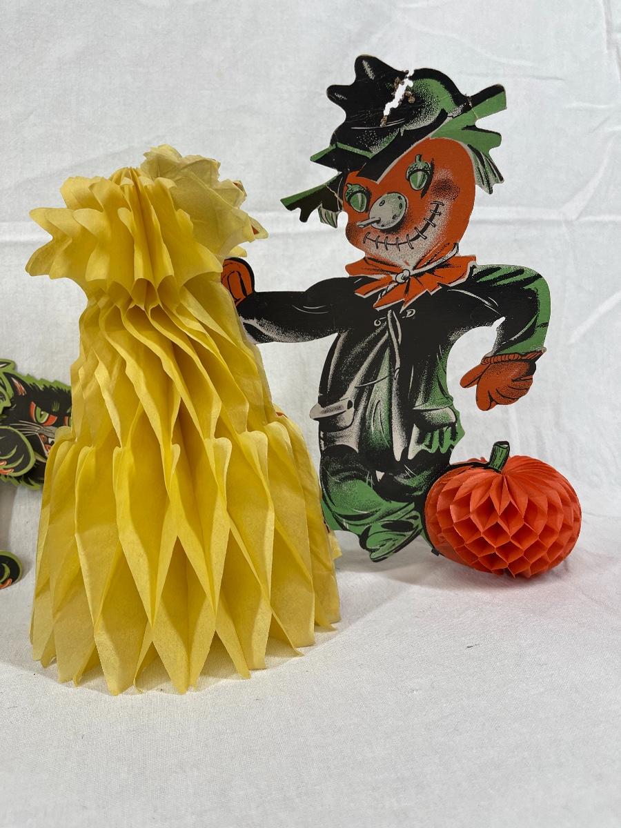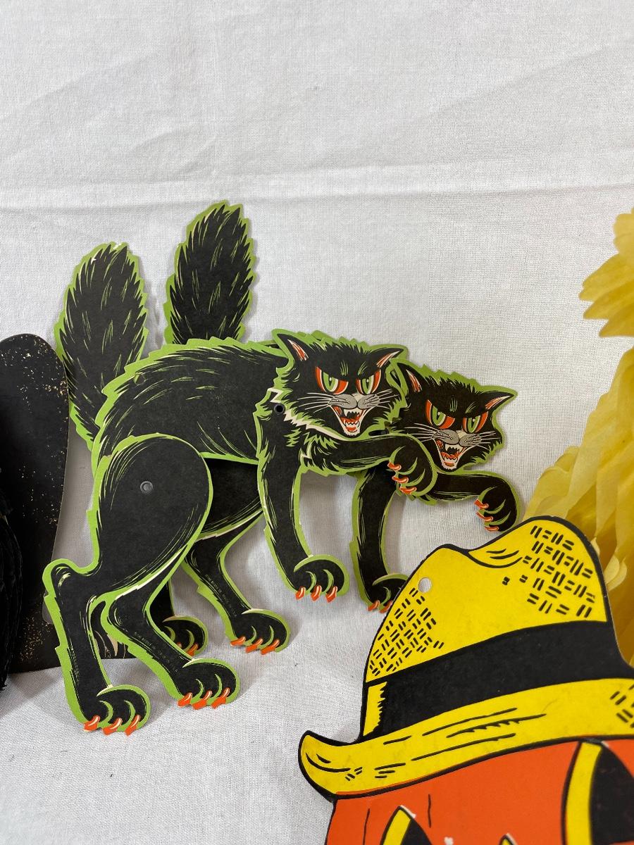 Vintage Halloween paper party decoration lot. Black cats, scarecrows, and pumpkins. Good vintage condition.