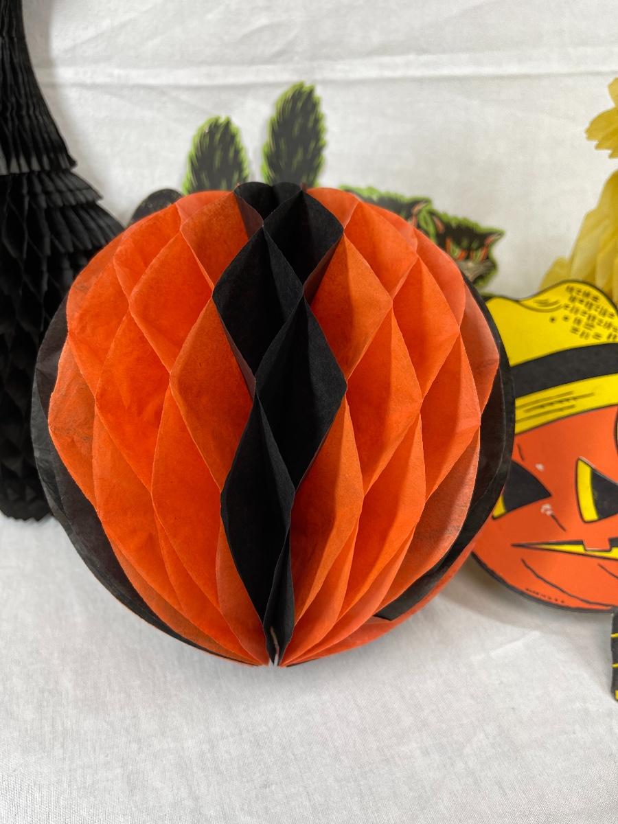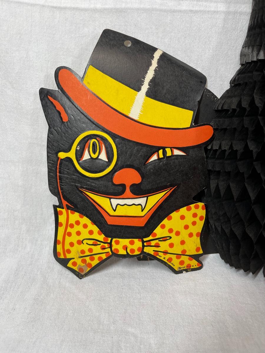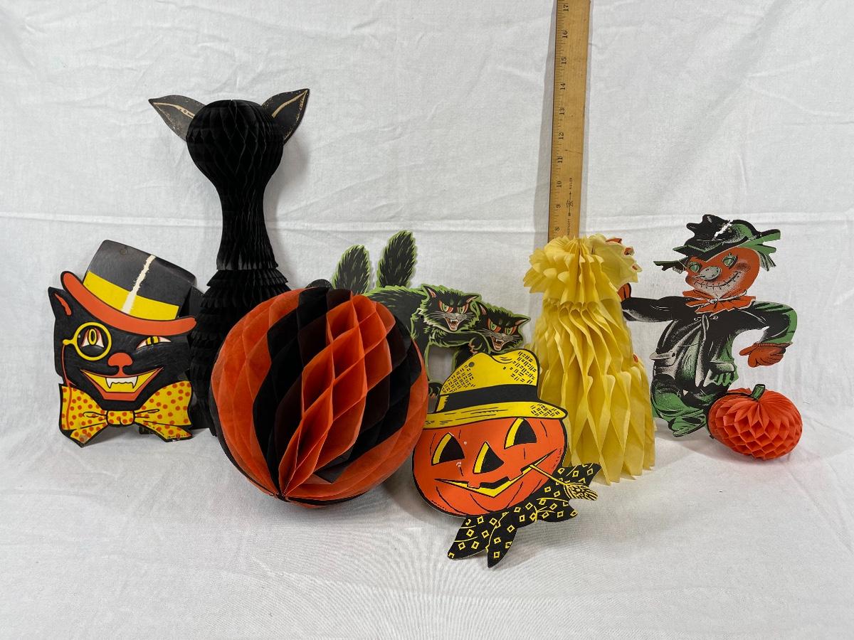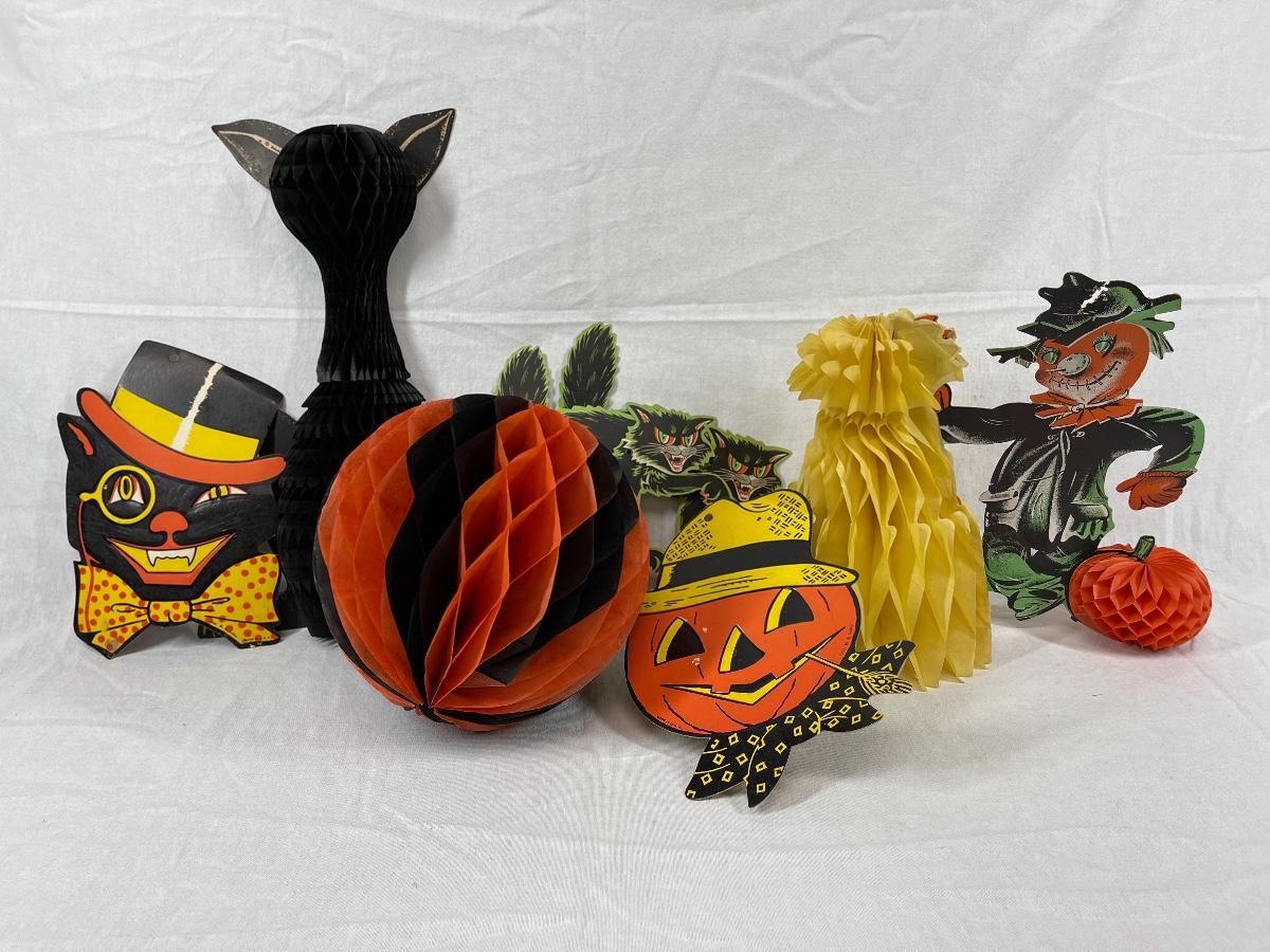 Vintage Halloween paper party decoration lot. Black cats, scarecrows, and pumpkins. Good vintage condition.