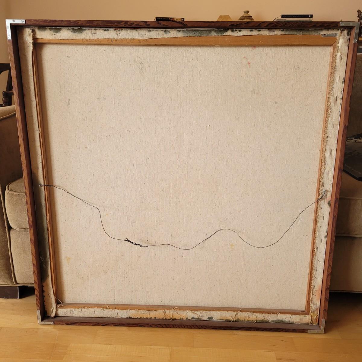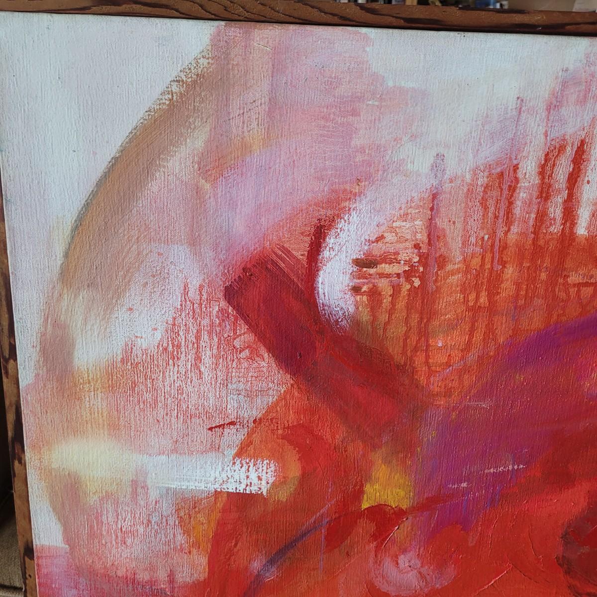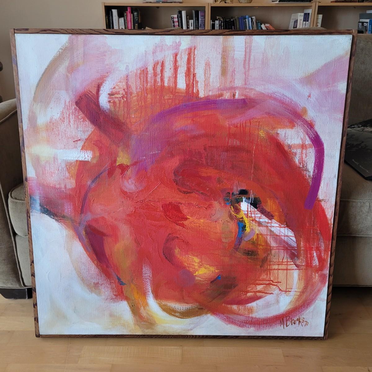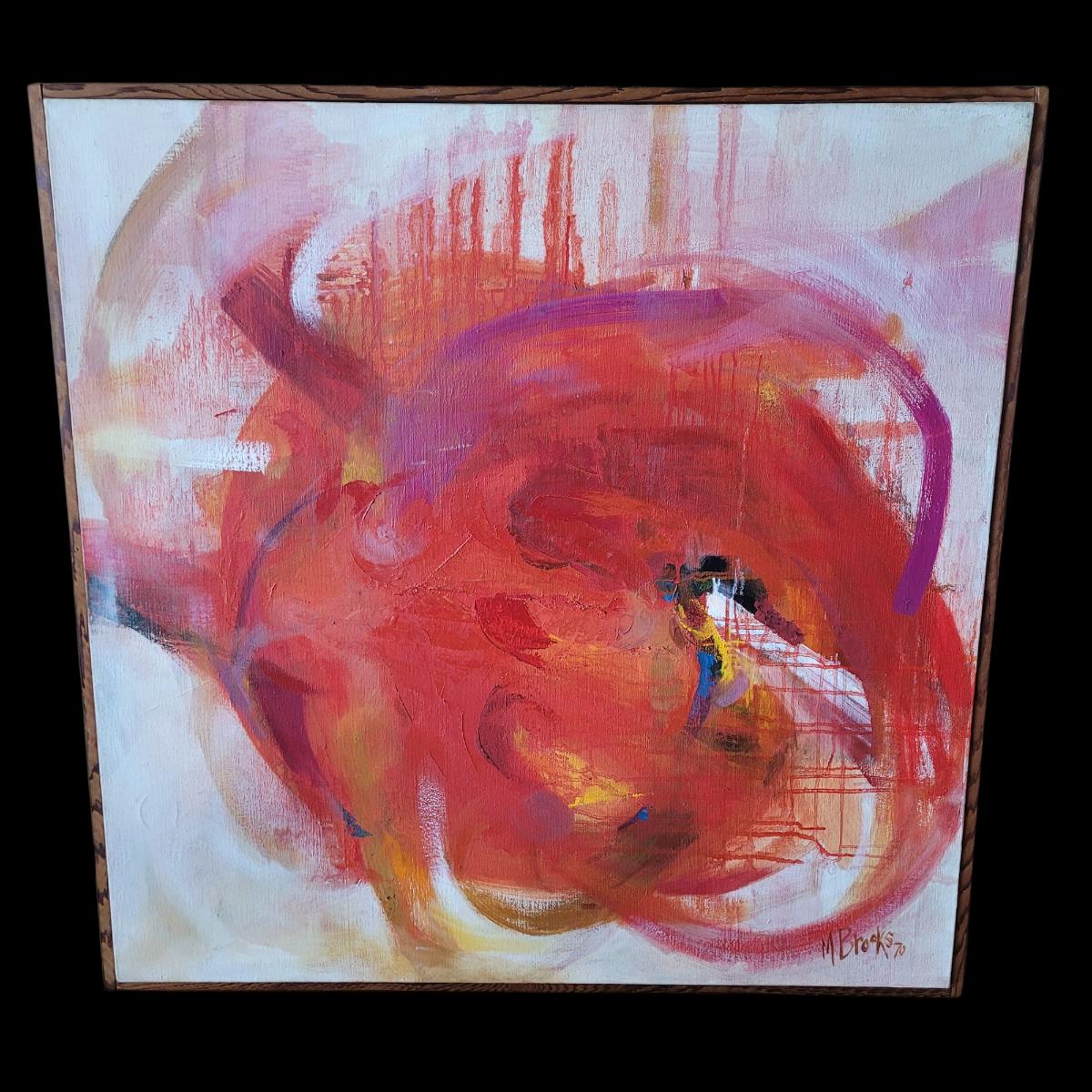 This lot includes an original painting signed "M. Brooks 70". It depicts abstract shapes in red, pink, orange, white, yellow, and blue. The piece is on canvas and framed in wood that measures 35.5" x 38"H. It is signed in paint in the bottom right corner.