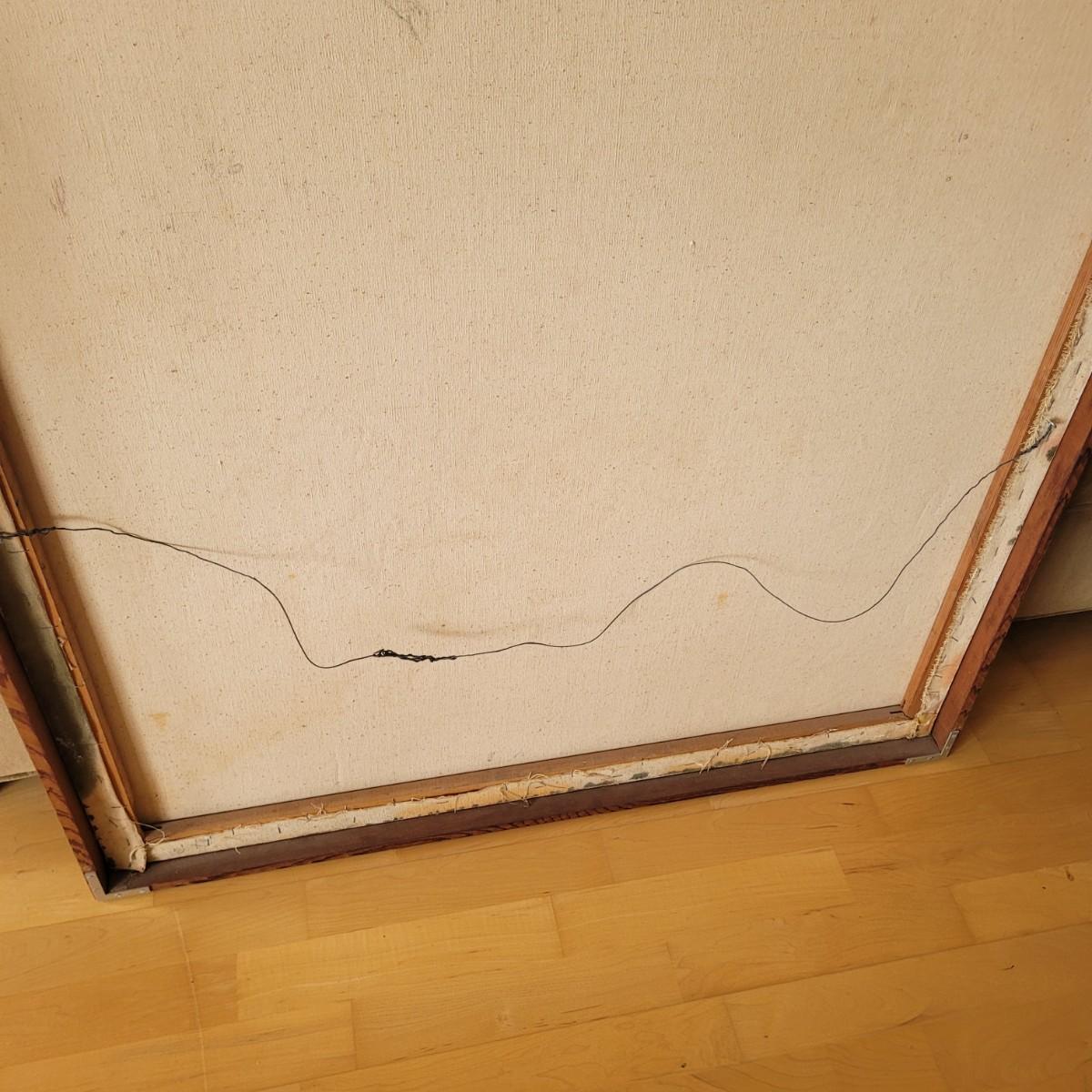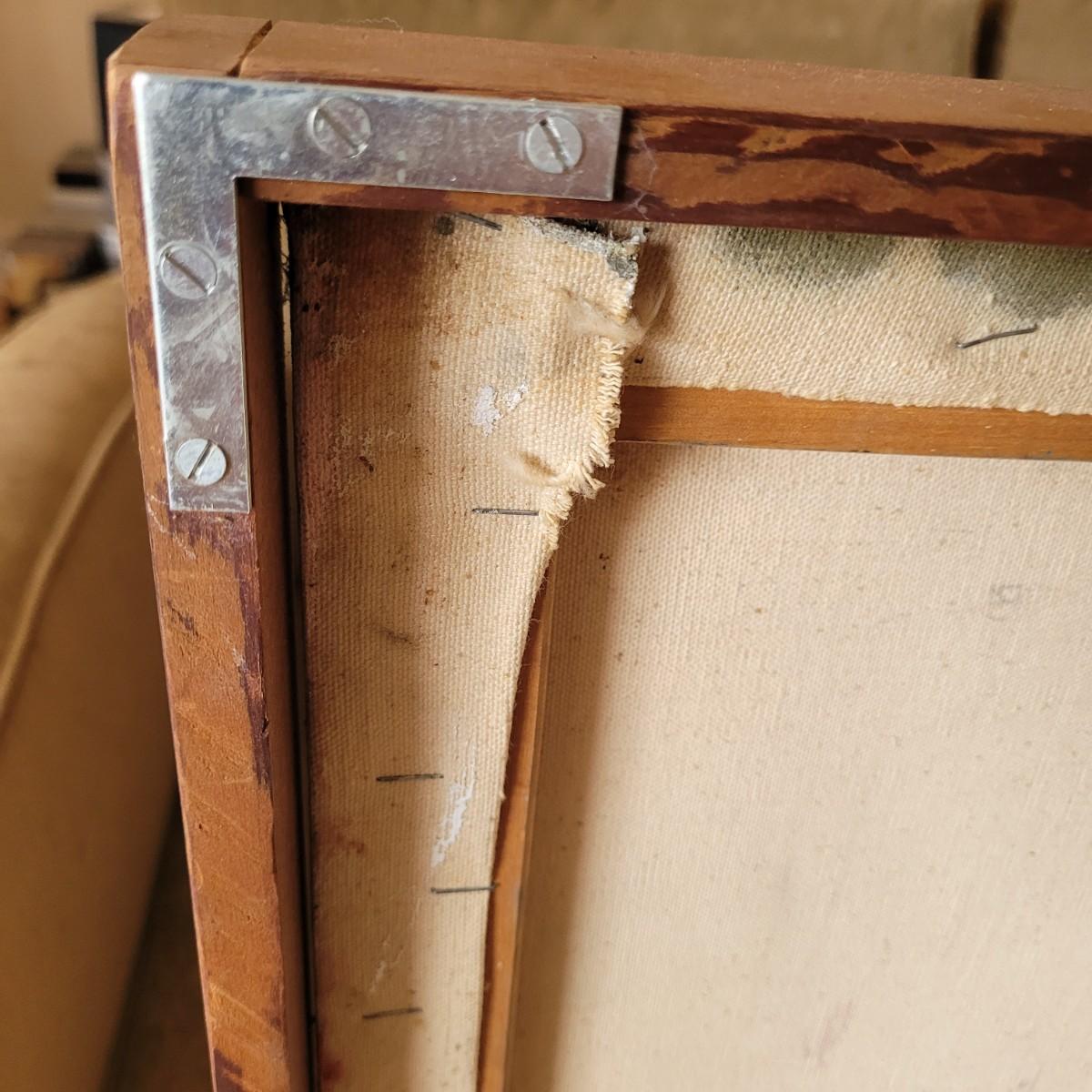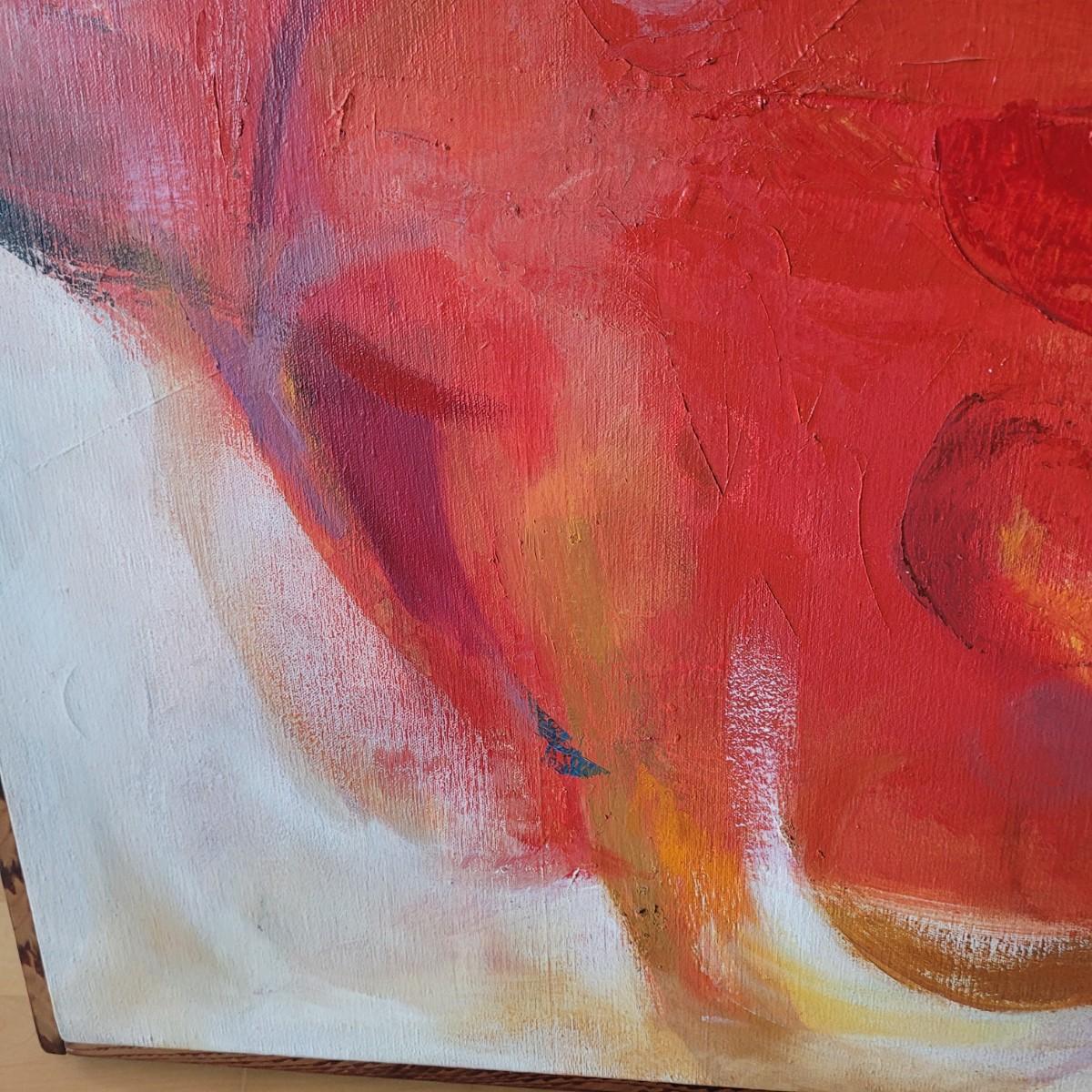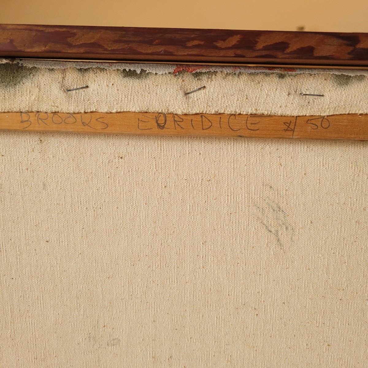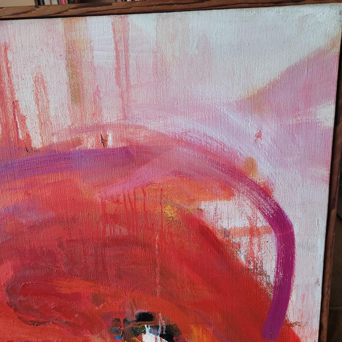 This lot includes an original painting signed "M. Brooks 70". It depicts abstract shapes in red, pink, orange, white, yellow, and blue. The piece is on canvas and framed in wood that measures 35.5" x 38"H. It is signed in paint in the bottom right corner.