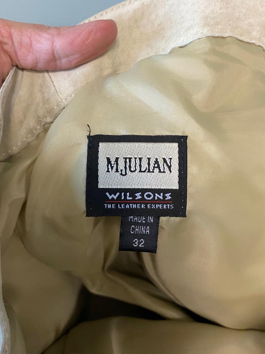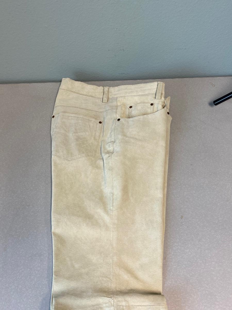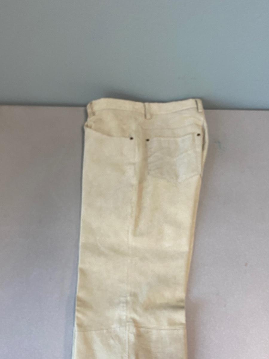 M. Julian for Wilsons off white/cream colored suede leather pants. Size 32. In good worn condition, no spots or stains. May have light wear to the leather.
