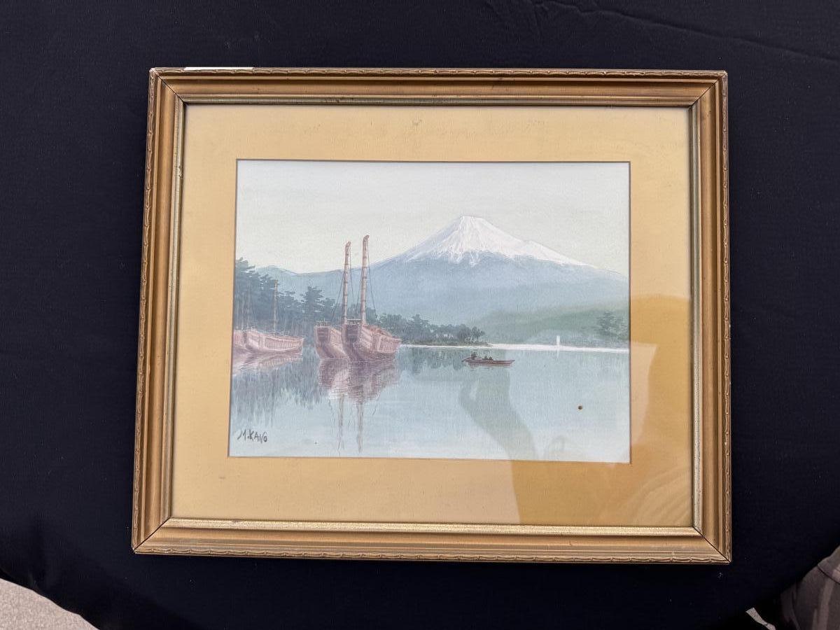framed and matted. several boats in the forefront on the lake. Overall measurements 14 1/2 “x 17 1/2”
