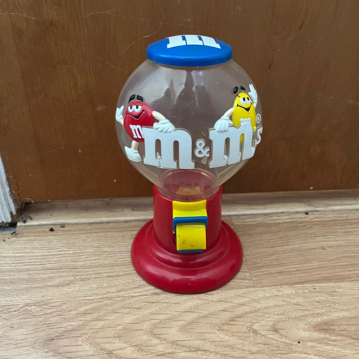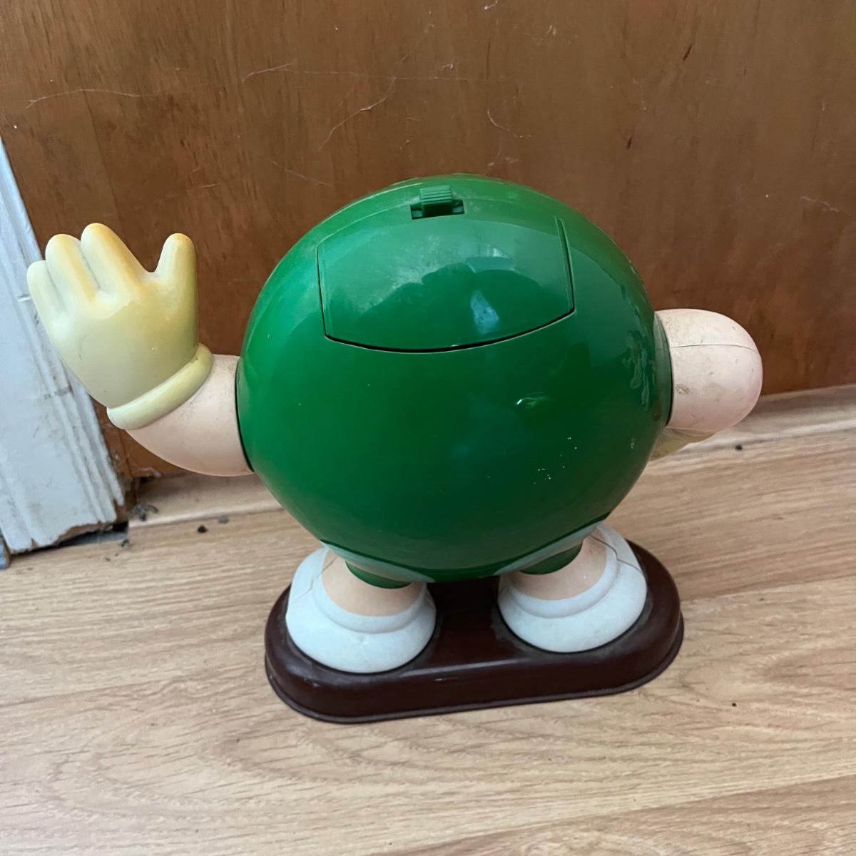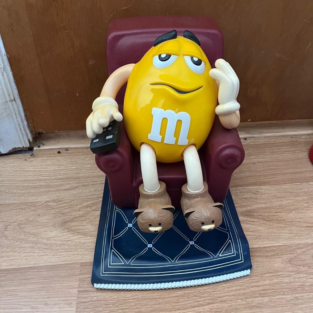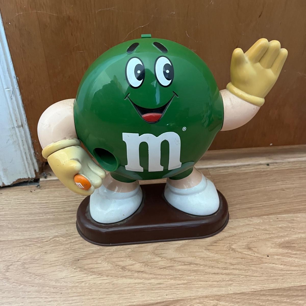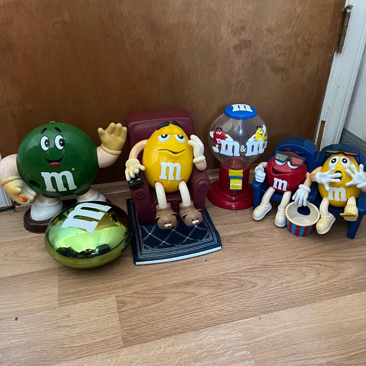 Lot includes four M & M candy dispensers and an M & M shaped container. Largest dispenser measures 7” x 9” x 8”.