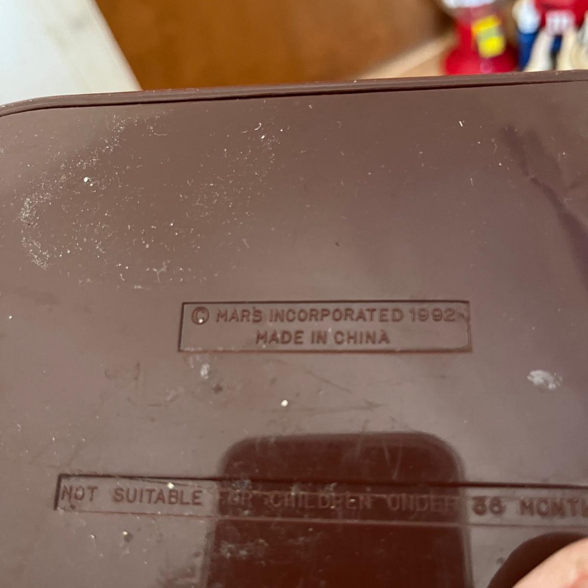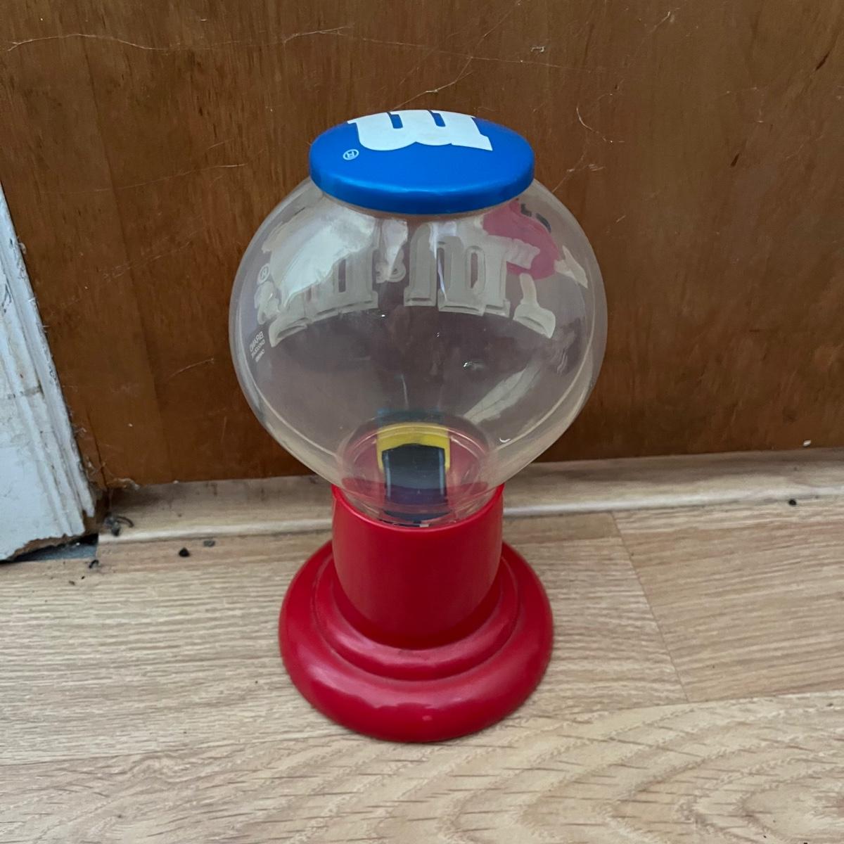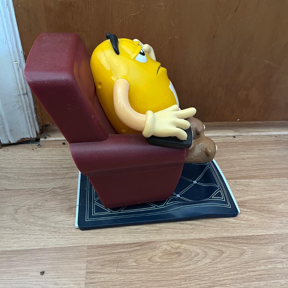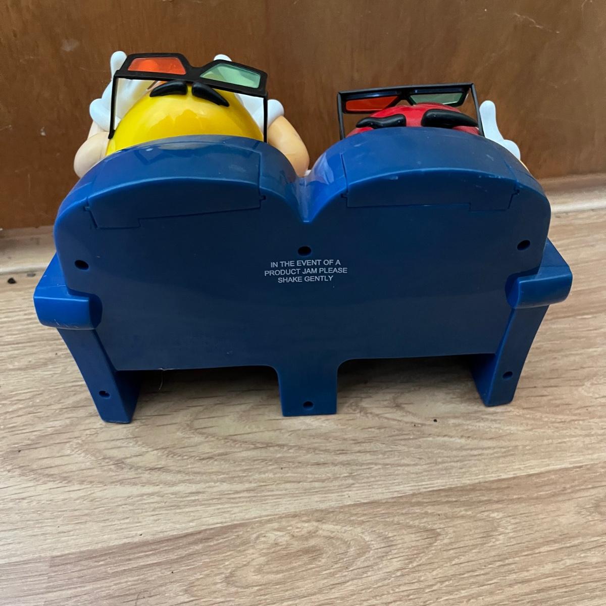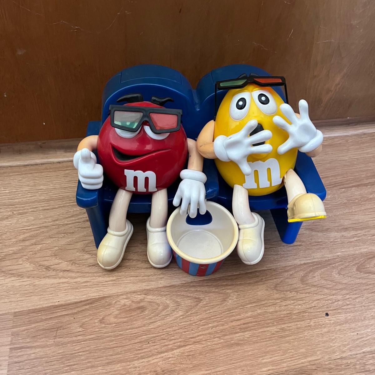 Lot includes four M & M candy dispensers and an M & M shaped container. Largest dispenser measures 7” x 9” x 8”.