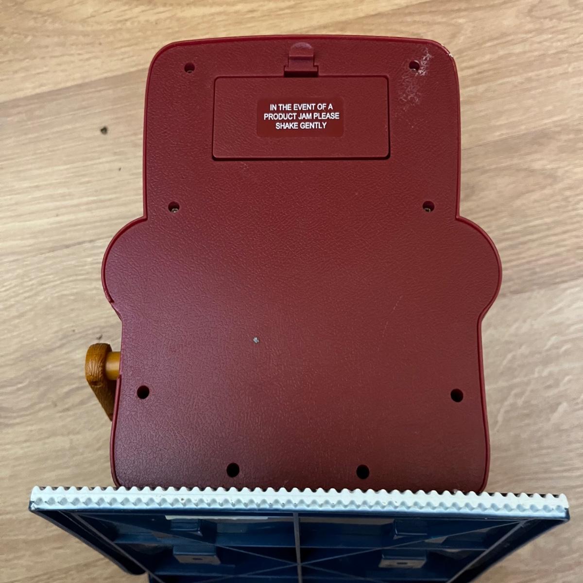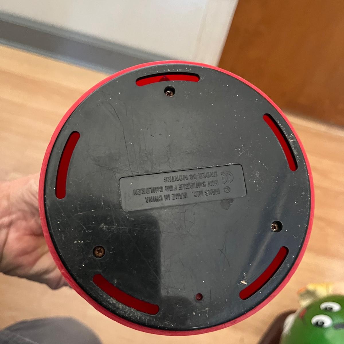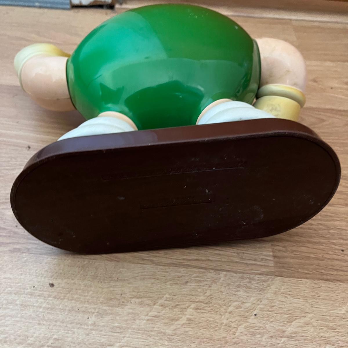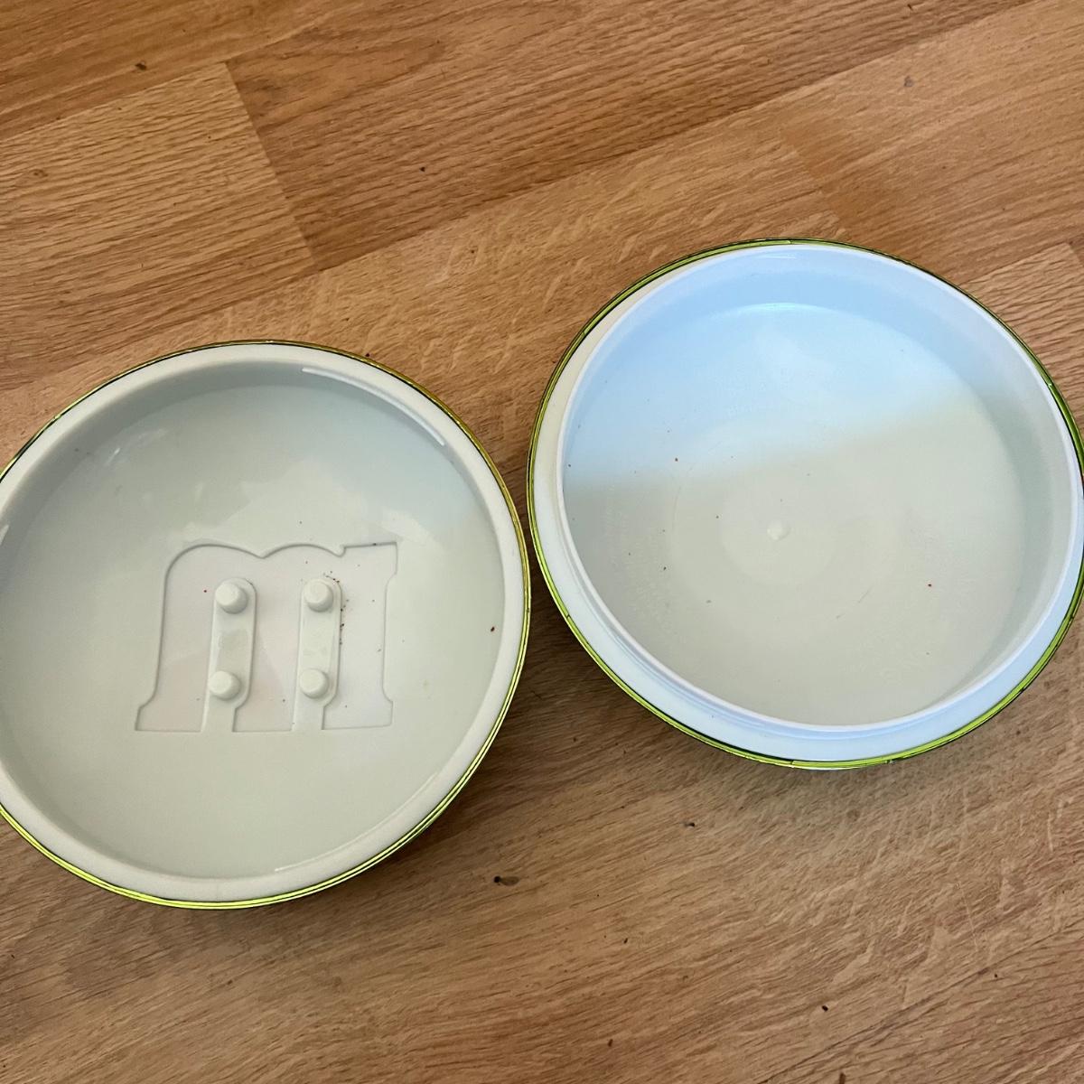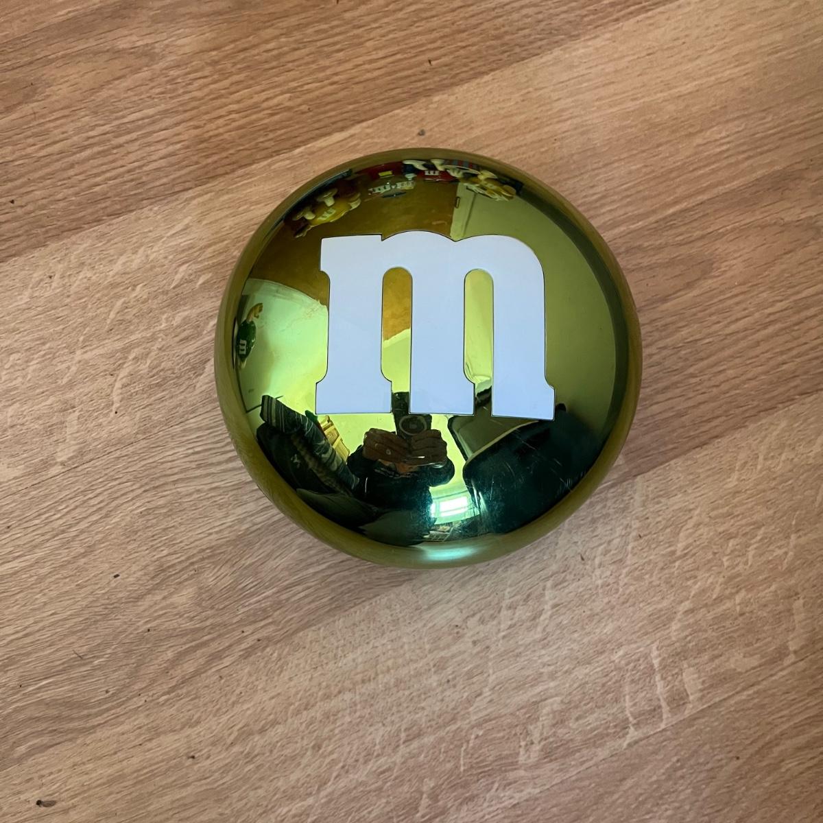 Lot includes four M & M candy dispensers and an M & M shaped container. Largest dispenser measures 7” x 9” x 8”.