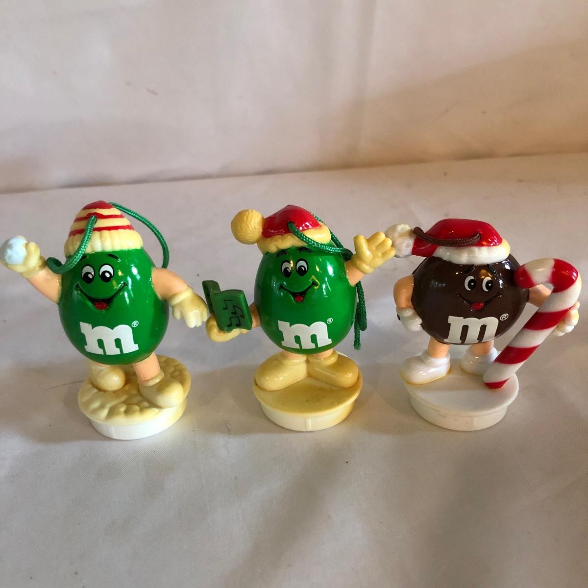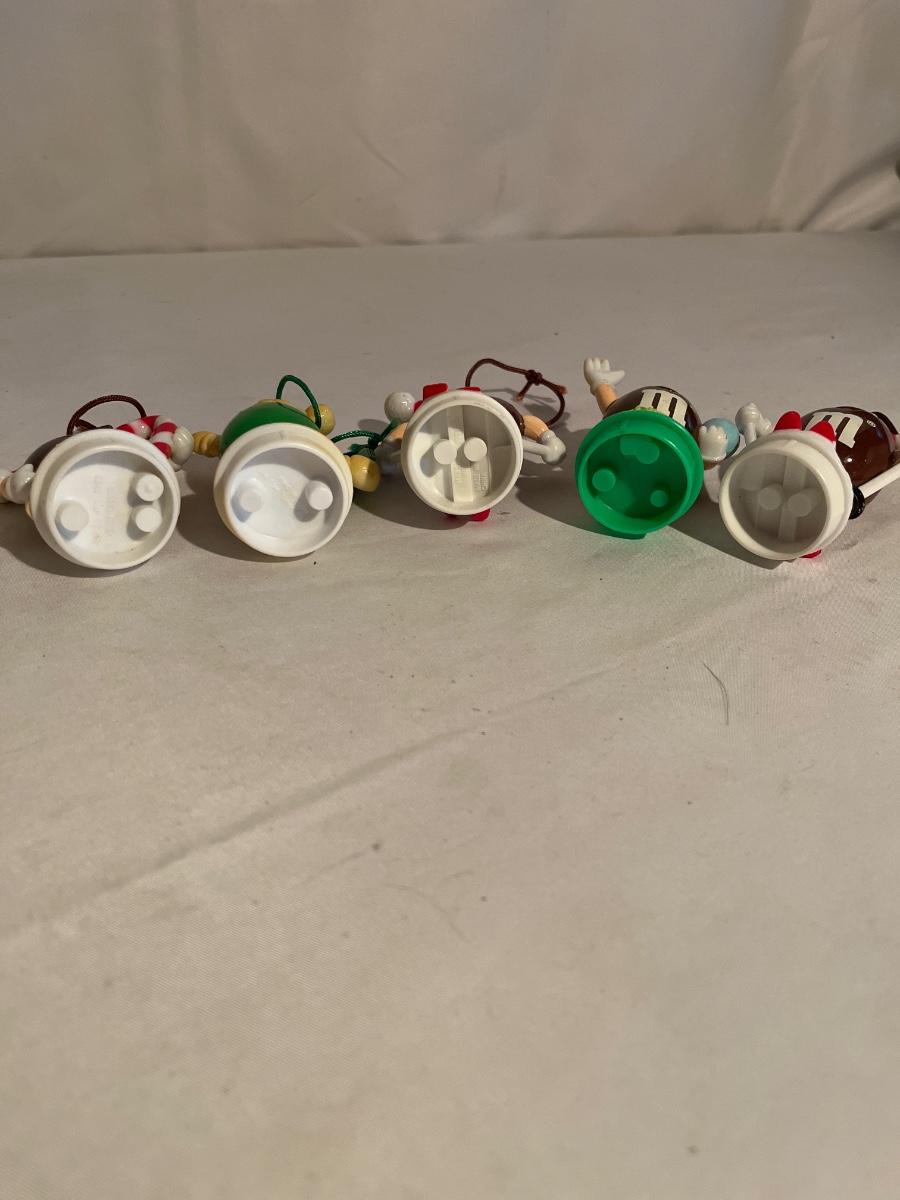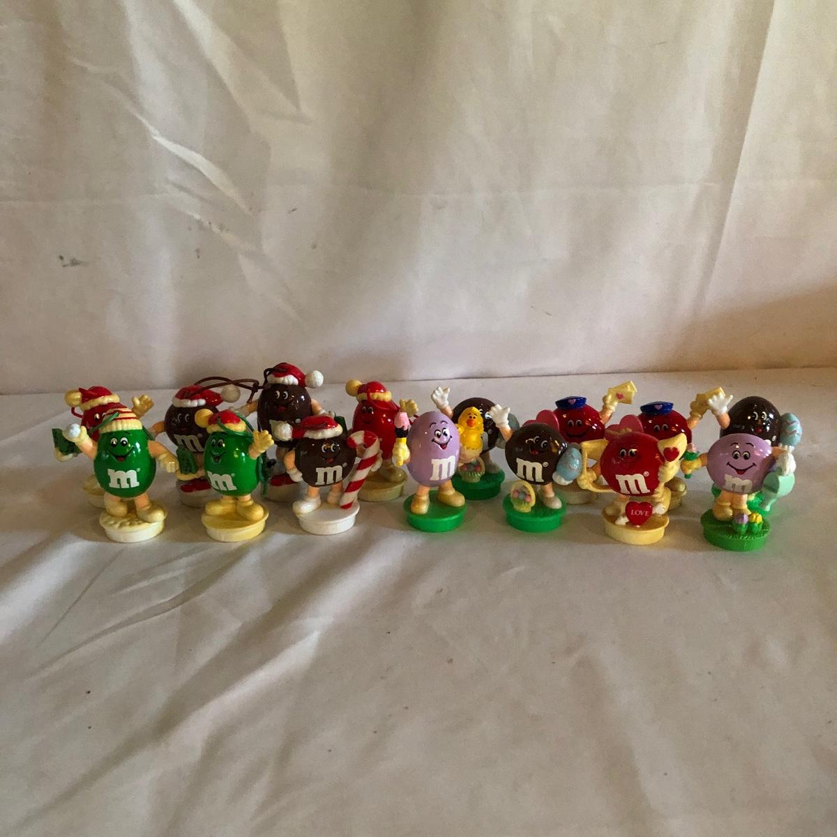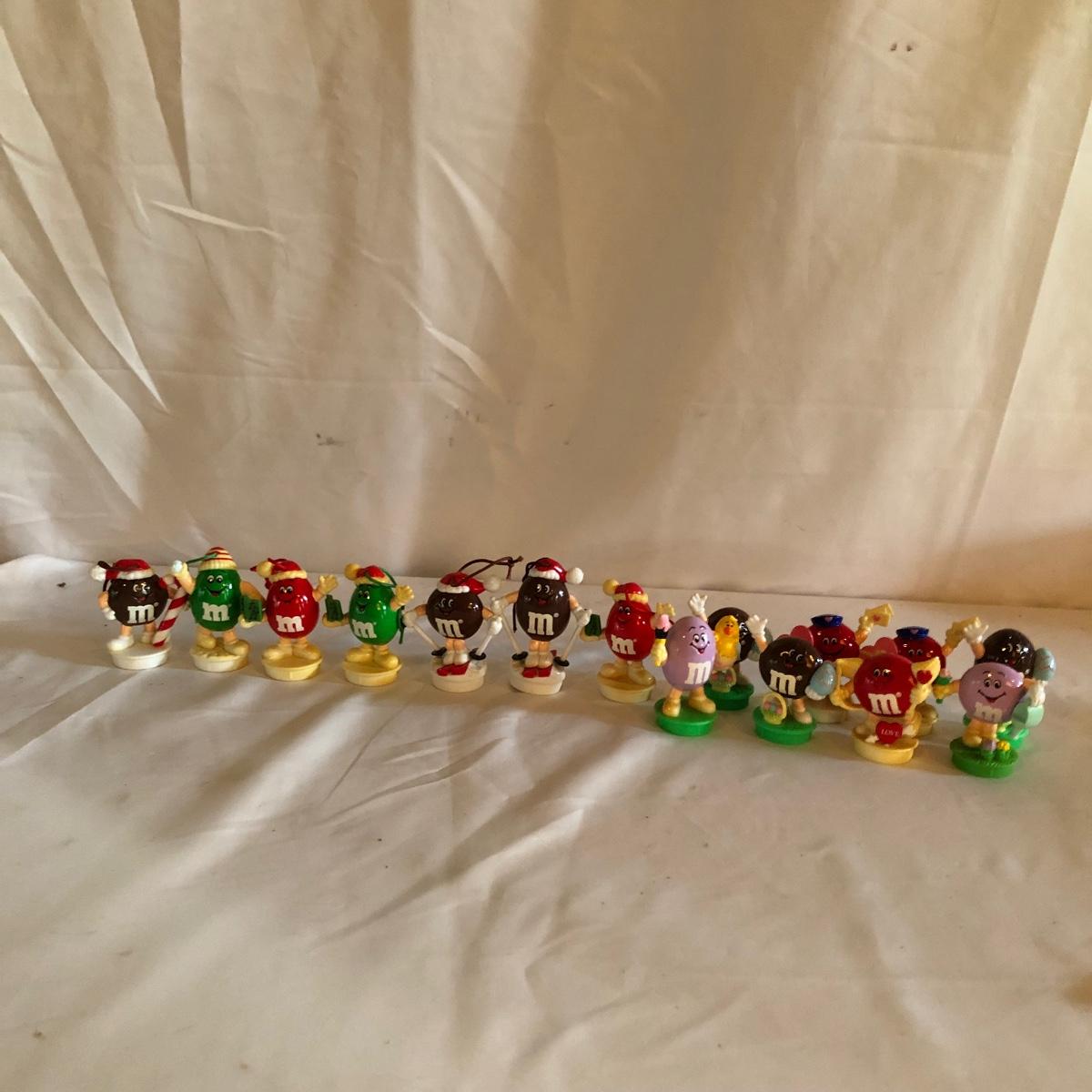 Lot includes seven M & M ornaments and and eight display M & Ms from different holidays. M & Ms are 3” tall.