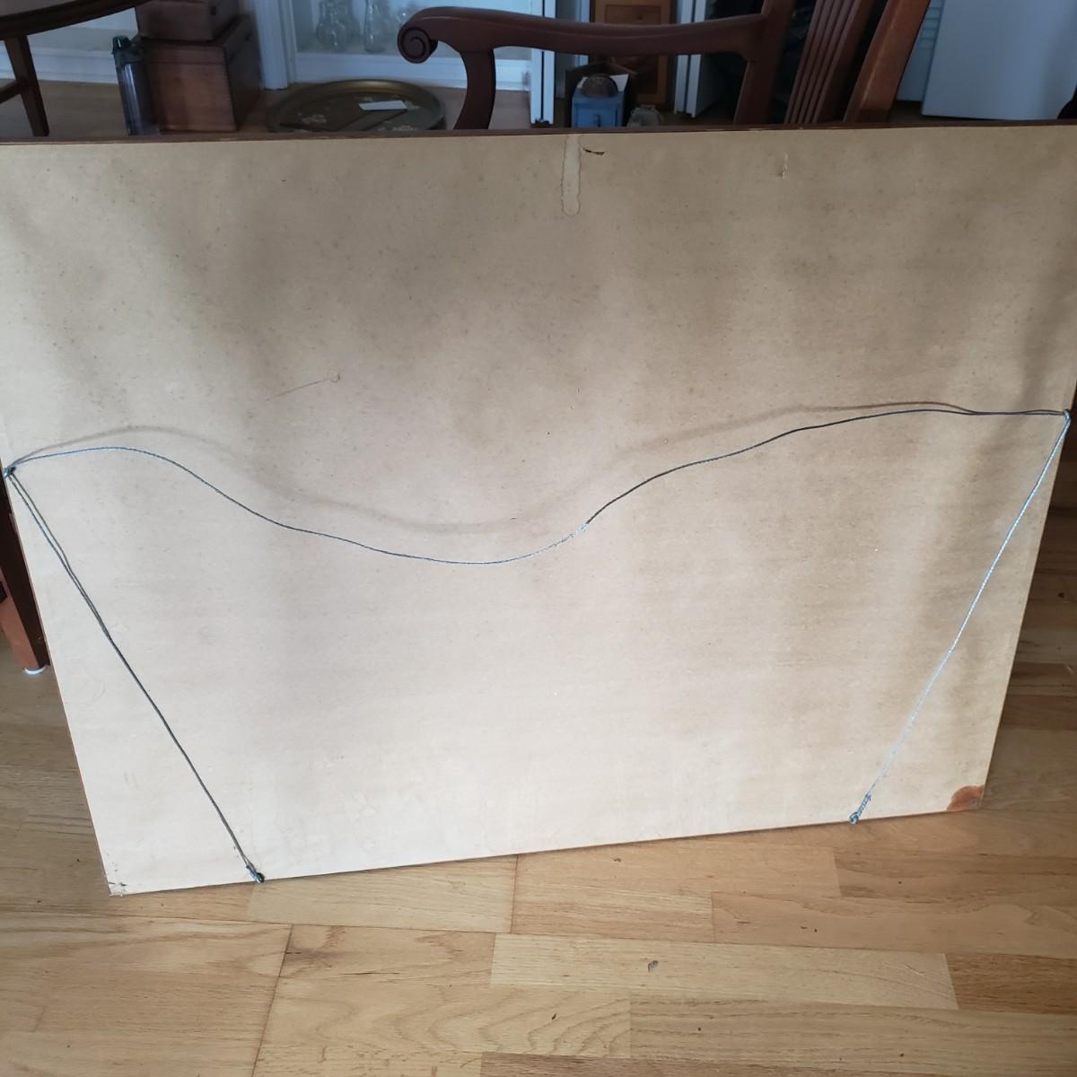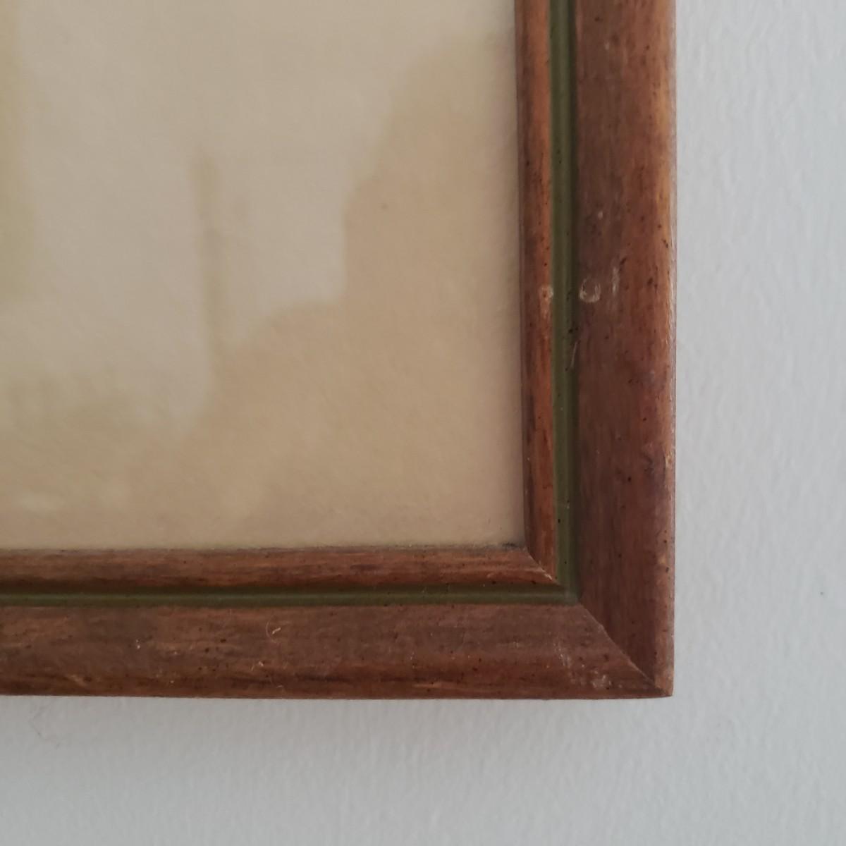 This signed watercolor is by artist M. R. Haywood. The wooden frame covered with glass measures 37" x 29". The painting is matted and has a wire assembly in the back for hanging.