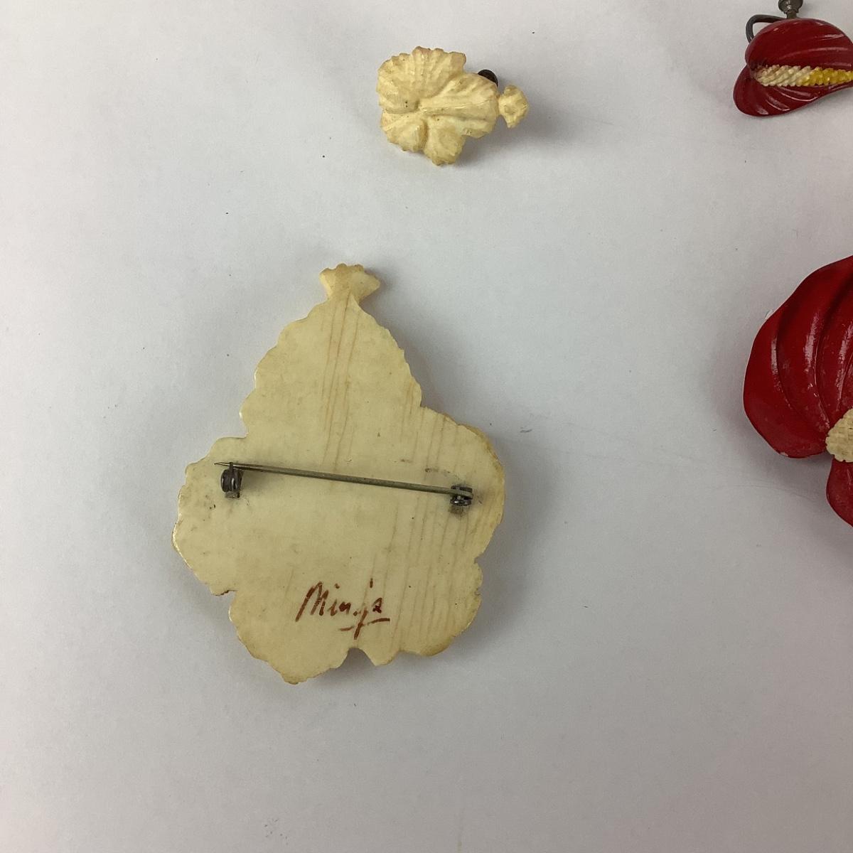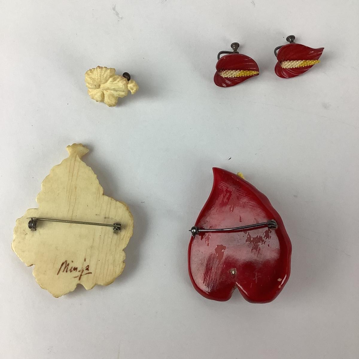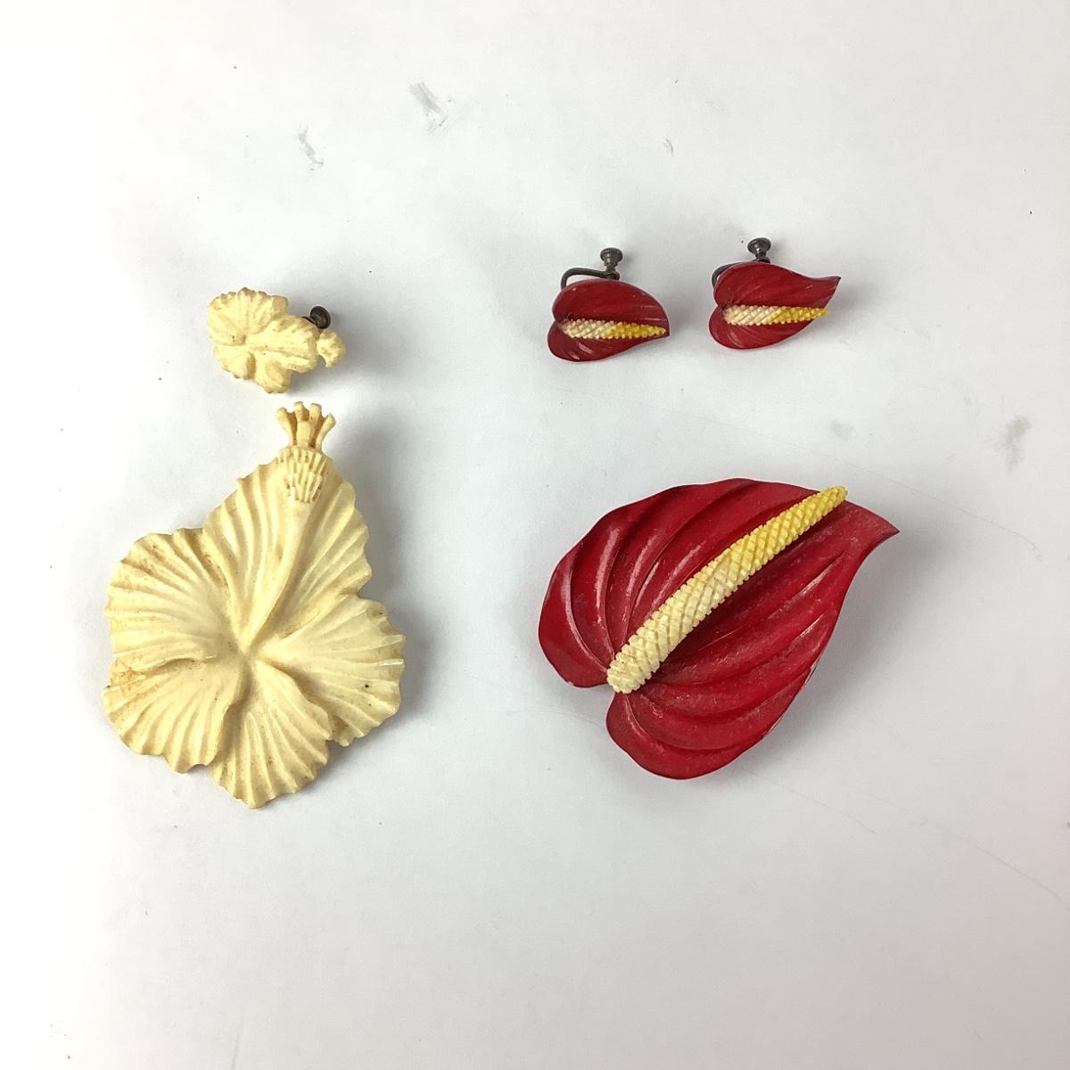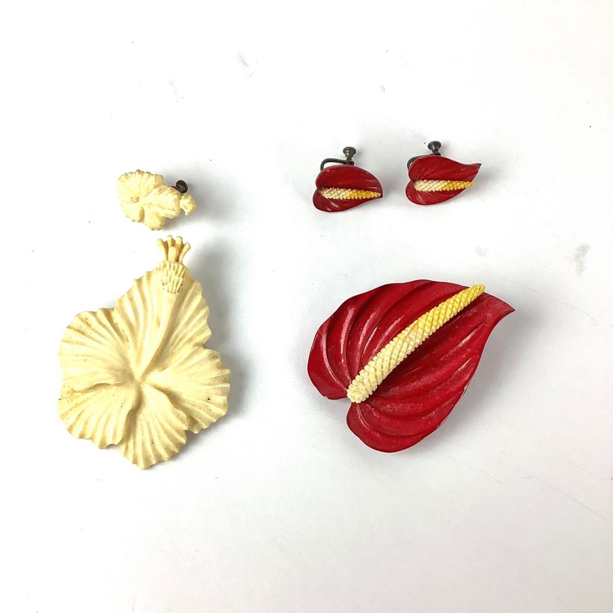 M1055 Vintage MING'S Hawaiian Ivory Carved Hibiscus & Anthurium Pin Earring Sets